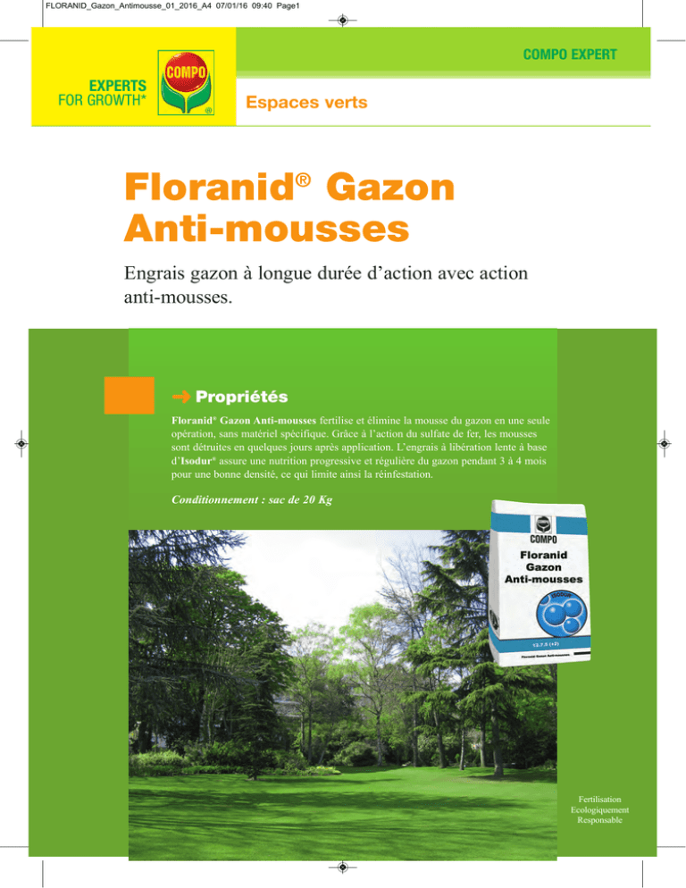 FLORANID_Gazon_Antimousse_01_2016_A4 07/01/16 09:40 Page1 COMPO EXPERT EXPERTS FOR GROWTH* Espaces verts ® Floranid Gazon Anti-mousses Engrais gazon à longue durée d’action avec action anti-mousses. ➜ Propriétés Floranid® Gazon Anti-mousses fertilise et élimine la mousse du gazon en une seule opération, sans matériel spécifique. Grâce à l’action du sulfate de fer, les mousses sont détruites en quelques jours après application. L’engrais à libération lente à base d’Isodur® assure une nutrition progressive et régulière du gazon pendant 3 à 4 mois pour une bonne densité, ce qui limite ainsi la réinfestation. Conditionnement : sac de 20 Kg Fertilisation Ecologiquement Responsable FLORANID_Gazon_Antimousse_01_2016_A4 07/01/16 09:40 Page2 COMPO EXPERT ➜ Mode de fonctionnement ➜ Domaine d’application et Floranid® Gazon Anti-mousses est l’engrais requis pour nourrir progressivement le gazon et détruire les mousses du gazon en une seule opération. doses d’emploi Après épandage de l’engrais, le granulé fond et libère l’Isodur® qui s’intègre dans le cycle naturel de l’azote. De plus, le sulfate de fer intégré dans l’engrais va agir par contact sur les mousses et provoquer leur dépérissement en quelques jours. ➜ Précautions d’emploi • Epandre Floranid® Gazon Anti-mousses 3 à 6 jours après la dernière tonte, de préférence sur un sol humide. Attendre 3 jours avant la tonte suivante. Faire suivre d’un arrosage dans les 24 heures ou appliquer au moment d’une pluie. • N’utiliser que sur gazons établis (de plus de 6 mois). • Ne pas appliquer en cas de vent, en période de gel, de forte chaleur ou de sécheresse. • Ne pas appliquer à proximité des dallages, bordures en pierre, allées bétonnées, terrasses (risque de taches de rouilles). Qualité et performance • L’Isodur® assure une nutrition progressive et régulière du gazon pendant 3 à 4 mois. Il permet au gazon de se densifier et ainsi de coloniser les espaces laissés vacants par la mousse dépérie. Cette action est complétée par le phosphore (enracinement), la potasse (résistance) et le magnésium (couleur) contenus dans Floranid® Gazon Anti-mousses. • Le sulfate de fer agit de manière spécifique sur les mousses. Il est aussi à l'origine du reverdissement du gazon en activant la photosynthèse. • Floranid® Gazon Anti-mousses est le seul engrais à libération lente homologué et autorisé pour éliminer les mousses dans les gazons. ➜ Un plus pour l’environnement • Fertilisant le gazon et détruisant les mousses en une seule opération, Floranid® Gazon Anti-mousses permet de réduire le nombre d’interventions dans l’année (moins de gaz à effet de serre émis). • Le mode d’action de l’Isodur® contenu dans Floranid® Gazon Anti-mousses permet de réduire les pertes par lessivage (moins de 0,5%) et les pertes par volatilisation dans l’air (moins de 1%). Il augmente la capacité du gazon à capter le CO2 atmosphérique. • Pour ces deux raisons, Floranid® Gazon Anti-mousses peut s’inscrire dans une démarche Agenda 21 des collectivités COMPO EXPERT France S.A.S 49, avenue Georges Pompidou 92593 Levallois-Perret Cedex Tél. : 01 49 64 59 78 - Fax : 01 49 64 59 90 www.compo-expert.fr Dose d’emploi : 30 g/m² = 300 kg/ha, soit 1 sac pour 670 m² imprimé sur papier recyclé ➜ Epoque d’application De préférence par temps « poussant » (entre 12°C et 25°C) au printemps et à l’automne. Utiliser uniquement de mars à juin, et en septembre-octobre. Nos fiches de données de sécurité sont disponibles sur : www.quickfds.com ➜ Composition Engrais NPK contenant de l’isobutylidène diurée 12 % d’azote (N), dont 5,4 azote ammoniacal 3,5 azote uréique 3,1 azote de l’isobutylidène diurée action lente - 0,08 soluble à 20°C - 2,99 insoluble à 20 mais soluble à 100°C - 0,03 insoluble 100°C 7% anhydride phosphorique (P2O5) dont 5 soluble dans l’eau 5 % d’oxyde de potassium (K2O) soluble dans l’eau 2% d’oxyde de magnésium (MgO) soluble dans l’eau 34 % d’anhydride sulfurique (SO3) dont 32,5 soluble dans l’eau 8,8% de fer (Fe) Nom homologué : Eradikamousse® F+ Usage et dose autorisés : gazons de graminées – destruction des mousses : 30 g/m² Maximum 2 applications par an sur la même zone. AMM n° 2130125 (détenue par COMPO France). Emploi Autorisé dans les Jardins. Sans classement. ZNT : 5 mètres Engrais pauvre en chlore. NB : nous rappelons que toute utilisation pour un usage non autorisé à la vente et non conforme à nos préconisations est interdite. IMPORTANT Respectez les usages, doses, conditions et précautions d'emploi mentionnés sur l'emballage qui ont été déterminés en fonction des caractéristiques du produit et des applications pour lesquelles il est préconisé. Le fabricant garantit la qualité de ses produits vendus dans leur emballage d'origine. COMPO EXPERT France ne saurait être en aucun cas tenu pour responsable des conséquences inhérentes à toute copie de cette notice technique, totale ou partielle, et la diffusion ou l’utilisation non autorisée de cette dernière. CIP16345 - 01/2016 * Experts pour la croissance ➜ • Floranid® Gazon Anti-mousses s’adresse aux gazons d’agrément, plaines de jeux, paysagistes pour les jardins des particuliers, départs et fairways de golfs, hippodromes. Il s’épand soit à la main pour les petites surfaces (port de gants en nitrile conseillé), soit à l’épandeur.