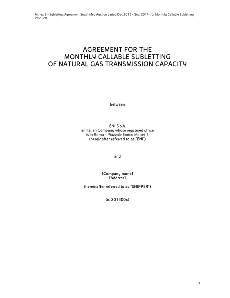 Annex 2 – Subletting Agreement South Med Auction period Dec.2013 – Sep. 2014 (for Monthly Callable Subletting Product) AGREEMENT FOR THE MONTHLY CALLABLE SUBLETTING OF NATURAL GAS TRANSMISSION CAPACITY between ENI S.p.A. an Italian Company whose registered office is in Roma - Piazzale Enrico Mattei, 1 (hereinafter referred to as "ENI") and [Company name] [Address] (hereinafter referred to as "SHIPPER”) [n. 201300x] 1 Annex 2 – Subletting Agreement South Med Auction period Dec.2013 – Sep. 2014 (for Monthly Callable Subletting Product) CONTENTS Whereas Art. 1 Definitions Art. 2 Object of the Contract Art. 3 Subletting Obligations and Overrun Art. 4 Quantities Art. 5 Determination of the Quantities Art. 6 Quality and pressure of Gas Art. 7 Term of the Contract Art. 8 Interruption and/or Reduction of Subletting Service Art. 9 Upfront Fee and monthly subletting Fee Art. 10 Invoicing and Payment Art. 11 Measurement Art. 12 Programs Art. 13 Taxes and Duties Art. 14 Liability Art. 15 Force Majeure Art. 16 Bank Guarantee Art. 17 Governing law and litigation Art. 18 Amendments Art. 19 Notices Art. 20 Confidentiality Art. 21 Administrative Responsibility Art. 22 Assignment Annex A: Quality and pressure specification at the Intake Point Annex B: Quality and pressure specification at the Offtake Point Annex C: Contact Information Annex D: Form of the Bank Guarantee Annex E Activation Form of the Subletting Service for the Elected Month Annex F: Relevant Data Annex G:Procédure de Partage 2 Annex 2 – Subletting Agreement South Med Auction period Dec.2013 – Sep. 2014 (for Monthly Callable Subletting Product) Whereas: 1. The SHIPPER may have Natural Gas available at the Intake Point and in such case intends to have this Gas transported through the South Med Pipeline System ; 2. ENI has committed transmission capacities on the South Med Pipeline System and it has offered part of it in the Auction Procedure with a product whereby, upon the upfront payment of a fee, the SHIPPER acquires the right of activating its awarded capacity and pay the relevant subletting fee only in selected month(s); 3. The SHIPPER has been assigned part of said ENI’s committed transmission capacities in the Auction Procedure and has also accepted that ENI will transfer to it (or to any other subject indicated by it) in the month(s) when it will activate the subletting service a corresponding quantity of Snam Rete Gas’s entry capacity at Mazara del Vallo; 4. The Parties intend to set forth the basic terms and conditions for i) the use of the transmission capacity sublet by ENI to the SHIPPER in order to have SHIPPER’s Natural Gas quantities transmitted from the Intake Point to the Offtake Point and ii) for the transfer of rights and obligations of Snam Rete Gas’s entry capacity at Mazara del Vallo. Now, therefore, it is agreed by the Parties hereto as follows: Article 1 Definitions The following words and terms, when used in this Contract, shall have the meaning as follows: Acheteur shall have the meaning defined in Article 1 of Annex G (Procédure de Partage). Auction Procedure shall mean the Auction Procedure South Med. Auction period Dec.2013 – Sep.2014 (for Monthly Callable Subletting Product) published on ENI web site on 14/10/2013. Bar shall mean a pressure of 100.000 Pa. Bid Bond shall mean the security provided by the SHIPPER, as set forth in Article 5 of the Auction Procedure. BTU shall mean British Thermal Unit equivalent to 1055,06 Joule(s). Business Day shall mean any day, but not a Saturday, Sunday or a holiday in Italy. Contract shall mean this agreement, including the Preamble and Annexes A, B, C, D, E, F and G which constitute an integral part of it. Contractual cubic meter (Cm3) or Ccm shall mean the quantity of natural gas which, when absolutely dry, at a temperature of 15° C and at an absolute pressure of 1 Bar, occupies the volume of one cubic meter. Day shall mean the period of twenty-four consecutive hours beginning at 08:00 a.m. (Greenwich meridian) on each calendar day and ending at 08:00 a.m. (Greenwich meridian) on the following calendar day. Downstream Shipper code shall mean the code to which Natural Gas is re-delivered, from an operational point of view, at Mazara del Vallo. Elected Month shall mean any Month that is comprised within the period from the Start-Up Date and throughout the term of this Contract, when the Subletting Service is activated by the SHIPPER according to the terms and conditions set forth in Article 3.6. Existing Procédure de Partage shall mean the ”Procédure de Partage du gaz sur Gazoduc Transtunisien”, contracted by the Tunisian State , TTPC and the users of the TTPC Pipeline System (including Eni) on 24th September 2008, as amended from time to time. 3 Annex 2 – Subletting Agreement South Med Auction period Dec.2013 – Sep. 2014 (for Monthly Callable Subletting Product) Fee shall mean the fee as referred to in Article 9.2. Fuel Gas shall mean the SHIPPER’s quota, as set forth in Article 5, of the quantities of Natural Gas consumed by the compressor stations of the TTPC Pipeline System. Gross Calorific Value (GCV) shall mean the quantity of heat expressed in MJ produced by the complete combustion of one Standard Cubic Meter (Sm3) of Natural Gas at a temperature of fifteen degree Celsius and at an absolute pressure of 1,01325 Bar with excess air at the same temperature and pressure as the natural Gas when the products of combustion are cooled to the initial temperature of the Gas and when the water formed by the combustion is condensed to the liquid state to the initial temperature of Gas. Intake Point shall mean the Entry Oued Saf-Saf. Entry Oued Saf–Saf shall mean the entry point into the TTPC Pipeline System on the Algerian/Tunisian border in the area of Oued Saf-Saf. Joule (J) shall mean the quantity of heat as defined in ISO 1000 S.I. units and recommendations for the use of their multiples and of certain other correlated units. Manuale 