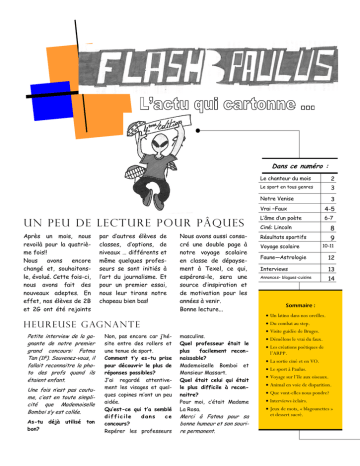 Dans ce numéro : Un pe u de lecture p our P âques Après un mois, nous revoilà pour la quatrième fois!! Nous avons encore changé et, souhaitonsle, évolué. Cette fois-ci, nous avons fait des nouveaux adeptes. En effet, nos élèves de 2B et 2G ont été rejoints par d’autres élèves de classes, d’options, de niveaux … différents et même quelques professeurs se sont initiés à l’art du journalisme. Et pour un premier essai, nous leur tirons notre chapeau bien bas! Nous avons aussi consacré une double page à notre voyage scolaire en classe de dépaysement à Texel, ce qui, espérons-le, sera une source d’inspiration et de motivation pour les années à venir. Bonne lecture... Une fois n’est pas coutume, c’est en toute simplicité que Mademoiselle Bomboi s’y est collée. As-tu bon? déjà utilisé ton Non, pas encore car j’hésite entre des rollers et une tenue de sport. Comment t’y es-tu prise pour découvrir le plus de réponses possibles? J’ai regardé attentivement les visages et quelques copines m’ont un peu aidée. Qu’est-ce qui t’a semblé difficile dans ce concours? Repérer les professeurs 2 Le sport en tous genres 3 Notre Venise 3 Vrai –Faux 4-5 L’âme d’un poète 6-7 Ciné: Lincoln 8 Résultats sportifs Voyage scolaire 9 10-11 Faune—Astrologie 12 Interviews 13 Annonces– blagues-cuisine 14 Sommaire : Un latino dans nos oreilles. Du combat au step. H e u r e u s e g ag n a n t e Petite interview de la gagnante de notre premier grand concours: Fatma Tan (1F). Souvenez-vous, il fallait reconnaitre la photo des profs quand ils étaient enfant. Le chanteur du mois masculins. Quel professeur était le plus facilement reconnaissable? Mademoiselle Bomboi et Monsieur Massart. Quel était celui qui était le plus difficile à reconnaitre? Pour moi, c’était Madame La Rosa. Merci à Fatma pour sa bonne humeur et son sourire permanent. Visite guidée de Bruges. Démêlons le vrai du faux. Les créations poétiques de l’ARPP. La sortie ciné et en VO. Le sport à Paulus. Voyage sur l’île aux oiseaux. Animal en voie de disparition. Que vont-elles nous pondre? Interviews éclairs. Jeux de mots, « blagounettes » et dessert sucré. PAGE 2 PAGE STAR Le chanteur du mois: Par Anais et Madyson Cette fois-ci, on a choisi un « chanteur » pour faire plaisir à Madame De Muyt… Comme on dit: chacun ses goûts!!! Enrique Miguel Iglesias Preysler est le troisième fils du célèbre (pour nos arrière-grands-parents) Julio Iglesias. Il est né le 8 mai 1975 à Madrid et est auteur-compositeur et interprète. Ce jeune homme a débuté sa carrière au Mexique pour devenir ensuite un des artistes les plus célèbres en Amérique latine à la fin des années 1990: il signe un contrat pour plusieurs albums en anglais mais aussi en espagnol. C’est un artiste assez rentable puisqu’il a vendu plus de 60 millions d’albums à travers le monde, il a classé deux titres en numéro 1 au Billboard Hot 100 (classement des meilleurs titres de l’industrie du disque) et surtout détient le record de 8 titres placés numéro 1 au classement des singles en langue espagnole: le Billboard Hot Latin Tracks. Il a vendu plus de 40 millions de singles à tra Pe t i t K A R AO K E : vers le monde et plus de 12 millions d'albums seulement aux États-Unis. En juillet 1995, le fils à papa sort son premier album « Enrique Iglesias » (vendu à un demi million d’exemplaires), enchaine en 97 avec « Vivir » (« Vivre »), en 98, sort « Cosas del amor » (« Les choses de l’amour ») dont deux titres seront numéros 1 et entame une tournée mondiale de 80 dates pour promouvoir ce troisième album. ses, a fait des concerts avec Jennifer Lopez et a même été l’un des trois parrains de la Star Ac’ française 2013. Beaucoup de ses derniers albums sont en anglais et en espagnol et parfois même avec quelques titres en français. Coté cœur, il est casé depuis 2001 avec la tenniswoman russe Anna Kournikova (elle est même apparue dans le clip d'Escape). Des rumeurs de mariage avaient circulé en 2003 et à nouveau en 2005 mais il a déclaré en septembre 2011 qu'il ne comptait pas se marier: le mariage ne changeant, selon lui, rien à sa relation. En revanche, Anna déclare vouloir des enfants. Depuis, il a chanté avec Whitney Houston, Pitbull, Nicole Scherzinger des Pussycat Dolls, Ciara, la Française Nâdiya , Usher, Lil Wane…, a fait quelques apparitions dans des séries télévisées comme: How I Met Your Mother ou encore Two and a Half Men, a obtenu plusieurs récompen- Tired Of Being Sorry (La isse le des t in l’em por ter) (en duo avec Nâdiya) Pour ceux qui ont le rythme dans la peau et qui ont envie de chanter. I don't know why You want to follow me tonight When in the rest of the world With you whom I've crossed and I've quarreled Laisse-toi tomber Pour mieux renaître et être aimé Tu cherches l'histoire à sauver Sans plus chercher à t'excuser Beneath the silver moon Maybe you were right But baby I was lonely Quand ton coeur éclate Laisse le destin l'emporter I'm standing in the street Crying out for you A toi d'exister Seul face à la nuit Ose le meilleur Et lève-toi sans avoir peur We're all bloodless and blind And longing for a life So far away A tout jamais I've trashed myself I've lost my way I've got to get to you Je serai là pour nous Beyond the silver moon Maybe you were right But baby I was lonely Quand ton coeur éclate Laisse le destin l'emporter Maybe you were right But baby I was lonely Quand ton coeur éclate Laisse le destin l'emporter I'm standing in the street Crying out for you A toi d'exister Seul face à la nuit PAGE 3 Tous les coups sont permis L'UFC ( Ultimate Fighting Championship ) est une organisation américaine de mixed martials arts ( MMA). Les anciens termes de Free Par Miguel et Younes fight ou combat libre n'étant plus utilisés. de mettre en place des règles de bases. L’UFC est actuellement reconnu comme 