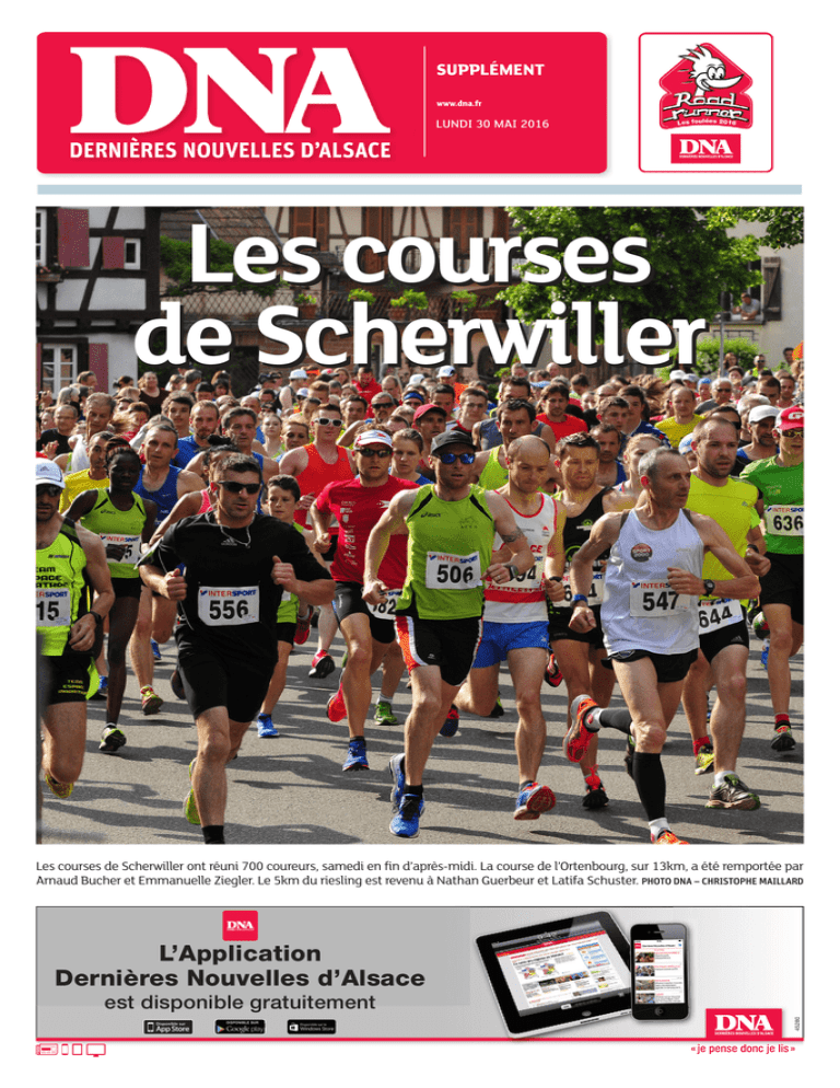 SUPPLÉMENT www.dna.fr LUNDI 30 MAI 2016 Les courses de Scherwiller Les courses de Scherwiller ont réuni 700 coureurs, samedi en fin d’après-midi. La course de l’Ortenbourg, sur 13km, a été remportée par Arnaud Bucher et Emmanuelle Ziegler. Le 5km du riesling est revenu à Nathan Guerbeur et Latifa Schuster. PHOTO DNA – CHRISTOPHE MAILLARD L’Application Dernières Nouvelles d’Alsace 45280 est disponible gratuitement LES COURSES DE SCHERWILLER 2 Q LUNDI 30 MAI 2016 Les habitués répondent présent Cette année, les courses de Scherwiller ont rassemblé 701 coureurs, dont 604 adultes qui ont participé soit au parcours de 5 km dans les rues de la commune, soit au circuit de l’Ortenbourg, de 13,6 km (300 m D+). Sur ce dernier, l’habitué Arnaud Bucher remporte un nouveau titre, avec un chrono de 49’33’’. L’Otenbourg au féminin à Emmanuelle Ziegler. PHOTO DNA CHRISTOPHE MAILLARD S amedi en fin de journée à Scherwiller, si les coureurs du 5 km ont plutôt souffert de la chaleur et du temps très orageux, les sportifs qui se sont lancés près de 1h15 après, dans les 13,6 km (300m D+) du circuit de l’Ortenbourg ont été un peu plus ménagés grâce au vent et au rafraîchissement ambiant. Dans tous les cas, pas de réel suspense lors de la plus grande course, qu’il s’agisse du premier masculin ou de la première féminine. Chez les hommes donc, c’est Arnaud Bucher, l’habitué des lieux, qui triomphe une nouvelle fois après 49’33’’ de course. « J’avais l’idée de monter doucement, car la course commence vraiment là-haut» Le coureur de l’ASL Roberstau s’est démarqué dès la sortie de Scherwiller et est resté en tête tout du long. « J’ai couru à mon rythme, raconte-t-il. Dans la descente au 9e km, j’ai voulu continuer mon effort pour tenter de battre mon record de 2007 de 48’04’’, mais je me suis un peu tordu la cheville. Ça m’a fait peur pour la suite et je Les résultats 13,6 KM 1) Bucher A. (Asl Robertsau) 49:33, 2) Cligny B. (Ac Centre Alsace) 51:28, 3) Mann J. (Colmar Marathon Club) 53:51, 4) Fritsch X. (Asc Strasbourg) 54:11, 5) Guntz C. (Ac Centre Alsace) 54:39, 6) Lorentz M. (Aere Erstein) 55:05, 7) Martinez Verger R. (France) 55:32, 8) Blaise L. (France) 55:49, 9) Comau O. (Dieffenbach Au Val) 56:14, 10) Dillenseger V. (Altitude Santé) 56:34, 11) Schuh D. (France) 57:02, 12) Colin H. (Ibal/S2a) 57:30, 13) Andrades M. (Colmar Mc) 57:37, 14) Ambos L. (As Lilly) 58:09, 15) Wirtz E. (France) 58:09, 16) Lang M. (France) 58:14, 17) Garcia R. (Eurocorps) 58:46, 18) Engel D. (Association Trail Du Haut Koenigsbourg) 59:04, 19) Chompret F. (Dz Aluminium) 59:07, 20) Grebert C. (Team Kolyma) 59:08, 21) Derrindinger A. (Rame) 59:09, 22) Bernard P. (Poutay) 59:10, 23) Baumert M. (Acv) 59:18, 24) Georges E. (Eckbo Team) 59:23, 25) Vaudin O. (France) 59:24, 26) Geiger R. (Albé) 59:26, 27) Heldt I. (Asptt Strasbourg Triathlon) 59:32, 28) Ziegler E. (Ac Centre Alsace) 59:36, 29) Bernhard M. (Huttenheim) 59:54, 30) Koehl S. (Sélestat) 1:00:01, 31) Kanoute K. (Csa) 1:00:02, 32) Fischer F. (France) 1:00:17, 33) Reibel T. (Asc Strasbourg) 1:00:34, 34) Fischer M. (France) 1:00:54, 35) Weber T. (Runing Team Schweisghouse) 1:01:02, 36) Hecklen N. (Intersport) 1:01:03, 37) Eck S. (Matrat Training) 1:01:07, 38) Borzig Y. (France) 1:01:29, 39) Morian D. (Olicoaching) 1:01:48, 40) Froehlich H. (Asptt Strasbourg) 1:01:54, 41) Ackermann O. (Chatenois) 1:01:57, 42) Lienhart J. (France) 1:02:19, 43) Renard F. (France) 1:02:32, 44) Stehly J. (A.S.L. La Robertsau) 1:02:37, 45) Caubere T. (Asc Strasbourg) 1:02:45, 46) Makridis G. (S.R. Obernai) 1:02:57, 47) Vogel T. (Heidolsheim) 1:03:01, 48) Marchal J. (France) 1:03:05, 49) Douté G. (Val Trotteurs) 1:03:13, 50) Meyer L. (Ac Centre Alsace) 1:03:28, 51) Schwander J. (Ac Centre Alsace) 1:03:36, 52) Heisser E. (S2a-Ibal) 1:03:38, 53) Betty E. (Sp Dieffenthal) 1:03:50, 54) Toscano F. (France) 1:03:52, 55) Hypolyte me suis calmé pour gérer jusqu’à la fin. » Chez les féminines, c’est Emmanuelle Ziegler, de l’AC Centre Alsace, qui termine à la première place avec un temps de 59’36’’. Pourtant derrière Hélène Froehlich au début de la course, elle parvient à rattraper la triathlète en haut de la montée. « J’avais l’idée de monter doucement, car la course commence vraiment là-haut, explique la championne. J’ai donc suivi Hélène pendant un moment et une fois en haut, j’ai pu faire la différence grâce au travail de mon entraîneur Emmanuel Stiegel. » « Une fois devant, j’ai tenu mon rythme. Je ne savais pas vraiment où elle était !, ajoute-t-elle. En tout cas, je crois que j’ai très bien couru. J’ai dépassé pas mal de beau monde, même des garçons ! » Dès la sortie de Scherwiller, Arnaud Bucher a pris la tête du 13,6 km, position qu’il n’a plus quittée jusqu’à la ligne d’arrivée. PHOTO DNA – CHRISTOPHE MAILLARD différence, même si le deuxième s’est bien accroché et m’a donné du fil à retordre. » Du côté des féminines, c’est Latifa Schuster (ASLR) qui monte sur la première marche avec un temps de 17’46’’. « Ce n’est pas mon meilleur temps, mais c’est quand même pas mal, déclare la gagnante à l’arrivée. Je suis partie assez vite et j’ai maintenu le rythme. Comme je sais que je peux tenir, j’y vais et ça a payé ! » P.L. R Très chaud, trop chaud pour le 5 km La course qui a précédé le circuit de l’Ortenbourg, c’est-à-dire les 5 km dans les rues de Scherwiller, a fait souffrir les corps à cause d’une atmosphère étouffante et orageuse. Dans ces conditions, le premier à franchir la ligne d’arrivée, Nathan Guerbeur (15’20’’), explique : « La température n’aide pas, c’est la première difficulté ! Malgré ça, j’ai fait le rythme sur toute la course et c’est aux 3,5 km que j’ai fait la Le triathlète Nathan Guerbeur s’offre le 5km du riesling. Une de plus pour L