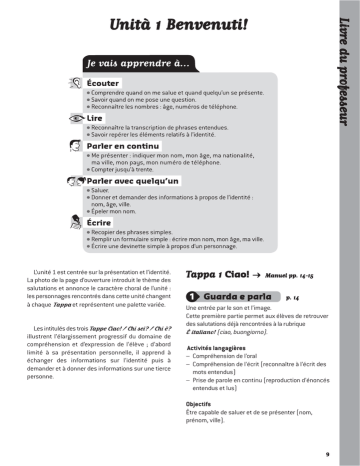 Livre du professeur Unità 1 Benvenuti! L’unité 1 est centrée sur la présentation et l’identité. La photo de la page d’ouverture introduit le thème des salutations et annonce le caractère choral de l’unité : les personnages rencontrés dans cette unité changent à chaque Tappa et représentent une palette variée. Les intitulés des trois Tappe Ciao! / Chi sei? / Chi è? illustrent l’élargissement progressif du domaine de compréhension et d’expression de l’élève ; d’abord limité à sa présentation personnelle, il apprend à échanger des informations sur l’identité puis à demander et à donner des informations sur une tierce personne. Tappa 1 Ciao! c 1 Manuel pp. 14-15 Guarda e parla p. 14 Une entrée par le son et l’image. Cette première partie permet aux élèves de retrouver des salutations déjà rencontrées à la rubrique È italiano! (ciao, buongiorno). Activités langagières – Compréhension de l’oral – Compréhension de l’écrit (reconnaître à l’écrit des mots entendus) – Prise de parole en continu (reproduction d’énoncés entendus et lus) Objectifs Être capable de saluer et de se présenter (nom, prénom, ville). 9 Mise en œuvre en classe • 1 On entre par l’audio afin de fournir un modèle sonore à l’élève ; on commence par une écoute livres fermés, les élèves devant repérer une façon de saluer. Script 1. Ciao, sono Sara Marini, di Milano! 2. Salve, sono Marco Rossi di Roma! 3. Buongiorno, sono il signor Dino Marini di Milano. Sono il papà di Sara. Énoncé attendu Ciao (déjà rencontré) Certains élèves repéreront sans doute l’une des deux autres salutations voire les deux. 2 Ascolta e parla p. 14 Une entrée par l’écoute. La deuxième activité est un élargissement de l’activité 1 : la présentation s’étend au pays d’origine et à la nationalité. Activités langagières – Compréhension de l’oral – Prise de parole en continu Objectifs linguistiques – Structures : abito, sono nato/a a... / in... – Grammaire : masculin-féminin – Vocabulaire : noms de pays et nationalités – Phonologie : voyelles, accent tonique • 2 Les élèves regardent les images et écoutent l’enregistrement. Ils doivent identifier tous les mots utilisés pour saluer. Objectif socio-linguistique Modulation des salutations : différence de valeur ciao – salve / buongiorno • 3 Parmi ces trois mots, ils doivent retrouver le mot que l’on utilise également en français (ciao) et indiquer sa valeur d’emploi en français. Objectif culturel Découverte de personnages de fiction connus et appréciés des jeunes italiens et d’un explorateur présent dans leurs livres d’histoire. Ces personnages dont chacun renvoie à un pays font partie de l’univers des jeunes italiens ; tout comme des personnages italiens font partie de celui de nos élèves. • 4 Les élèves complètent la présentation des trois personnages à l’aide des informations données par les légendes. Il s’agit en fait d’intégrer à chaque fois l’élément manquant pour obtenir une présentation comportant prénom, nom, ville d’origine. L’énoncé est complété dans le cahier d’activités (p. 4). Il constitue la première trace écrite. Énoncés attendus et corrigés du cahier d’activités Salve, sono Marco Rossi, di Roma. Ciao, sono Sara Marini di Milano. Buongiorno, sono il Signor Dino Marini di Milano. Sono il papà di Sara. Remarques • 1 On fera autant d’écoutes que nécessaire pour créer un climat de confiance et permettre l’appropriation hors de toute notion de difficulté. • 2 Les élèves découvrent par inférence le sens de nome, cognome, città. • 3 On peut éventuellement aller plus loin et faire une répétition chorale de ces phrases de présentation. On peut demander ensuite aux élèves de choisir une salutation et de se présenter sur ce modèle. Cet énoncé pourra ensuite être transcrit. Énoncé attendu Ciao / salve / buongiorno, sono Mathieu Durand di Lille / Nizza / Parigi / Rennes... 10 Mise en œuvre en classe Cette activité se fait texte caché ou livre fermé. • 1 Inviter les élèves à observer l’illustration (pantin Pinocchio déjà rencontré) et leur demander de faire parler Pinocchio pour se présenter. • 2 Écrire au tableau la liste des six personnages, proposée dans le manuel ou, si possible, afficher les images représentant les personnages avec leur nom. Si la salle d’italien est équipée, les projeter avec un rétroprojecteur ou utiliser le tableau interactif. • 3 Indiquer la consigne 1, puis effectuer une première écoute globale pour que les élèves aient une vision d’ensemble du document sonore. • 4 2e écoute : après chaque présentation d’un personnage, arrêt et mise en commun. Si les élèves ne peuvent identifier le personnage, les rassurer et passer au suivant. Lorsqu’un personnage est identifié, faire réécouter et indiquer le ou les indices qui ont guidé les élèves. Inscrire les mots au tableau à côté du nom du personnage. Énoncés attendus Il barone e Vasco da Gama Buongiorno • 6 Consigne 3 et nouvelle écoute globale. Dans le cahier d’activités (p. 4), les élèves relient le nom de chaque personnage à son pays d’origine et à sa nationalité. Corrigés du cahier d’activités Asterix: Francia / francese Barone di Munchausen: Germania / tedesco Harry Potter: Inghilterra / inglese Mafalda: Argentina / argentina Pinocchio: Italia / italiano Vasco da Gama: Portogallo / portoghese Remarques • 1 Il faudra autant d’écoutes que nécessaire pour arriver à identifier les 6 personnages. • 2 L’objectif est d’entraîner l’élève à repérer les éléments relatifs à l’identité. On s’en tiendra donc à ces éléments. On élucidera ragazzo, bambina et esploratore, sono nato, abito mais on laissera de côté ho un’amica qui sera vu plus tard et maga qui restera en reconnaissance. Prolongements •