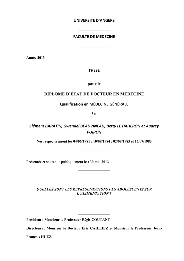 UNIVERSITE D’ANGERS FACULTE DE MEDECINE Année 2013 THESE pour le DIPLOME D’ETAT DE DOCTEUR EN MEDECINE Qualification en MÉDECINE GÉNÉRALE Par Clément BARATIN, Gwenaël BEAUVINEAU, Betty LE DAHERON et Audrey POIRON Nés respectivement les 04/06/1981 ; 10/08/1984 ; 02/08/1985 et 17/07/1983 Présentée et soutenue publiquement le : 30 mai 2013 QUELLES SONT LES REPRESENTATIONS DES ADOLESCENTS SUR L’ALIMENTATION ? Président : Monsieur le Professeur Régis COUTANT Directeurs : Monsieur le Docteur Eric CAILLIEZ et Monsieur le Professeur JeanFrançois HUEZ UNIVERSITE D’ANGERS FACULTE DE MEDECINE Année 2013 THESE pour le DIPLOME D’ETAT DE DOCTEUR EN MEDECINE Qualification en MÉDECINE GÉNÉRALE Par Clément BARATIN, Gwenaël BEAUVINEAU, Betty LE DAHERON et Audrey POIRON Nés respectivement les 04/06/1981 ; 10/08/1984 ; 02/08/1985 et 17/07/1983 Présentée et soutenue publiquement le : 30 mai 2013 QUELLES SONT LES REPRESENTATIONS DES ADOLESCENTS SUR L’ALIMENTATION ? Président : Monsieur le Professeur Régis COUTANT Directeurs : Monsieur le Docteur Eric CAILLIEZ et Monsieur le Professeur Jean-François HUEZ 1 LISTE DES ENSEIGNANTS DE LA FACULTÉ DE MÉDECINE D’ANGERS Doyen Vice doyen recherche Vice doyen pédagogie Pr. RICHARD Pr. BAUFRETON Pr. COUTANT Doyens Honoraires : Pr. BIGORGNE, Pr. EMILE, Pr. REBEL, Pr. RENIER, Pr. SAINT-ANDRÉ Professeur Émérite : Pr. Gilles GUY, Pr. Jean-Pierre ARNAUD Professeurs Honoraires : Pr. ACHARD, Pr. ALLAIN, Pr. ALQUIER, Pr. BASLÉ, Pr. BIGORGNE, Pr. BOASSON, Pr. BOYER, Pr. BREGEON, Pr. CARBONNELLE, Pr. CARON-POITREAU, Pr. M. CAVELLAT, Pr. COUPRIS, Pr. DAUVER, Pr. DELHUMEAU, Pr. DENIS, Pr. DUBIN, Pr. EMILE, Pr. FOURNIÉ, Pr. FRANÇOIS, Pr. FRESSINAUD, Pr. GESLIN, Pr. GROSIEUX, Pr. GUY, Pr. HUREZ, Pr. JALLET, Pr. LARGET-PIET, Pr. LARRA, Pr. LIMAL, Pr. MARCAIS, Pr. PARÉ, Pr. PENNEAU, Pr. PIDHORZ, Pr. POUPLARD, Pr. RACINEUX, Pr. REBEL, Pr. RENIER, Pr. RONCERAY, Pr. SIMARD, Pr. SORET, Pr. TADEI, Pr. TRUELLE, Pr. TUCHAIS, Pr. WARTEL PROFESSEURS DES UNIVERSITÉS MM. ABRAHAM Pierre Physiologie ASFAR Pierre Réanimation médicale AUBÉ Christophe Radiologie et imagerie médicale AUDRAN Maurice Rhumatologie AZZOUZI Abdel-Rahmène Urologie Mmes BARON Céline MM. Médecine générale (professeur associé) BARTHELAIX Annick Biologie cellulaire BATAILLE François-Régis Hématologie ; Transfusion BAUFRETON Christophe Chirurgie thoracique et cardiovasculaire BEAUCHET Olivier Médecine interne, gériatrie et biologie du vieillissement BEYDON Laurent Anesthésiologie et réanimation chirurgicale BIZOT Pascal Chirurgie orthopédique et traumatologique BONNEAU Dominique Génétique BOUCHARA Jean-Philippe Parasitologie et mycologie CALÈS Paul Gastroentérologie ; hépatologie CAMPONE Mario Cancérologie ; radiothérapie option cancérologie CAROLI-BOSC François-Xavier Gastroentérologie ; hépatologie CHABASSE Dominique Parasitologie et mycologie CHAPPARD Daniel Cytologie et histologie COUTANT Régis Pédiatrie COUTURIER Olivier Biophysique et Médecine nucléaire DARSONVAL Vincent Chirurgie plastique, reconstructrice et esthétique ; brûlologie de BRUX Jean-Louis Chirurgie thoracique et cardiovasculaire DESCAMPS Philippe Gynécologie-obstétrique ; gynécologie médicale DIQUET Bertrand Pharmacologie fondamentale ; pharmacologie clinique DUVERGER Philippe Pédopsychiatrie ENON Bernard Chirurgie vasculaire ; médecine vasculaire FANELLO Serge Épidémiologie, économie de la santé et prévention 2 MM. FOURNIER Henri-Dominique Anatomie FURBER Alain Cardiologie GAGNADOUX Frédéric Pneumologie GARNIER François Médecine générale (professeur associé) GARRÉ Jean-Bernard Psychiatrie d’adultes GINIÈS Jean-Louis Pédiatrie GRANRY Jean-Claude Anesthésiologie et réanimation chirurgicale HAMY Antoine Chirurgie générale HUEZ Jean-François Médecine générale Mme HUNAULT-BERGER Mathilde Hématologie ; transfusion M. IFRAH Norbert Hématologie ; transfusion Mmes JEANNIN Pascale Immunologie JOLY-GUILLOU Marie-Laure Bactériologie-virologie ; hygiène hospitalière LACCOURREYE Laurent Oto-rhino-laryngologie LASOCKI Sigismond Anesthésiologie et réanimation ; médecine d’urgence option anesthésiologie et réanimation LAUMONIER Frédéric Chirurgie infantile LE JEUNE Jean-Jacques Biophysique et médecine nucléaire LE ROLLE Nicolas Réanimation médicale LEFTHÉRIOTIS Georges Physiologie LEGRAND Erick Rhumatologie Mme LUNEL-FABIANI Françoise Bactériologie-virologie ; hygiène hospitalière MM. MALTHIÉRY Yves Biochimie et biologie moléculaire MARTIN Ludovic Dermato-vénéréologie MENEI Philippe Neurochirurgie MERCAT Alain Réanimation médicale MERCIER Philippe Anatomie MM. Mmes NGUYEN Sylvie Pédiatrie PENNEAU-FONTBONNE Dominique Médecine et santé au travail MM. PICHARD Eric Maladies infectieuses ; maladies tropicales PICQUET Jean Chirurgie vasculaire ; médecine vasculaire PODEVIN Guillaume Chirurgie infantile PROCACCIO Vincent Génétique PRUNIER Fabrice Cardiologie REYNIER Pascal Biochimie et biologie moléculaire Mme RICHARD Isabelle Médecine physique et de réadaptation MM. RODIEN Patrice Endocrinologie et maladies métaboliques ROHMER Vincent Endocrinologie et maladies métaboliques ROQUELAURE Yves Médecine et santé au travail Mmes ROUGÉ-MAILLART Clotilde MM. Médecine légale et droit de la santé ROUSSELET Marie-Christine Anatomie et cytologie pathologiques ROY Pierre-Marie Thérapeutique ; médecine d’urgence ; addictologie SAINT-ANDRÉ Jean-Paul Anatomie et cytologie pathologiques SENTILHES Loïc Gynécologie-obstétrique SUBRA Jean-François Néphrologie URBAN Thierry Pneumologie VERNY Christophe Neurologie VERRET Jean-Luc Dermato-vénéréologie 3 MM. WILLOTEAUX Serge Radiologie et imagerie médicale ZANDECKI Marc Hématologie ; transfusion MAÎTRES DE CONFÉRENCES MM. ANNAIX Claude Biophysique et médecine nucléaire ANNWEILER Cédric Médecine interne, gériatrie et biologie du vieillissement ; médecine générale ; addictol