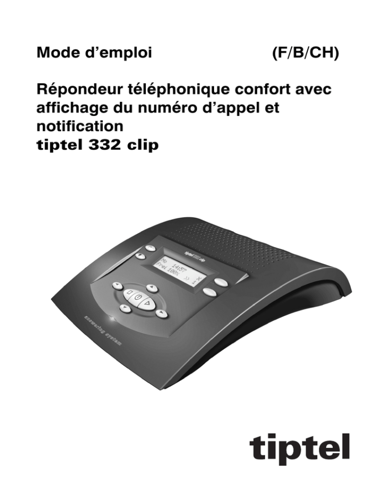Mode d’emploi (F/B/CH) Répondeur téléphonique confort avec affichage du numéro d’appel et notification tiptel 332 clip Consignes de sécurité Consignes de sécurité Lors de l’installation, du raccordement et de la configuration du tiptel 332 clip, veuillez absolument respecter les instructions suivantes: • Ne branchez le cordon de raccordement qu’aux boîtiers prévus à cet effet. • Veuillez poser avec soin les lignes de raccordement. Les câbles raccordés ne doivent pas être soumis à des contraintes mécaniques excessives. • Ne placez pas l’appareil près de sources électriques perturbatrices. • N’utilisez que des accessoires prévus pour cet appareil. • N’ouvrez jamais l’appareil vous-même. Ne touchez pas les contacts téléphoniques avec des objets pointus ou métalliques. • Pour le nettoyage du tiptel 332 clip, utilisez exclusivement un chiffon doux, humide. N’utilisez pas de produits chimiques ou nettoyants. • Protégez l’appareil de l’humidité, de la poussière, des liquides et des vapeurs. • Ne placez pas l’appareil à des endroits directement exposés aux rayons du soleil. • N’utilisez pas l’appareil dans des atmosphères explosives. • Utilisez exclusivement le bloc secteur à fiche tiptel d’origine (n° d’article 4569117) et le câble de raccordement téléphonique tiptel d’origine. 3 Fonctions des touches Fonctions des touches Touche de lecture: fait démarrer la lecture des nouveaux messages non encore écoutés. Lorsque la touche reste enfoncée, elle permet de répéter les 3 dernières secondes écoutées. 2s Touche de lecture enfoncée pendant 2 s: Fait démarrer la lecture de tous les messages. La lecture commence par le plus ancien message et se termine par le plus récent. Touche stop: Interrompt une fonction en cours, permet de valider les programmations. Répondeur activé: active ou désactive le répondeur. Touche d’annonce: une brève pression fait démarrer la reproduction de l’annonce actuelle. En maintenant la touche enfoncée, l’enregistrement de l’annonce programmée démarre. Touche enregistrement: lance l’enregistrement d’une info personnelle (mémo). Lance l’enregistrement pendant une conversation téléphonique. ou. Touches de commande (en haut/en bas): ouvre la liste des appels, sert à la navigation et à la programmation dans le menu de programmation. ou Touches de commande (gauche/droite): modifie le volume, déplace le curseur vers la gauche ou la droite. Touche de sélection: sert à la sélection de champs d’entrée et de fonctions, qui apparaissent sur l’écran à côté de la touche correspondante. et Touches Stop et Répondeur activé actionnées simultanément: ouvrent le menu de programmation. et Touches Répondeur activé et Lecture actionnées simultanément: activent ou désactivent la notification de messages. 2s Touche Répondeur activé enfoncée pendant 2 s: ouvre le menu de programmation du service des abonnés absents. 4 Eléments de commande Eléments de commande 5 Table des matières Table des matières Consignes de sécurité ....................................................................................... 3 Fonctions des touches ....................................................................................... 4 Eléments de commande ..................................................................................... 5 Table des matières ............................................................................................. 6 Mise en service ................................................................................................... Livraison ....................................................................................................... Emplacement ............................................................................................... Raccordement ............................................................................................. 8 8 8 8 Paramètres .......................................................................................................... Menu de programmation ............................................................................. Menu de programmation ............................................................................. Régler le volume .......................................................................................... 10 10 11 12 Annonces ............................................................................................................. Généralités ................................................................................................... Exemples d’annonce ................................................................................... Enregistrer des annonces ........................................................................... Contrôler les annonces ............................................................................... Effacer des annonces .................................................................................. 13 13 13 14 15 15 Activation du répondeur ..................................................................................... 16 Lecture et effacement des messages ............................................................... Lecture de nouveaux messages ................................................................. Lecture de tous les messages .................................................................... Répétition ..................................................................................................... Interrompre la lecture .................................................................................. Chercher (Skip) ........................................................................................... Effacer des messages distincts .................................................................. Effacer tous les messages .................................