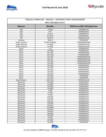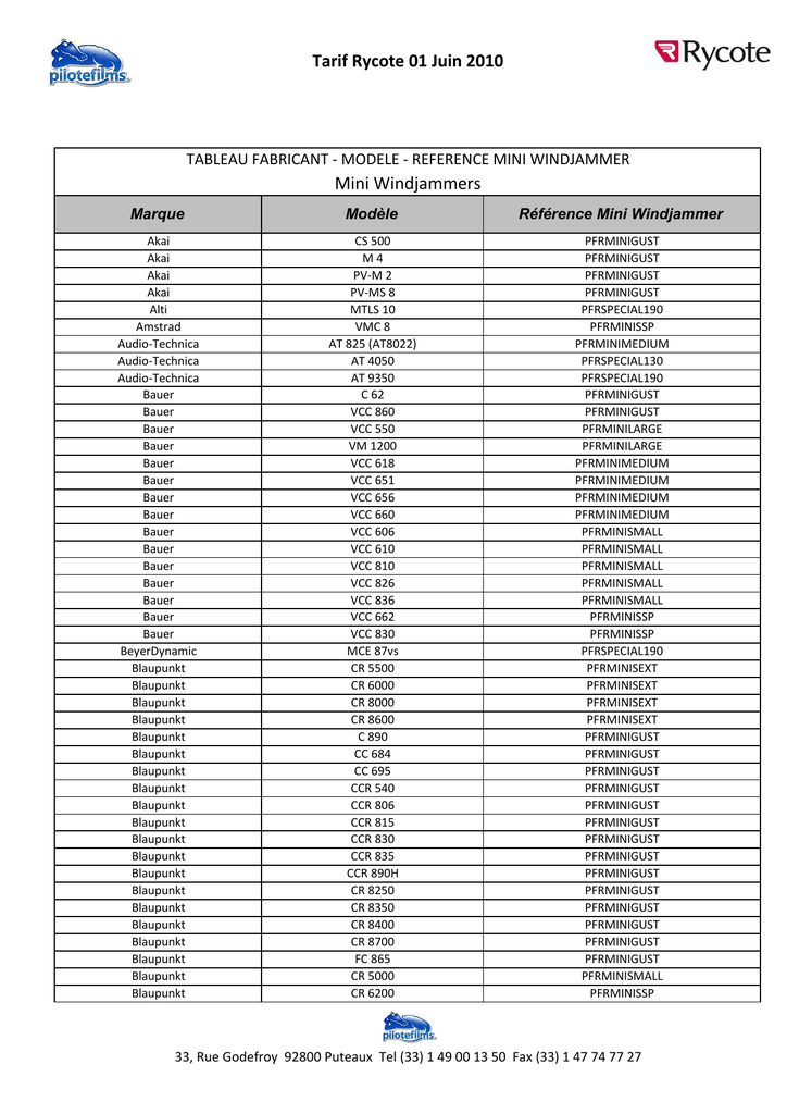 Tarif Rycote 01 Juin 2010 TABLEAU FABRICANT - MODELE - REFERENCE MINI WINDJAMMER Mini Windjammers Marque Modèle Référence Mini Windjammer Akai Akai Akai Akai Alti Amstrad Audio-Technica Audio-Technica Audio-Technica Bauer Bauer Bauer Bauer Bauer Bauer Bauer Bauer Bauer Bauer Bauer Bauer Bauer Bauer Bauer BeyerDynamic Blaupunkt Blaupunkt Blaupunkt Blaupunkt Blaupunkt Blaupunkt Blaupunkt Blaupunkt Blaupunkt Blaupunkt Blaupunkt Blaupunkt Blaupunkt Blaupunkt Blaupunkt Blaupunkt Blaupunkt Blaupunkt Blaupunkt Blaupunkt CS 500 M4 PV-M 2 PV-MS 8 MTLS 10 VMC 8 AT 825 (AT8022) AT 4050 AT 9350 C 62 VCC 860 VCC 550 VM 1200 VCC 618 VCC 651 VCC 656 VCC 660 VCC 606 VCC 610 VCC 810 VCC 826 VCC 836 VCC 662 VCC 830 MCE 87vs CR 5500 CR 6000 CR 8000 CR 8600 C 890 CC 684 CC 695 CCR 540 CCR 806 CCR 815 CCR 830 CCR 835 CCR 890H CR 8250 CR 8350 CR 8400 CR 8700 FC 865 CR 5000 CR 6200 PFRMINIGUST PFRMINIGUST PFRMINIGUST PFRMINIGUST PFRSPECIAL190 PFRMINISSP PFRMINIMEDIUM PFRSPECIAL130 PFRSPECIAL190 PFRMINIGUST PFRMINIGUST PFRMINILARGE PFRMINILARGE PFRMINIMEDIUM PFRMINIMEDIUM PFRMINIMEDIUM PFRMINIMEDIUM PFRMINISMALL PFRMINISMALL PFRMINISMALL PFRMINISMALL PFRMINISMALL PFRMINISSP PFRMINISSP PFRSPECIAL190 PFRMINISEXT PFRMINISEXT PFRMINISEXT PFRMINISEXT PFRMINIGUST PFRMINIGUST PFRMINIGUST PFRMINIGUST PFRMINIGUST PFRMINIGUST PFRMINIGUST PFRMINIGUST PFRMINIGUST PFRMINIGUST PFRMINIGUST PFRMINIGUST PFRMINIGUST PFRMINIGUST PFRMINISMALL PFRMINISSP 33, Rue Godefroy 92800 Puteaux Tel (33) 1 49 00 13 50 Fax (33) 1 47 74 77 27 Tarif Rycote 01 Juin 2010 Marque Modèle Référence Mini Windjammer Camlinc Camlinc Camlinc Camlinc Camlinc Camlinc Camlinc Canon Canon Canon Canon Canon Canon Canon Canon Canon Canon Canon Canon Canon Canon Canon Canon Canon Canon Canon Canon Canon Canon Canon Canon Canon Canon Canon Canon Canon Canon Canon Canon Canon Canon Canon Canon Canon Canon Canon Canon Canon CCM 700 CCM 720 CCM 730 CCM 740 EM 125 EM 800 EM 600 GL-1 GL-2 XM-1 XM-2 XM1 A9 DM-MV 1 E 300 E 333 E 500 E 700 E 800 E 85 E 850 E 850HI MV10∏ 20 UC 1; UC 2 UC 100 UC 1000 UC 1HI; UC 2HI UC 200 UC 2000; 3000 UC 40 UC 4000; 4500 UC 5 UC 5000; 5500 UC 5HI UC 600; 800 UC 7 UC 850; 900 UC 8HI UC 9 UC 9Hi UC10; 15; 16; 30 UCX 1; 2; 10; 20; 30 (Hi) UCX 15; 40; 45 UCX 40; 45 A 10 A 11 A 1HI A 2HI PFRMINIMEXT PFRMINIMEXT PFRMINIMEXT PFRMINIMEDIUM PFRMINIMEDIUM PFRMINIMEDIUM PFRSPECIAL190 PFRMINISEXT PFRMINISEXT PFRMINISEXT PFRMINISEXT PFRMINISEXT PFRMINIGUST PFRMINIGUST PFRMINIGUST PFRMINIGUST PFRMINIGUST PFRMINIGUST PFRMINIGUST PFRMINIGUST PFRMINIGUST PFRMINIGUST PFRMINIGUST PFRMINIGUST PFRMINIGUST PFRMINIGUST PFRMINIGUST PFRMINIGUST PFRMINIGUST PFRMINIGUST PFRMINIGUST PFRMINIGUST PFRMINIGUST PFRMINIGUST PFRMINIGUST PFRMINIGUST PFRMINIGUST PFRMINIGUST PFRMINIGUST PFRMINIGUST PFRMINIGUST PFRMINIGUST PFRMINIGUST PFRMINIGUST PFRMINIMEDIUM PFRMINIMEDIUM PFRMINIMEDIUM PFRMINIMEDIUM 33, Rue Godefroy 92800 Puteaux Tel (33) 1 49 00 13 50 Fax (33) 1 47 74 77 27 Tarif Rycote 01 Juin 2010 Marque Modèle Référence Mini Windjammer Canon Canon Canon Canon Canon Canon Canon Canon Canon Canon Canon Canon Canon Canon Canon Canon Canon Canon Canon Canon Canon Chinon Cullman Dual Edirol Electrovoice Euro Chan Ferguson Ferguson Ferguson Ferguson Ferguson Ferguson Ferguson Ferguson Ferguson Fuji Fuji Fuji Fuji Fuji Fuji Grundig Grundig Grundig Grundig Grundig VME 1; 2 E 430 E 50 E 640 F 802 FC 25 MM 200 MX1 XL-1 XL-2 EX 1HI; EX 2HI ZM 100 E 400 E 600 E 100 E 110 E 200 E 230 E 250 E 60 E 90 VC 1500; 1600 CM 300∏ 400∏ 500 314/316 RO9 RE 50 EMC 6410 F 801 F 811 FS 11 FC 28 FC 3 FC 25; 26; 27 FC 54 FC 23 PRO 8 220 FF 120SW FF 122SW FF 60 FG 122SW FH 80 M 890 DLC 1 DLC10 LC 1 LC 285 LC 330 PFRMINIMEDIUM PFRMINISMALL PFRMINISMALL PFRMINISMALL PFRMINISMALL PFRMINISMALL PFRSPECIAL130 PFRSPECIAL130 PFRSPECIAL155 PFRSPECIAL155 PFRSPECIAL90 PFRSPECIAL90 PFRMINISSP PFRMINISSP PFRMINISSP PFRMINISSP PFRMINISSP PFRMINISSP PFRMINISSP PFRMINISSP PFRMINISSP PFRMINISMALL PFRMINIMEDIUM PFRMINISEXT PFRSPECIALR09 PFRSPECIAL110 PFRSPECIAL130 PFRMINIGUST PFRMINIGUST PFRMINIGUST PFRMINIMEDIUM PFRMINIMEDIUM PFRMINISMALL PFRMINISMALL PFRSPECIAL90 PFRMINISSP PFRMINIGUST PFRMINIGUST PFRMINIGUST PFRMINIGUST PFRMINIGUST PFRMINIGUST PFRMINIGUST PFRMINIGUST PFRMINIGUST PFRMINIGUST PFRMINIGUST 33, Rue Godefroy 92800 Puteaux Tel (33) 1 49 00 13 50 Fax (33) 1 47 74 77 27 Tarif Rycote 01 Juin 2010 Marque Modèle Référence Mini Windjammer Grundig Grundig Grundig Grundig Grundig Grundig Grundig Grundig Grundig Grundig Hahnel Hama Hama Hama Hama Hama Hama Hitachi Hitachi Hitachi Hitachi Hitachi Hitachi Hitachi Hitachi Hitachi Hitachi Hitachi Hitachi Hitachi Hitachi Hitachi Hitachi Hitachi Hitachi Hitachi Hitachi Hitachi Hitachi Hitachi Hitachi Hitachi Hitachi Hitachi Hitachi Hitachi Hitachi LC 400 LC 460 LC 485 LC 500 LC 550; 560 LC 735E LC 750SC LC 760SC LC 775HE LC 295 CMD 1000 RMV 01; 02 RMV-02 RSM 22 RMZ14 RMZ10 RSM 13∏ 20 MP-EGIA VM 3300 Hi8E 15 VM 635 LE VMC 1 VME 10 VME 110; 210 VME 21; 23; 25 VME 230E VME 31 VME 330E VME 410 VME 53 VME 535LE VMH 37; 38; 39; VMH 420 VMH 510 VMH 520 VMH 520E VMH 54; 58 VMH 610 VMH 620 VMH 630E VMH 635LE VMH 70; 80; 81; 90 VMH 710 VMH 720 VMH 80E VMH 835LE VMH 91; 220 PFRMINIGUST PFRMINIGUST PFRMINIGUST PFRMINIGUST PFRMINIGUST PFRMINIGUST PFRMINIGUST PFRMINIGUST PFRMINIGUST PFRSPECIAL90 PFRSPECIAL190 PFRMINISEXT PFRMINISEXT PFRMINILARGE PFRSPECIAL105 PFRSPECIAL190 PFRSPECIAL90 PFRMINIDIY PFRMINISEXT PFRMINIGUST PFRMINIGUST PFRMINIGUST PFRMINIGUST PFRMINIGUST PFRMINIGUST PFRMINIGUST PFRMINIGUST PFRMINIGUST PFRMINIGUST PFRMINIGUST PFRMINIGUST PFRMINIGUST PFRMINIGUST PFRMINIGUST PFRMINIGUST PFRMINIGUST PFRMINIGUST PFRMINIGUST PFRMINIGUST PFRMINIGUST PFRMINIGUST PFRMINIGUST PFRMINIGUST PFRMINIGUST PFRMINIGUST PFRMINIGUST PFRMINIGUST 33, Rue Godefroy 92800 Puteaux Tel (33) 1 49 00 13 50 Fax (33) 1 47 74 77 27 Tarif Rycote 01 Juin 2010 Marque Modèle Référence Mini Windjammer Hitachi Hitachi Hitachi Hitachi Hitachi Hitachi Hitachi Hitachi Hitachi IQ/UNITOR IQ/