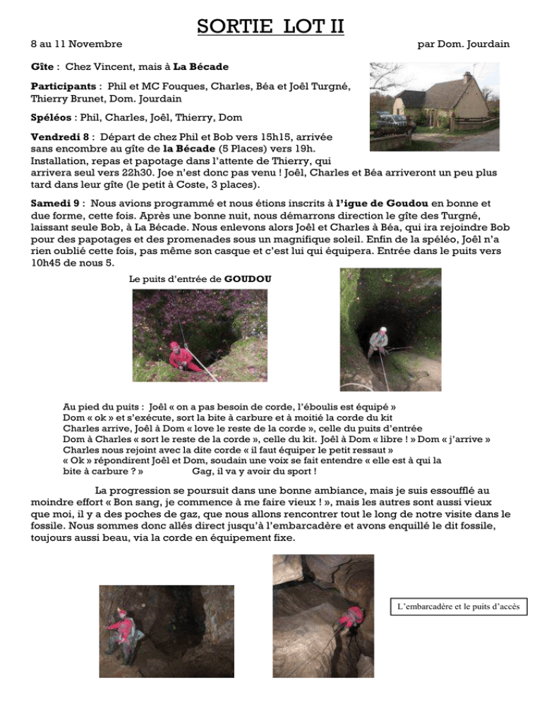 SORTIE LOT II 8 au 11 Novembre par Dom. Jourdain Gîte : Chez Vincent, mais à La Bécade Participants : Phil et MC Fouques, Charles, Béa et Joêl Turgné, Thierry Brunet, Dom. Jourdain Spéléos : Phil, Charles, Joêl, Thierry, Dom Vendredi 8 : Départ de chez Phil et Bob vers 15h15, arrivée sans encombre au gîte de la Bécade (5 Places) vers 19h. Installation, repas et papotage dans l’attente de Thierry, qui arrivera seul vers 22h30. Joe n’est donc pas venu ! Joêl, Charles et Béa arriveront un peu plus tard dans leur gîte (le petit à Coste, 3 places). Samedi 9 : Nous avions programmé et nous étions inscrits à l’igue de Goudou en bonne et due forme, cette fois. Après une bonne nuit, nous démarrons direction le gîte des Turgné, laissant seule Bob, à La Bécade. Nous enlevons alors Joêl et Charles à Béa, qui ira rejoindre Bob pour des papotages et des promenades sous un magnifique soleil. Enfin de la spéléo, Joêl n’a rien oublié cette fois, pas même son casque et c’est lui qui équipera. Entrée dans le puits vers 10h45 de nous 5. Le puits d’entrée de GOUDOU Au pied du puits : Joêl « on a pas besoin de corde, l’éboulis est équipé » Dom « ok » et s’exécute, sort la bite à carbure et à moitié la corde du kit Charles arrive, Joêl à Dom « love le reste de la corde », celle du puits d’entrée Dom à Charles « sort le reste de la corde », celle du kit. Joêl à Dom « libre ! » Dom « j’arrive » Charles nous rejoint avec la dite corde « il faut équiper le petit ressaut » « Ok » répondirent Joêl et Dom, soudain une voix se fait entendre « elle est à qui la bite à carbure ? » Gag, il va y avoir du sport ! La progression se poursuit dans une bonne ambiance, mais je suis essoufflé au moindre effort « Bon sang, je commence à me faire vieux ! », mais les autres sont aussi vieux que moi, il y a des poches de gaz, que nous allons rencontrer tout le long de notre visite dans le fossile. Nous sommes donc allés direct jusqu’à l’embarcadère et avons enquillé le dit fossile, toujours aussi beau, via la corde en équipement fixe. L’embarcadère et le puits d’accès Nous avons continué par la galerie de l’oppo, puis nous nous sommes retrouvés dans la Salle Louis XVI – Louis XVII. Après une pause restauration, nous avons continué notre ballade dans une galerie sèche et en forme de trou de serrure, très photogénique avec, en plus de belles concrétions, et ce que nous croyions être des griffades. La galerie sèche et ses concrétions Ce fut très agréable de marcher aussi confortablement et nous fûmes rapidement au niveau de salle de la jonction. Nous y avons fait de nouveau une petite pause, avant de nous décider à grimper à une corde qui pendait du plafond, vers un réseau supérieur. Aussitôt dit, aussitôt fait, tout le monde en haut, dans une première petite salle, puis une deuxième, derrière une paroi heureusement équipée, très boueuse malgré qu’elle soit assez haute de plafond. Au fond de celle-ci, un passage bas vers une petite salle, avec un plancher effondré plein d’eau. Joêl, notre explorateur infatigable, réussit à passer à coté, sans tomber dedans, pour s’introduire dans une étroiture. Apparemment, ça passe bien et ça continu beaucoup plus grand (c’est sûrement vrai), mais nous, on a pas voulu y aller et on est redescendu à la Jonction. Phil Salle de la Jonction d’autres concrétions l’étroiture Le retour se passa sans problème, puis nous fîmes une petite visite à la galerie Martel, avant de gravir l’éboulis et de remonter le puits. A sa base, nous avons pu observer une population importante de salamandre (vertes) Sortie vers 19h, Phil reçoit un appel de Bob racontant qu’elles étaient perdues dans le Braunhie : sourires des garçons « Ah, les touristes » PS : voir le CR de Béa ! Le chef au Candélabre Quelques autochtones Dimanche 9 Novembre : Charles est resté dormir et travailler, nous ne sommes donc plus que 4 (Phil, Thierry, Joêl et Dom.) pour aller faire l’Igue du Loup (Commune de Caniac du Causse). Entrée vers 11h30, très beau puits, plein pot ou dev au ressaut (plateforme). Le dernier puits, tout au fond, est très étroit, Joêl qui équipe, est le seul à s’y fourrer, tout en essayant de nous y faire descendre également, mais vu le bruit de frottements et autres gargouillis, Phil lui passe son appareil, qui sera nos yeux. Yes ! La plateforme Le puits (très) étroit Pendant le déséquipement, Joêl perd la clé de 8 du chef (le nœud s’est défait !), donc, redescente, etc … pauvre Joêl, vraiment pas de bol. Retour au gîte vers 14H. Les filles nous ont installé le couvert dehors, car il fait super beau et même chaud, un grand merci à elles. Départ de Thierry et de Charles vers 16h, ayant pris quelques coups de soleil et pour la digestion, nous partîmes alors faire une balade dans la Braunhie. Retour vers 18h30 à la nuit tombée. Nous avons croisé un spéléo mayennais qui sortait de Plana, hier, ils avaient fait l’Anzelio, mais s’étaient trompés de puits à un carrefour. « ah bon, connaît pas ! ». Après consultation de Taupes au Lot (le CD du CDS46), à la veillée, cela avait l’air très bien, donc … Lundi 10 Novembre : Nous ne sommes donc plus que 3, (Joêl, Phil et Dom) pour aller faire ce trou que nous ne connaissions pas, l’Igue de l’Angélie ou Anzélio (commune de Reilhac) Départ vers 10h30, selon les renseignements, il faut passer le village du Cornouiller. Par un toujours super beau temps, nous prospectons pendant environ 1h dans les bois et les champs, pour trouver l’entrée, enfin ! Entrée vers 11h45. Equipement à chercher les spits, pas de double amarrages…et merde, nous avons-nous aussi pris le mauvais puits, mais bon, on l’aura fait ! Le mauvais puits ! Le début du bon Déséquipement et rééquipement du bon coté, pendant ce temps, les Mayennais nous interpellent depuis l