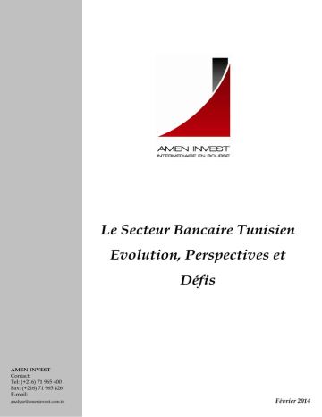 Le Secteur Bancaire Tunisien Evolution, Perspectives et Défis AMEN INVEST Contact: Tel: (+216) 71 965 400 Fax: (+216) 71 965 426 E-mail: [email protected] Février 2014 Le secteur bancaire tunisien - Evolution, perspectives et défis SOMMAIRE Evolution de l’activité des établissements de crédit Tunisiens................................4 Le secteur bancaire tunisien..........................................................................................7 1. Ressources...............................................................................................................7 1.1 Les dépôts ....................................................................................................8 1.2 Emprunts et ressources spéciales ................................................................9 1.3 Fonds Propres ...........................................................................................10 2. Emplois..................................................................................................................12 2.1 Les crédits..................................................................................................12 3. Qualité d’actifs......................................................................................................14 3.1 Les créances classées..................................................................................14 3.2 La couverture des créances classées ..........................................................15 4. L’Exploitation .......................................................................................................16 4.1 Evolution du PNB ....................................................................................16 4.2 Le charges d’exploitation...........................................................................18 4.3 Le coût du risque.......................................................................................19 4.4 Le Résultat Brut d’Exploitation................................................................20 4.5 Le Résultat Net .........................................................................................21 4.6 Indicateurs de Rentabilité .........................................................................22 Secteur Bancaire tunisien, des problèmes structurels à l’origine de la fragilité du système...........................................................................................................................23 2 Le secteur bancaire tunisien - Evolution, perspectives et défis A l’instar des années 2011 et 2012, la conjoncture économique mondiale est demeurée en 2013 sensible aux retombées de la crise de la dette souveraine dans la Zone Euro, ayant entraîné une détérioration de la confiance des opérateurs économiques sur les marchés, mais aussi un ralentissement des échanges mondiaux et un déséquilibre sur les marchés financiers internationaux. C’est ainsi que la croissance de l’économie mondiale est restée faible en 2013. Le FMI estime la croissance mondiale à 3% en 2013 contre 3,2% un an plutôt et 3,9% en 2011. A l’échelle nationale, la poursuite des tensions sociopolitiques et la détérioration de la situation sécuritaire dans le pays pour la troisième année consécutive auxquelles s’ajoute la poursuite de la récession dans la Zone Euro, principal partenaire de la Tunisie, n’ont fait que ralentir davantage le rythme de l’activité économique en 2013. En effet, après avoir échappé à la récession en 2012, affichant une croissance de 3,6%, le rythme d’évolution de l’économie Tunisienne s’est décéléré en 2013 pour s’établir, selon les récentes estimations du gouvernement, entre 2,6% et 3%, un niveau proche des dernières prévisions du FMI (3%). Parallèlement, afin de relancer la croissance et faire face aux revendications sociales croissantes, le gouvernement a adopté depuis la révolution une politique budgétaire expansionniste, qui a entraîné une dégradation continue des équilibres financiers du pays. Le solde des échanges commerciaux s’est encore détérioré atteignant un nouveau record, soit un déficit de 11 808MDT en 2013 contre -11 635MDT en 2012 et -8 604MDT en 2011. Ceci a mené à un élargissement du déficit de la balance des paiements courants, qui a atteint 8,3% du PIB au terme de l’année 2013 contre 8,2% une année auparavant et 7,3% en 2011. Il en est de même pour le taux d’inflation qui, après une certaine stagnation au cours des derniers mois de l’année, a affiché à fin 2013, une moyenne de 6,1% contre 5,6% un an plus tôt (soit le niveau le plus élevé depuis 1995). Ceci est dû, essentiellement, à la hausse des prix des produits alimentaires (8% contre 7,5%). Sur le plan monétaire, l’année 2013 a été marquée par une certaine atténuation des pressions exercées sur la liquidité bancaire et ce après avoir assisté depuis 2011 à un fort assèchement, ce qui explique la baisse de l’intervention de la Banque Centrale sur le marché monétaire. L’injection de la liquidité par la BCT en 2013, a ainsi baissé à une moyenne de 4 299MDT contre 4 542MDT en 2012 (3 604MDT en 2011), demeurant tout de même à un niveau assez élevé. Face à la persistance des tensions inflationnistes et au tarissement de la trésorerie bancaire mais également dans l’objectif de la rationalisation des crédits à la consommation, la Banque Centrale de Tunisie a décidé de mettre fin à sa politique monétaire accommodante adoptée depuis 2011. Elle a ainsi décidé à deux reprises de relever son taux d’intérêt directeur pour le porter de 3,75% en 2012 à 4,5% à fin 2013 et de réduire le taux de réserves obligatoires, le portant de 2% à 1%. Il en a résulté une hausse du taux d’intérêt moyen sur le marché monétaire de 3,98% en décembre 2012 à 4,74% à fin 2013. 3 Le secteur bancaire tunisien - Evolution, perspective