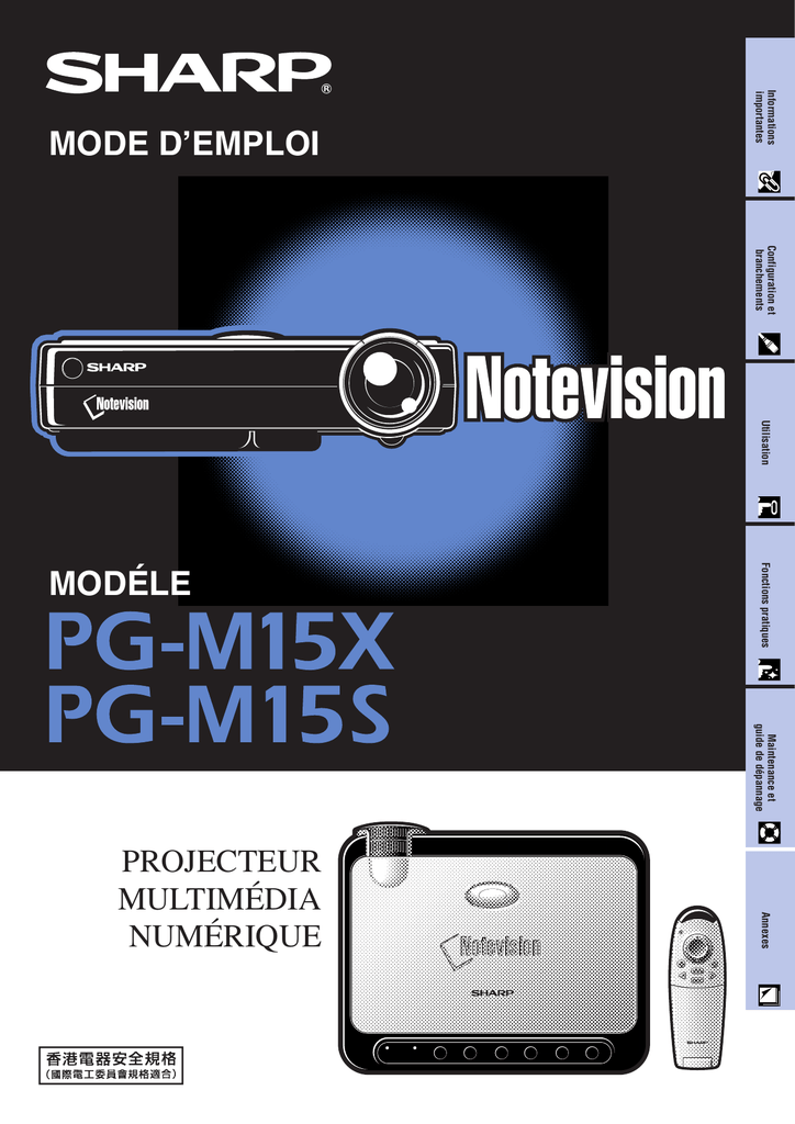 Configuration et branchements Utilisation Maintenance et guide de dépannage Annexes PROJECTEUR MULTIMÉDIA NUMÉRIQUE Fonctions pratiques MODÉLE Informations importantes MODE D’EMPLOI This equipment complies with the requirements of Directives 89/336/EEC and 73/23/EEC as amended by 93/68/ EEC. Dieses Gerät entspricht den Anforderungen der EG-Richtlinien 89/336/EWG und 73/23/EWG mit Änderung 93/ 68/EWG. Ce matériel répond aux exigences contenues dans les directives 89/336/CEE et 73/23/CEE modifiées par la directive 93/68/CEE. Dit apparaat voldoet aan de eisen van de richtlijnen 89/336/EEG en 73/23/EEG, gewijzigd door 93/68/EEG. Dette udstyr overholder kravene i direktiv nr. 89/336/EEC og 73/23/EEC med tillæg nr. 93/68/EEC. Quest’ apparecchio è conforme ai requisiti delle direttive 89/336/EEC e 73/23/EEC, come emendata dalla direttiva 93/68/EEC. « „ͷًÛÙ·ÛÁ ·ıÙfi ·ÌÙ·ÔÍÒflÌÂÙ·È ÛÙÈÚ ··ÈÙfiÛÂÈÚ Ù˘Ì Ô‰Á„È˛Ì ÙÁÚ EıÒ˘·˙ÍfiÚ EÌ˘ÛÁÚ 89/336/EOK Í·È 73/23/EOK, ¸˘Ú ÔÈ Í·ÌÔÌÈÛÏÔfl ·ıÙÔfl ÛıÏÎÁÒ˛ËÁÍ·Ì ·¸ ÙÁÌ Ô‰Á„fl· 93/68/EOK. Este equipamento obedece às exigências das directivas 89/336/CEE e 73/23/CEE, na sua versão corrigida pela directiva 93/68/CEE. Este aparato satisface las exigencias de las Directivas 89/336/CEE y 73/23/CEE, modificadas por medio de la 93/68/CEE. Denna utrustning uppfyller kraven enligt riktlinjerna 89/336/EEC och 73/23/EEC så som kompletteras av 93/68/ EEC. Dette produktet oppfyller betingelsene i direktivene 89/336/EEC og 73/23/EEC i endringen 93/68/EEC. Tämä laite täyttää direktiivien 89/336/EEC ja 73/23/EEC vaatimukset, joita on muutettu direktiivillä 93/68/EEC. SPECIAL NOTE FOR USERS IN THE U.K. The mains lead of this product is fitted with a non-rewireable (moulded) plug incorporating a 3A fuse. Should the fuse need to be replaced, a BSI or ASTA approved BS 1362 fuse marked or and of the same rating as above, which is also indicated on the pin face of the plug, must be used. Always refit the fuse cover after replacing the fuse. Never use the plug without the fuse cover fitted. In the unlikely event of the socket outlet in your home not being compatible with the plug supplied, cut off the mains plug and fit an appropriate type. DANGER: The fuse from the cut-off plug should be removed and the cut-off plug destroyed immediately and disposed of in a safe manner. Under no circumstances should the cut-off plug be inserted elsewhere into a 3A socket outlet, as a serious electric shock may occur. To fit an appropriate plug to the mains lead, follow the instructions below: IMPORTANT: The wires in the mains lead are coloured in accordance with the following code: Blue: Neutral Brown: Live As the colours of the wires in the mains lead of this product may not correspond with the coloured markings identifying the terminals in your plug, proceed as follows: • The wire which is coloured blue must be connected to the plug terminal which is marked N or coloured black. • The wire which is coloured brown must be connected to the plug terminal which is marked L or coloured red. Ensure that neither the brown nor the blue wire is connected to the earth terminal in your three-pin plug. Before replacing the plug cover make sure that: • If the new fitted plug contains a fuse, its value is the same as that removed from the cut-off plug. • The cord grip is clamped over the sheath of the mains lead, and not simply over the lead wires. IF YOU HAVE ANY DOUBT, CONSULT A QUALIFIED ELECTRICIAN. Avant d’utiliser ce projecteur, veuillez lire attentivement ce mode d’emploi. IMPORTANT Pour vous aider à retrouver votre projecteur en cas de perte ou de vol, veuillez noter le numéro de série, inscrit sur le panneau de fond du projecteur, et conserver soigneusement cette information.Avant de recycler l’emballage, vérifiez convenablement son contenu en vous reportant à la liste «Accessoires fournis» de la page 12. FRANÇAIS N° de modèle: PG-M15X N° de série: Informations importantes MODE D’EMPLOI N° de modèle: PG-M15S N° de série: Il existent deux raisons valables pour enregistrer sans retard l’acquisition de ce projecteur SHARP en retournant la carte de garantie que contient l’emballage du projecteur. 1. GARANTIE Vous êtes assuré de bénéficier pleinement des pièces et services attachés à la garantie aussitôt que la carte nous est retournée. 2. ACTE SUR LA SÉCURITÉ DE L’UTILISATEUR D’UN PRODUIT Vous serez promptement informé de toute question concernant la sécurité, de toute modification nécessaire et de tout rappel en usine que SHARP serait tenu d’offrir dans le cadre de l’Acte de 1972 sur la sécurité de l’utilisateur d’un produit. VEUILLEZ LIRE ATTENTIVEMENT LE PARAGRAPHE IMPORTANT «GARANTIE LIMITÉE». Etats-Unis uniquement AVERTISSEMENT: Source de lumière de grande intensité. Ne pas fixer les yeux sur le faisceau lumineux, ne pas le regarder directement. S’assurer tout spécialement que les enfants ne fixent pas les yeux directement sur le faisceau. AVERTISSEMENT: Pour réduire les risques d’incendie et de secousse électrique, ne pas exposer cet appareil à la pluie ni à l’humidité. ATTENTION RISQUE D’ÉLECTROCUTION. NE PAS RETIRER LES VIS À L’EXCEPTION DES VIS RÉSERVÉES À L’ENTRETIEN. ATTENTION: POUR RÉDUIRE LES RISQUES DE SECOUSSE ÉLECTRIQUE, NE PAS RETIRER LE CAPOT SUPÉRIEUR. L’APPAREIL NE CONTIENT AUCUNE PIÈCE QUE L’UTILISATEUR PUISSE REMPLACER, À L’EXCLUSION DE LA LAMPE. CONFIER LES RÉPARATIONS À DU PERSONNEL QUALIFIÉ. Le symbole de l’éclair, inscrit dans un triangle équilatéral, a pour objet d’appeler l’attention de l’utilisateur sur la présence, à l’intérieur du produit, de pièces non isolées portées à une «tension dangereuse» qui peut avoir une amplitude suffisante pour provoquer une secousse électrique. Le symbole du point d’exclamation, inscrit dan