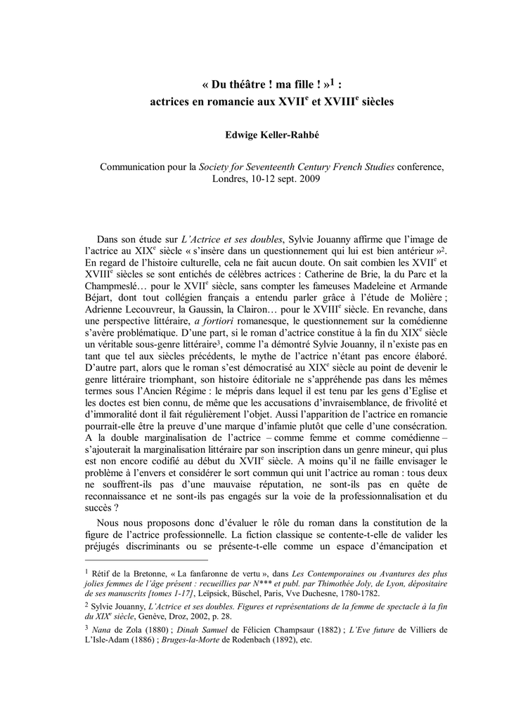 « Du théâtre ! ma fille ! »1 : actrices en romancie aux XVIIe et XVIIIe siècles Edwige Keller-Rahbé Communication pour la Society for Seventeenth Century French Studies conference, Londres, 10-12 sept. 2009 Dans son étude sur L’Actrice et ses doubles, Sylvie Jouanny affirme que l’image de l’actrice au XIXe siècle « s’insère dans un questionnement qui lui est bien antérieur »2. En regard de l’histoire culturelle, cela ne fait aucun doute. On sait combien les XVIIe et XVIIIe siècles se sont entichés de célèbres actrices : Catherine de Brie, la du Parc et la Champmeslé… pour le XVIIe siècle, sans compter les fameuses Madeleine et Armande Béjart, dont tout collégien français a entendu parler grâce à l’étude de Molière ; Adrienne Lecouvreur, la Gaussin, la Clairon… pour le XVIIIe siècle. En revanche, dans une perspective littéraire, a fortiori romanesque, le questionnement sur la comédienne s’avère problématique. D’une part, si le roman d’actrice constitue à la fin du XIXe siècle un véritable sous-genre littéraire3, comme l’a démontré Sylvie Jouanny, il n’existe pas en tant que tel aux siècles précédents, le mythe de l’actrice n’étant pas encore élaboré. D’autre part, alors que le roman s’est démocratisé au XIXe siècle au point de devenir le genre littéraire triomphant, son histoire éditoriale ne s’appréhende pas dans les mêmes termes sous l’Ancien Régime : le mépris dans lequel il est tenu par les gens d’Eglise et les doctes est bien connu, de même que les accusations d’invraisemblance, de frivolité et d’immoralité dont il fait régulièrement l’objet. Aussi l’apparition de l’actrice en romancie pourrait-elle être la preuve d’une marque d’infamie plutôt que celle d’une consécration. A la double marginalisation de l’actrice – comme femme et comme comédienne – s’ajouterait la marginalisation littéraire par son inscription dans un genre mineur, qui plus est non encore codifié au début du XVIIe siècle. A moins qu’il ne faille envisager le problème à l’envers et considérer le sort commun qui unit l’actrice au roman : tous deux ne souffrent-ils pas d’une mauvaise réputation, ne sont-ils pas en quête de reconnaissance et ne sont-ils pas engagés sur la voie de la professionnalisation et du succès ? Nous nous proposons donc d’évaluer le rôle du roman dans la constitution de la figure de l’actrice professionnelle. La fiction classique se contente-t-elle de valider les préjugés discriminants ou se présente-t-elle comme un espace d’émancipation et 1 Rétif de la Bretonne, « La fanfaronne de vertu », dans Les Contemporaines ou Avantures des plus jolies femmes de l’âge présent : recueillies par N*** et publ. par Thimothée Joly, de Lyon, dépositaire de ses manuscrits [tomes 1-17], Leïpsick, Büschel, Paris, Vve Duchesne, 1780-1782. 2 Sylvie Jouanny, L’Actrice et ses doubles. Figures et représentations de la femme de spectacle à la fin du XIXe siècle, Genève, Droz, 2002, p. 28. 3 Nana de Zola (1880) ; Dinah Samuel de Félicien Champsaur (1882) ; L’Eve future de Villiers de L’Isle-Adam (1886) ; Bruges-la-Morte de Rodenbach (1892), etc. E. Keller-Rahbé, « "Du théâtre ! ma fille !" : actrices en romancie aux XVIIe et XVIIIe siècles » © http://www.theatredefemmes-ancienregime.org d’expérimentation, voire de légitimation ? Surtout, comment prépare-t-elle l’avènement et le triomphe du roman d’actrice ?4 Actrices en romancie : un corpus en extension De quand peut-on dater l’entrée des actrices professionnelles5 sur la scène romanesque, et à quel titre ? L’affirmation de Catherine Ramond selon laquelle « les comédiens ne figurent qu’en seconde place dans le roman du XVIIIe siècle [et qu’]il faudra attendre Nana de Zola, pour qu’une comédienne ait une véritable dimension romanesque »6 se vérifie-t-elle ? En raison de l’exclusion des femmes de l’univers théâtral7, il est difficile, voire impossible, de trouver des personnages de comédiennes professionnelles en France avant le XVIIe siècle8. Et même à cette époque, ils sont rares. Phénomène pour le moins curieux à en juger par la place prépondérante du théâtre dans la société et le champ littéraire du Grand siècle. Est-ce à dire que le genre romanesque répugne au théâtre ? Assurément non si l’on considère qu’il lui emprunte bon nombre d’artefacts : la critique a souligné depuis longtemps le goût des grandes fictions baroques pour les déguisements et les quiproquos, ainsi que la fascination du roman classique pour la scène contemporaine9. Cela dit, la question de la hiérarchie des genres demeure : si le rapprochement avec l’univers théâtral témoigne d’un effort d’ennoblissement de la part 4 Au seuil de cette enquête, nous tenons à remercier chaleureusement Aurore Evain et Charlotte Simonin pour leurs suggestions de lectures, et leurs précieux conseils et remarques. 5 Par définition, nous excluons les personnages qui pourraient être comparés à des actrices en raison de leur conduite théâtrale (Henriette-Sylvie de Molière et Manon Lescaut, par exemple). De même, nous n’avons pas retenu les personnages qui endossent occasionnellement un rôle, soit dans le cadre de divertissements, soit dans le cadre d’un deuil, comme la petite Henriette de La Nouvelle Héloïse (à la mort de Julie, M. de Wolmar lui fait jouer le rôle de sa mère pour tenter de consoler Claire d’Orbe ; VI, 11). 6 Catherine Ramond, Les Eléments théâtraux dans le roman et l’évolution du genre romanesque en France au XVIIIe siècle, Thèse pour le doctorat ss la dir. de René Démoris, Université Sorbonne nouvelle-Paris III, 1993, vol. 1, p. 87. 7 Dans son étude sur L’Apparition des actrices professionnelles en Europe, Aurore Evain a toutefois remis en cause cette idée reçue en montrant l’existence d’une pratique théâtr