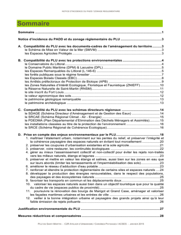 NOTICE D’INCIDENCE DU PADD / ZONAGE REGLEMENTAIRE Sommaire Sommaire ........................................................................................................................................1 Notice d’incidence du PADD et du zonage réglementaire du PLU ............................................3 A. Compatibilité du PLU avec les documents-cadres de l’aménagement du territoire ..........3 le Schéma de Mise en Valeur de la Mer (SMVM) .....................................................................3 les Espaces Agricoles Protégés ................................................................................................3 B. Compatibilité du PLU avec les protections environnementales ..........................................4 le Conservatoire du Littoral........................................................................................................4 le Domaine Public Maritime (DPM) & Lacustre (DPL) ...............................................................5 les Espaces Remarquables du Littoral (L.146-6) ......................................................................5 les forêts publiques sous le régime forestier .............................................................................7 les Espaces Boisés Classés (EBC) ...........................................................................................8 les Arrêtés préfectoraux de Protection de Biotope (APB) .........................................................9 les Zones Naturelles d’Intérêt Ecologique, Floristique et Faunistique (ZNIEFF) .....................10 la Réserve Naturelle de Saint-Martin (RNSM).........................................................................11 le site inscrit du Fort Louis .......................................................................................................12 la valeur agronomique des sols ...............................................................................................12 le patrimoine géologique remarquable ....................................................................................13 le patrimoine archéologique ....................................................................................................13 C. Compatibilité du PLU avec les schémas directeurs régionaux .........................................14 le SDAGE (Schéma Directeur d’Aménagement et de Gestion des Eaux) ..............................14 le SRCAE (Schéma Régional Climat - Air - Energie) ..............................................................15 le PDEDMA (Plan Départemental d’Elimination des Déchets Ménagers et Assimilés)...........15 les installations classées au titre de la protection de l’environnement ....................................16 le SRCE (Schéma Régional de Cohérence Ecologique).........................................................16 D. Prise en compte des enjeux environnementaux par le PLU...............................................18 1. maîtriser l’étalement urbain, notamment sur les pentes du relief, et préserver l’intégrité et la cohérence paysagère des espaces naturels en évitant tout morcellement ...................20 2. préserver les coupures d’urbanisation existantes et la sole agricole.................................21 3. préserver, voire restaurer, les continuités écologiques .....................................................22 4. gérer au mieux l’assainissement collectif et non-collectif pour éviter les rejets non-traités vers les milieux naturels, étangs et lagunes ......................................................................23 5. préserver et mettre en valeur les étangs et salines, aussi bien sur les zones en eau que sur leurs abords (limiter les terrassements et l’imperméabilisation des sols) ....................23 6. améliorer le réseau d’adduction d’eau potable ..................................................................23 7. renforcer et étendre la protection réglementaire de certains sites et espaces naturels ....24 8. développer la production des énergies renouvelables, dans le respect des populations, des paysages et des écosystèmes naturels ......................................................................25 9. favoriser les transports en commun et les déplacements doux .........................................25 10. valoriser les espaces naturels aussi bien dans un objectif touristique que pour la qualité du cadre de vie (espaces publics de proximité).................................................................25 11. poursuivre la rénovation des bourgs de Marigot et Grand Case, aménager et valoriser les façades maritimes urbaines et les entrées de ville ......................................................26 12. veiller à la bonne intégration urbaine et paysagère des grands projets ainsi qu’à leur faible émission de rejets polluants .....................................................................................26 Justification environnementale du PLU .....................................................................................27 Mesures réductrices et compensatoires ....................................................................................28 PLU DE SAINT-MARTIN - C2R ATELIER D’URBANISME / CARAÏBES PAYSAGES / ACSES - JANVIER 2015 NOTICE D’INCIDENCE DU PADD / ZONAGE REGLEMENTAIRE Indicateurs de suivi de l’état de l’environnement......................................................................29 A. Préserver et valoriser les ressources naturelles .................................................................30 1. réduire la consommation d’énergie et améliorer la gestion de l’énergie........................30 2. améliorer la gestion de la ressource en eau et sa qualité .............................................30 3. éviter l’étalement urbain et favoriser la densité .................................