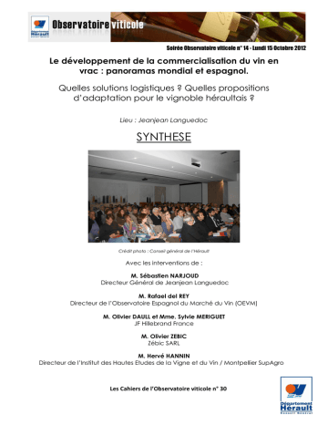 Soirée Observatoire viticole n° 14 - Lundi 15 Octobre 2012 Le développement de la commercialisation du vin en vrac : panoramas mondial et espagnol. Quelles solutions logistiques ? Quelles propositions d’adaptation pour le vignoble héraultais ? Lieu : Jeanjean Languedoc SYNTHESE Crédit photo : Conseil général de l’Hérault Avec les interventions de : M. Sébastien NARJOUD Directeur Général de Jeanjean Languedoc M. Rafael del REY Directeur de l’Observatoire Espagnol du Marché du Vin (OEVM) M. Olivier DAULL et Mme. Sylvie MERIGUET JF Hillebrand France M. Olivier ZEBIC Zébic SARL M. Hervé HANNIN Directeur de l’Institut des Hautes Etudes de la Vigne et du Vin / Montpellier SupAgro Les Cahiers de l’Observatoire viticole n° 30 La quatorzième édition des Soirées de l’Observatoire Viticole s’est tenue le lundi 15 Octobre 2012 devant une assemblée d’environ 100 participants, chez le négociant « Jeanjean Languedoc », à Saint-Félix-de-Lodez. Le thème de la soirée s’intitulait : « Le développement de la commercialisation du vin en vrac : panoramas mondial et espagnol - Quelles solutions logistiques ? Quelles propositions d’adaptation pour le vignoble héraultais ? ». 1. Présentation, stratégie et importance de la commercialisation du vin en vrac chez Jeanjean Languedoc. Sébastien NARJOUD, Directeur Général de Jeanjean Languedoc Acteur languedocien historique implanté à Saint-Félix-de-Lodez depuis 1870, JeanJean a connu dans les années 2000 une croissante externe importante, s’implantant dans les différents vignobles de Provence, Bordeaux, Châteauneuf du Pape, Sud-Ouest, en fusionnant avec la maison Laroche en 2010. Suite à ce rapprochement a émergé le nom d’Advini (addition de vin et de vignoble). Advini reste ancré dans le Languedoc grâce à JeanJean, entité languedocienne, qui en est l’actionnaire principal. Crédit photo : Conseil général de l’Hérault Le fonctionnement d’Advini : • • • • Des maisons de vin qui représentent la plupart des vignobles français. Une structure de distribution commune pour être sur les marchés en permanence (aujourd’hui un peu plus de 90 personnes ont la charge de la distribution des vins). Des bureaux de représentation partout dans le monde (Asie, Chine, Europe, Angleterre, Amérique du nord et du sud avec un bureau au Chili depuis 2011). La mutualisation des supports avec une dimension humaine forte soulignée par un principe : « des vignobles et des hommes ». 2 Quelques chiffres : • • • • 210 millions de Chiffres d’Affaires (CA) en 2011 soit le 4ème opérateur français (derrière Castel, Grands Chais, Val d’Orbieu Cordier Mestrezat,…) et le 53ème mondial. 37% CA réalisé à l’export. plus de 600 salariés. plus de 43% de vins du Languedoc. Advini est le plus important vendeur de vins d’appellations en France avec près de 60% de ventes en appellation, 30% en IGP et un peu de vins de France et de vins étrangers (notamment du Chili et d’Afrique du Sud suite au rapprochement avec la maison Laroche). JeanJean, la structure languedocienne • • • • • • • 156 salariés dont la plupart basés sur le site de Saint Félix de Lodez. Un peu moins de 90 millions de CA. Vins du Languedoc vendus à égalité entre la France et l’Export. Historiquement JeanJean vend 30% à l’export avec une forte implantation en GD et en circuit traditionnel. 750 000 hectolitres chez JeanJean, soit seulement 5% du bassin en termes d’achat. (A titre de comparaison, en Australie 90% des vins australiens sont issus des 3 premiers opérateurs). Une marque « Vignobles JeanJean » issue de vignobles en propre (un peu moins de 350 ha en Languedoc toutes appellations confondues). Une activité plus « industrielle » avec 3 métiers développés sur le site de Saint Félix : lignes pour le conditionnement des vins en bouteilles plastique, en bouteilles en verre et en Bag in Box. Un engagement fort dans la démarche de développement durable appuyée par une certification AFAQ 26 000 (3ème niveau de maîtrise). Vignobles en propre en conversion ou déjà certifiés en agriculture biologique. Le vrac chez JeanJean La commercialisation en vrac représente environ 100 000 hectolitres par an. Le vrac a été perçu presque contradictoire avec le développement stratégique de JeanJean puisque la valeur ajoutée devait rester dans le lieu de production en favorisant la mise en bouteille en région voire au vignoble. Cette raison explique le faible développement du vrac chez JeanJean bien qu’il constitue une activité historique de l’entreprise. Force est de constater qu’une tendance de fond dans les échanges internationaux favorise le vrac et avec lui le conditionnement sur le lieu/région de consommation. L’écologie est un argument fort de cette tendance, mais il n’est pas le seul… 3 2. Présentation de la commercialisation du vin en vrac au niveau mondial et zoom sur l’Espagne, premier exportateur en volume Rafael del Rey, Directeur de l’Observatoire Espagnol du Marché du Vin (OEVM) www.oemv.es Rafael del Rey a rappelé la spécificité de cet Observatoire Espagnol au sein des différents observatoires dans le monde. En effet, l’OEVM est inédit car il est spécialement dédié au marché final, observant le consommateur (domestique et mondial) en le mettant au centre des préoccupations du marché. Ces dernières années, la consommation a augmenté de manière significative dans les pays non producteurs, ce qui compense la baisse de consommation des pays producteurs de vin. Certains pays sont ainsi nettement exportateurs (France, Italie, Espagne,…) et d’autres nettement importateurs (Etats-Unis, Chine, Allemagne …). C’est donc la proportion de vin exporté par rapport à la consommation qui augmente vraiment. Crédit photo : Conseil général de l’Hérault Le marché mondial du vin Le marché mondial du vin regroupe 3 grandes catégories: Le