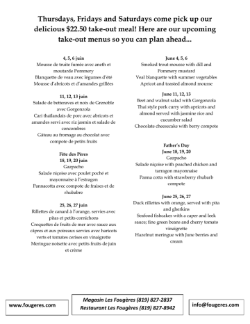 Thursdays, Fridays and Saturdays come pick up our delicious $22.50 take-out meal! Here are our upcoming take-out menus so you can plan ahead... 4, 5, 6 juin Mousse de truite fumée avec aneth et moutarde Pommery Blanquette de veau avec légumes d’été Mousse d’abricots et d’amandes grillées 11, 12, 13 juin Salade de betteraves et noix de Grenoble avec Gorgonzola Cari thaïlandais de porc avec abricots et amandes servi avec riz jasmin et salade de concombres Gâteau au fromage au chocolat avec compote de petits fruits Fête des Pères 18, 19, 20 juin Gazpacho Salade niçoise avec poulet poché et mayonnaise à l’estragon Pannacotta avec compote de fraises et de rhubabre 25, 26, 27 juin Rillettes de canard à l’orange, servies avec pitas et petits cornichons Croquettes de fruits de mer avec sauce aux câpres et aux poireaux servies avec haricots verts et tomates cerises en vinaigrette Meringue noisette avec petits fruits de juin et crème www.fougeres.com June 4, 5, 6 Smoked trout mousse with dill and Pommery mustard Veal blanquette with summer vegetables Apricot and toasted almond mousse June 11, 12, 13 Beet and walnut salad with Gorgonzola Thai style pork curry with apricots and almond served with jasmine rice and cucumber salad Chocolate cheesecake with berry compote Father’s Day June 18, 19, 20 Gazpacho Salade niçoise with poached chicken and tarragon mayonnaise Panna cotta with strawberry rhubarb compote June 25, 26, 27 Duck rillettes with orange, served with pita and gherkins Seafood fishcakes with a caper and leek sauce; fine green beans and cherry tomato vinaigrette Hazelnut meringue with June berries and cream Magasin Les Fougères (819) 827-2837 Restaurant Les Fougères (819) 827-8942 [email protected] Les jeudis, vendredis et samedis, venez chercher notre délicieux menu à emporter à $22.50 Pour planifier vos repas cette saison, voici nos menus à emporter... 4, 5, 6 juin Mousse de truite fumée avec aneth et moutarde Pommery Blanquette de veau avec légumes d’été Mousse d’abricots et d’amandes grillées June 4, 5, 6 Smoked trout mousse with dill and Pommery mustard Veal blanquette with summer vegetables Apricot and toasted almond mousse 11, 12, 13 juin Salade de betteraves et noix de Grenoble avec Gorgonzola Cari thaïlandais de porc avec abricots et amandes servi avec riz jasmin et salade de concombres Gâteau au fromage au chocolat avec compote de petits fruits June 11, 12, 13 Beet and walnut salad with Gorgonzola Thai style pork curry with apricots and almond served with jasmine rice and cucumber salad Chocolate cheesecake with berry compote Fête des Pères 18, 19, 20 juin Gazpacho Salade niçoise avec poulet poché et mayonnaise à l’estragon Pannacotta avec compote de fraises et de rhubabre 25, 26, 27 juin Rillettes de canard à l’orange, servies avec pitas et petits cornichons Croquettes de fruits de mer avec sauce aux câpres et aux poireaux servies avec haricots verts et tomates cerises en vinaigrette Meringue noisette avec petits fruits de juin et crème www.fougeres.com Father’s Day June 18, 19, 20 Gazpacho Salade niçoise with poached chicken and tarragon mayonnaise Panna cotta with strawberry rhubarb compote June 25, 26, 27 Duck rillettes with orange, served with pita and gherkins Seafood fishcakes with a caper and leek sauce; fine green beans and cherry tomato vinaigrette Hazelnut meringue with June berries and cream Magasin Les Fougères (819) 827-2837 Restaurant Les Fougères (819) 827-8942 [email protected]