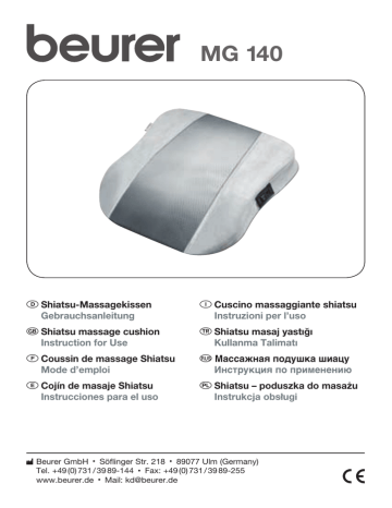 MG 140 DShiatsu-Massagekissen ICuscino massaggiante shiatsu GShiatsu massage cushion TShiatsu masaj yastığı FCoussin de massage Shiatsu RUS Массажная подушка шиацу o ECojín de masaje Shiatsu QShiatsu – poduszka do masażu Gebrauchsanleitung Instruction for Use Mode d’emploi Instrucciones para el uso Instruzioni per l’uso Kullanma Talimatı Инструкция по применению Instrukcja obsługi Beurer GmbH • Söflinger Str. 218 • 89077 Ulm (Germany) Tel. +49 (0) 731 / 39 89-144 • Fax: +49 (0) 731 / 39 89-255 www.beurer.de • Mail: [email protected] Français Fourniture •Coussins de massage Shiatsu •Housse amovible •Bloc d’alimentation •Le présent mode d’emploi Explication des signes Les symboles suivants sont utilisés dans le mode d’emploi et sur la plaque signalétique : AVERTISSEMENT Avertissement, risque de blessure ou danger pour votre santé. ATTENTION Remarque de sécurité relative à la possibilité de dommages sur l’appareil/les accessoires Remarque Remarque relative à des informations importantes L’appareil est doublement isolé et est conforme à la classe de protection 2. 1. Premières expériences Fonctions de l’appareil Cet appareil électrique de massage Shiatsu vous permet de faire des massages efficaces et bienfaisants, sans aucune aide, sur vous-même ou sur une autre personne. Effectués dans un but de stimulation ou de détente, les massages peuvent être utilisés afin de traiter les contractures musculaires, les douleurs et la fatigue. L’appareil cunéiforme universel assure le massage en profondeur vigoureux et intensif de la nuque, du dos, des jambes et des bras. Posé au sol, l’appareil peut également être utilisé pour un massage tonifiant des pieds. Grâce à sa taille maniable et à son faible poids, l’appareil se transporte aisément et se range rapidement. L’appareil est prévu uniquement pour un usage personnel et non pas à des fins médicales ou commerciales. L’appareil de massage Shiatsu présente également les avantages suivants : •Deux sens de massage au choix •Simplicité d’utilisation •Housse amovible et lavable •Bloc d’alimentation amovible 2. Utilisation conforme aux indications Cet appareil est conçu pour le massage des différentes parties du corps humain (voir chapitre 6). Il ne saurait remplacer un traitement médical. N’utilisez pas l’appareil de massage si vous êtes concerné par un ou plusieurs des avertissements suivants. Si vous n’êtes pas certain que l’appareil de massage soit adapté à votre cas, demandez conseil à votre médecin. AVERTISSEMENT L’utilisation de l’appareil de massage est interdite • pour les enfants de moins de 15 ans 14 • pour les animaux • en cas d’hernie discale ou de modification pathologique des vertèbres • pour les massages dans la zone du cœur si vous portez un stimulateur cardiaque. Pour d’autres parties du corps, demandez d’abord l’avis médical. • sur une peau et des parties du corps gonflées, brûlées, présentant une inflammation ou une blessure. • en cas de blessures ouvertes, sur les capillaires, sur les varices, en cas d’acné, de couperose, d’herpès ou d’autres maladies de peau • pendant la grossesse • sur le visage (yeux), sur le larynx ou d’autres parties du corps particulièrement sensibles • pendant le sommeil • après l’absorption de médicaments ou d’alcool (perception sensorielle limitée) • en voiture Cette appareil n’est pas conçu pour être utilisé par des personnes (dont les enfants) présentant des capacités physiques, sensorielles ou mentales limitées, manquant d’expérience et/ou de connaissances, à moins que celles-ci soient sous la surveillance d’une personne responsable de leur sécurité ou leur ayant indiqué comment utiliser l’appareil. Les enfants ne doivent pas être laissés sans surveillance et ne doivent pas jouer avec l’appareil. Avant d’utiliser l’appareil de massage, demandez l’avis médical • si vous souffrez d’une maladie grave ou si vous avez subi une opération • en cas de rhumes accompagnés de fièvre, en cas de varices, de thromboses, de phlébites, d’ictère, de diabète, de pathologies nerveuses (par exemple sciatique) ou d’inflammations aiguës L’appareil est uniquement prévu dans le but décrit dans le présent mode d’emploi. Le fabricant ne saurait être responsable des dommages causés par une utilisation incorrecte ou imprudente. 3. Remarques de sécurité Lisez attentivement le présent mode d’emploi ! La non-observation des remarques suivantes peut causer des dommages personnels ou matériels. Conservez le mode d’emploi et faites en sorte qu’il soit accessible aux autres utilisateurs. Lors du transfert de l’appareil, n’oubliez pas de donner aussi le présent mode d’emploi. AVERTISSEMENT Ne laissez pas l‘emballage à la portée des enfants. Risque d’asphyxie. AVERTISSEMENT : Electrocution Comme tout appareil électrique, cet appareil de massage doit être utilisé avec prudence et avec soin afin d’éviter tout danger d’électrocution. Par conséquent, n’utilisez l’appareil • qu’avec le bloc d’alimentation fourni et qu’à la tension de réseau indiquée sur ce bloc • en aucun cas si l’appareil ou ses accessoires présentent des dommages visibles. • en aucun cas dans des pièces dans lesquelles des sprays (aérosols) sont utilisés ou bien où de l’oxygène est administré. • pendant un orage. En cas de défauts ou de dysfonctionnements, arrêtez et débranchez immédiatement l’appareil. Ne tirez pas sur le cordon électrique de l’appareil pour débrancher le bloc d’alimentation. Ne tenez ou ne portez jamais l’appareil par son cordon d’alimentation. Eloignez les câbles des surfaces chaudes. 15 Veillez à ce que l’appareil de massage, le bloc d’alimentation et le cordon ne soient pas au contact d’eau ni d’autres l