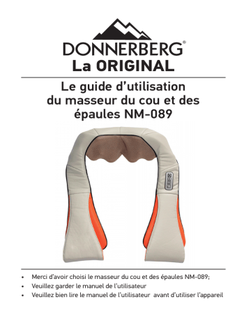 La ORIGINAL Le guide d’utilisation du masseur du cou et des épaules NM-089 • Merci d’avoir choisi le masseur du cou et des épaules NM-089; • Veuillez garder le manuel de l’utilisateur • Veuillez bien lire le manuel de l’utilisateur avant d’utiliser l’appareil Les caractéristiques techniques Nom de produit MASSEUR DU COU ET DES ÉPAULES Produit NM-089 Performance DC12V 2.0A Fréquence 30W Chronomètre 15 min Poids 1.8 kg Poids brut 2.3 kg Couleur de boîte 40*16*35.1 cm Danger: Alerte: Lent – Rapide Direction Chauffage Ce symbole montre qu’il ne faut pas jeter ce produit avec autres ordures, dans chaque pays membre de l’Union Européenne. Pour éviter la pollution de l’environnement et les actes nuisibles à la santé, veuillez bien recycler le produit. Améliorez la réutilisation des autres matériaux disponibles et retournez les appareils retournés. Veuillez suivre les étapes de la rétraction et du recyclage, ou contacter votre agent local qui peut recycler le produit de manière adaptée à l’environnement. 1 Lors de l’utilisation des appareils électriques, veuillez bien lire et suivre le manuel de l’utilisateur avant l’utilisation. Veuillez suivre le manuel de l’utilisateur pour réduire les risques de choc électrique. Avant l’utilisation ou le lavage de l’appareil veuillez débrancher l’appareil de la prise. Marche/Arrêt Le bon usage du produit Les précautions importantes Pour éviter le risque de feu, de choc électrique, de brûlures ou d’accidents : 1. L’appareil ne doit pas rester sans surveillance. Débranchez l’appareil de la prise lorsque vous ne l’utilisez pas, lorsque vous le configurez ou lorsque vous le démontez. 2. Il ne faut pas utiliser le masseur sous les couvertures ou sous les coussins. L’échauffement excessif peut causer ou augmenter le risque de feu, de choc électrique, et d’accidents. 3. Il ne faut jamais laisser les enfants et les personnes handicapées utiliser l’appareil sans votre surveillance. 4. Avant de l’utiliser, renseignez-vous sur les objectifs de l’appareil. Lors du changement des parties de l’appareil, utilisez uniquement celles de même marque que votre appareil. 5. Il ne faut jamais utiliser l’appareil si le câble ou la fiche sont endommagés, s’ils ne fonctionnent pas correctement, s’ils sont tombés, ou s’ils sont mouillés. Portez-le en révision afin de l’examiner et de le réparer. 6. Il ne faut pas tirer le câble pour déplacer l’appareil ou tirer la fiche. 7. Tenez l’appareil loin des superficies chaudes. 8. Ne branchez pas l’appareil dans les prises endommagées et veuillez-vous assurer que la prise n’est pas sale. 9. Il ne faut ajouter ou insérer rien dans les ouvertures. 10. Utilisez l’appareil uniquement chez vous. 11. N’utilisez pas l’appareil à proximité des produits en spray, ou dans les endroits où la concentration d’oxygène est augmentée. 12. Pour éteindre l’appareil, appuyez sur le bouton AUS ou OFF et débranchez l’appareil de la prise. 13. Si les enfants, les personnes en mauvaise santé ou les personnes souffrant d’un état mental altéré veulent utiliser l’appareil, ne permettez pas qu’ils l’utilisent sans surveillance d’une personne responsable pour la manière de cette utilisation et pour leur sécurité. 14. Cet appareil n’est pas un jouet et il ne faut pas laisser les enfants l’utiliser, ou même se jouer avec l’appareil sans votre surveillance. 15. Veuillez prêter l’attention lorsque vous utilisez l’option de chauffage, pour éviter le risque de feu. Veuillez prêter l’attention si votre peau est sensible à la chaleur. Les personnes ayant la peau hypersensible ne doivent pas appliquer l’appareil directement sur la peau. Les personnes souffrant d’un handicap physique ou mental, de même que les enfants, ne doivent pas utiliser l’option de chauffage sans surveillance, pour éviter chaque risque d’accidents. 16. Les personnes souffrant d’un handicap physique ou mental, de même que les personnes qui n’ont pas d’expérience de l’utilisation de cet appareil, doivent utiliser l’appareil après avoir consulté leur médecin. Veuillez garder ce manuel pour des raisons de sécurité. Ce produit est conçu uniquement pour une utilisation domestique. 2 Les précautions importantes Les moyens de résolution des problèmes Lorsque vous déplacez l’appareil d’un endroit chaud à un endroit froid, attendez une heure avant de l’utiliser. La condensation peut endommager le fonctionnement de l’appareil. L’appareil ne doit pas être sec. Numéro de série Il ne faut pas utiliser l’appareil plus de 20 minutes. 1 Il ne faut pas utiliser l’appareil avec les mains mouillées. Il ne faut pas garder l’appareil dehors. Phénomène les sons des têtes de Les sons de type masseur et des matériaux ‘’chiouchiou’’, ‘’dada’’ lors d’une utilisation habituelle Il ne faut pas utiliser l’appareil à une température dépassant 40 C. Ne branchez pas dans l’appareil le câble de raccordement ayant une tension différente de celui conçu pour votre appareil, pour éviter d’endommager ou d’enflammer l’appareil. Utilisez uniquement le câble de raccordement que vous avez reçu avec l’appareil. 2 Vous ne pouvez pas allumer l’appareil Ne fumez pas lors de l’utilisation de l’appareil. Éviter N’utilisez pas l’appareil dans un environnement humide. Il ne faut pas utiliser l’appareil après les repas, pour éviter des sensations désagréables. N’utilisez pas cet appareil avec les autres appareils. Raisons possibles Solution La solution de ce problème n’est pas nécessaire Vérifiez si la fiche ou le chargeur de voiture sont branchés correctement. Branchez la fiche et le chargeur de voiture correctement Le compte à rebours est terminé Branchez la fiche et le chargeur de voiture correctement Pour toutes autres questions veuillez contacter le service