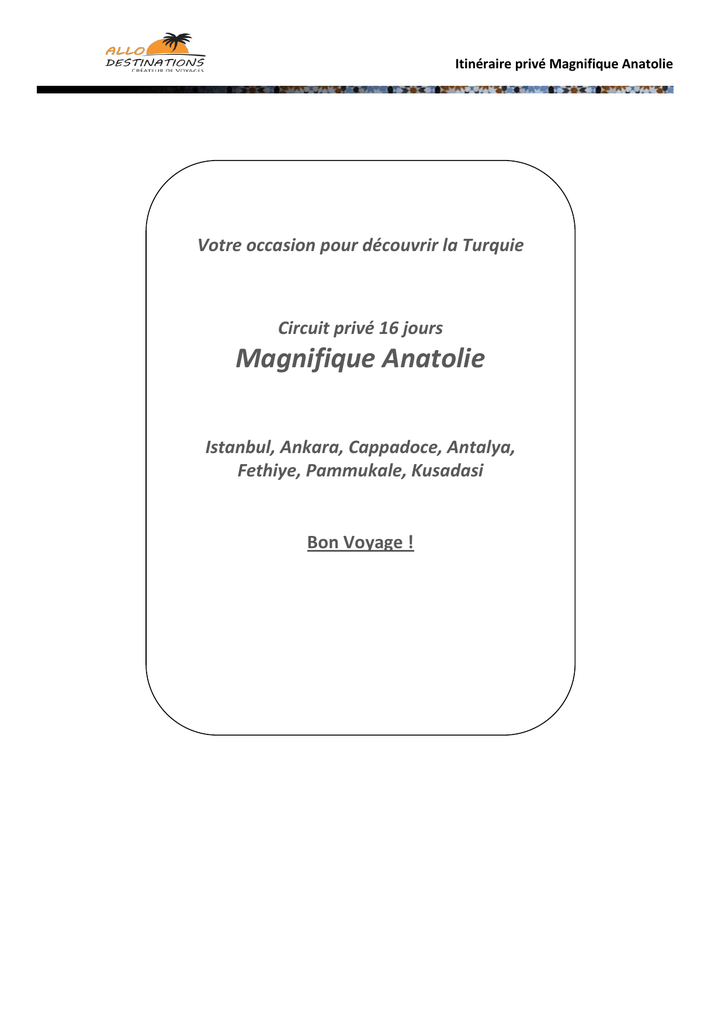 Itinéraire privé Magnifique Anatolie Votre occasion pour découvrir la Turquie Circuit privé 16 jours Magnifique Anatolie Istanbul, Ankara, Cappadoce, Antalya, Fethiye, Pammukale, Kusadasi Bon Voyage ! Itinéraire privé Magnifique Anatolie Jour 1 : Montréal / Istanbul Départ sur votre vol à destination d’Istanbul Jour 2 : Istanbul À votre arrivée à l'aéroport international d’Istanbul, accueil et assistance par notre correspondant puis transfert à l’hôtel. Souper et nuit à l’hôtel. Jour 3 : Istanbul Déjeuner à l’hôtel. Dans la matinée visite du Musée de Sainte Sophie ; ancienne basilique édifiée par l’empereur par Justinien au 6ème siècle, une des plus grandes oeuvres de l’architecture de tous les temps avec ses splendides mosaïques et son immense dôme de 55 m de haut et 31 m de diamètre et de la Mosquée Bleue (Sultanahmet) ) : pourvue d’une élégance particulière avec ses 21000 faïences bleues, 6 minarets et ses cascades de coupoles, dont la principale fait 43 m de haut et 23,5 m de diamètre. En après-midi, visite du Palais de Topkapi dont les divers édifices s’élèvent sur un promontoire dominant le Bosphore ; Résidence des sultans et joyaux de l'empire Ottoman, embelli au cours des siècles c’est aujourd’hui un riche musée aux collections très variées. Souper et nuit à l’hôtel. Jour 4 : Istanbul Déjeuner à l’hôtel. Dans la matinée, une croisière sur le Bosphore en ferry public ; fameux détroit séparant l’Europe de l’Asie et reliant par la même la Mer Noire et la Mer de Marmara. En après-midi, visite de la Citerne Basilique couvrant une superficie de 9.800 m2 et capable de contenir 100000 tonnes d’eau amenées par l’aqueduc de Valens et du Grand Bazaar formant un quartier à lui seul avec ses coupoles et ses voûtes, ses ruelles, ses carrefours à colonnes, ses 18 portes d’accès et 6 fontaines le plus vaste bazar du monde sur une surface de 200000 m2. Souper et nuit à l’hôtel. Jour 5 : Istanbul – Ankara (454 Km) Déjeuner à l’hôtel. Départ matinal vers l’Anatolie centrale à Ankara, la capitale fondée par Mustafa Kemal ATATURK. En après-midi, Visite du Musée des civilisations Anatoliennes qui abrite une riche collection d’antiquités hittites (IIe millénaire av. J.-C) ayant reçu en 1997 le prix du musée de l'année. On y voit, disposés minutieusement dans un ancien marché couvert ottoman restauré, de nombreux objets trouvés depuis la préhistoire en passant par l'âge de cuivre et l'âge de bronze. Souper et nuit à l’hôtel. Itinéraire privé Magnifique Anatolie Jour 6 : Ankara – Cappadoce (291 Km) Déjeuner à l’hôtel. Départ matinal vers la Cappadoce, un lieu privilégié pour le paléo christianisme : parmi des monticules, pics et cheminées de fées, les premiers chrétiens parsemèrent les églises et les chapelles décorées de fresques du christianisme orthodoxe. En après-midi, visite de la Forteresse d’Uchisar : un promontoire rocheux qui offre la plus belle vue panoramique sur la Cappadoce. Souper et nuit à l’hôtel. Jour 7 : Cappadoce Déjeuner à l’hôtel. Dans la matinée visite du Musée en Plein Air de Goreme : un ensemble monastique digne d’intérêt conservé sous la protection de l’UNESCO. On y découvre monastères, couvents, habitations troglodytiques complexes et églises aux parois tapissées de fresques excellemment conservées relatives à la vie du Christ. Nous vous proposerons de découvrir l’artisanat de la Cappadoce. En après-midi, visite du Village de Çavusin : petit village construit autour de deux massifs rocheux criblés d’ouvertures d‘anciennes maisons troglodytiques et balade dans la Vallée des Moines (Pasabaglari) : la nature a dotée cette vallée des plus typiques demoiselles coiffées et sans doute les plus belles de toute la Cappadoce. Souper et nuit à l’hôtel. Jour 8 : Capadoce Déjeuner à l’hôtel. Dans la matinée découverte de la Vallée de Dervent : un sol tendre facilement malléable où la nature a créé des formations multiformes. Vous y reconnaîtrez des formes en faisant vibrer votre imagination et visite d’un Caravansérail Seldjoukides. En après-midi, la visite conduira à la ville d’Avanos au bord de la rivière rouge, connue pour sa production de poterie depuis la période hittite et dans une Ville Souterraine : les premières excavations remontent à l'époque des Hittites ; elles avaient été creusées dans le but d'y loger des familles toutes entières ainsi que des animaux en cas d'invasions. Souper et nuit à l’hôtel. Jour 9 : Cappadoce – Antalya (540 Km) Déjeuner à l’hôtel. Départ matinal vers la Région Méditerranéenne à Antalya, ville fondée par le roi de Pergame, elle fut occupée tour à tour par les Romains, les Byzantins et les Seldjoukides avant de passer sous le règne des Ottomans. En après-midi, visite du Musée de Mevlana à Konya, fondateur Seldjoukide de l'ordre des derviches tourneurs. Continuation à Antalya. Souper et nuit à l’hôtel. Itinéraire privé Magnifique Anatolie Jour 10 : Antalya – Fethiye (201 Km) Déjeuner à l’hôtel. Dans la matinée découverte de la ville séduisante avec ses boulevards ombragés par des palmiers, sa marina, son pittoresque vieux quartier aux rues étroites et aux vielles maisons de bois. En après-midi, départ vers la Lycie à Fethiye : construite sur l'antique Telmessos, cette ville est dominée en toile de fond par une vingtaine de tombeaux creusés dans les parois de la montagne. Remontant au IVème siècle avant notre ère. Souper et nuit à l’hôtel. Jour 11 : Fethiye Déjeuner à l’hôtel. Journée consacrée à une magnifique Croisière en bateau. Nous nous arrêtons dans quelques criques dans lesquelles vous aurez le plaisir de la détente reposante et de baignade. Dîner à bord. Souper et nuit à l’hôtel. Jour 12 : Fethiye – Pamukkale (233 Km) Déjeuner à l’hôtel. Dans la matin