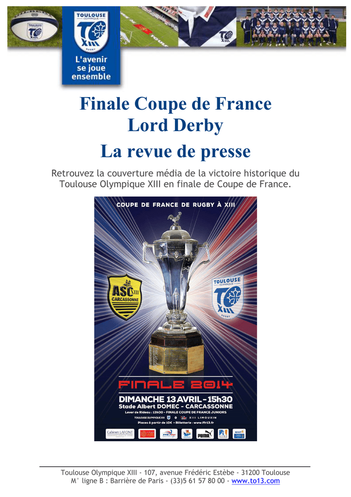 Finale Coupe de France Lord Derby La revue de presse Retrouvez la couverture média de la victoire historique du Toulouse Olympique XIII en finale de Coupe de France. Toulouse Olympique XIII - 107, avenue Frédéric Estèbe - 31200 Toulouse M° ligne B : Barrière de Paris - (33)5 61 57 80 00 - www.to13.com 3 avril 2014 – La Dépêche du Midi Toulouse Olympique XIII - 107, avenue Frédéric Estèbe - 31200 Toulouse M° ligne B : Barrière de Paris - (33)5 61 57 80 00 - www.to13.com 7 avril 2014 – Le Midi Olympique Toulouse Olympique XIII - 107, avenue Frédéric Estèbe - 31200 Toulouse M° ligne B : Barrière de Paris - (33)5 61 57 80 00 - www.to13.com 8 avril 2014 – La Dépêche du Midi Toulouse Olympique XIII - 107, avenue Frédéric Estèbe - 31200 Toulouse M° ligne B : Barrière de Paris - (33)5 61 57 80 00 - www.to13.com 9 avril 2014 – La Dépêche du Midi Toulouse Olympique XIII - 107, avenue Frédéric Estèbe - 31200 Toulouse M° ligne B : Barrière de Paris - (33)5 61 57 80 00 - www.to13.com 10 avril 2014 – La Dépêche du Midi Toulouse Olympique XIII - 107, avenue Frédéric Estèbe - 31200 Toulouse M° ligne B : Barrière de Paris - (33)5 61 57 80 00 - www.to13.com 10 avril 2014 – La Dépêche du Midi Toulouse Olympique XIII - 107, avenue Frédéric Estèbe - 31200 Toulouse M° ligne B : Barrière de Paris - (33)5 61 57 80 00 - www.to13.com 11 avril 2014 – ladepeche.fr Toulouse Olympique XIII - 107, avenue Frédéric Estèbe - 31200 Toulouse M° ligne B : Barrière de Paris - (33)5 61 57 80 00 - www.to13.com 11 avril 2014 – La Dépêche du Midi Toulouse Olympique XIII - 107, avenue Frédéric Estèbe - 31200 Toulouse M° ligne B : Barrière de Paris - (33)5 61 57 80 00 - www.to13.com 11 avril 2014 – sportchoc.tv Coupe : Carcassonne mène 2 à 0 Rares ont été les finales de Coupe entre Carcassonne et Toulouse. Deux seulement : les Audois l'ont emporté 5-0 en 1963, puis 9-2 en 1968. La troisième manche, ce dimanche (15h30) au stade AlbertDomec, s'annonce tout aussi équilibrée... Photo Alain Ragu - RMD Agency Les Canaris s'avancent vers la finale, la 26è de leur histoire, en Coupe Lord Derby, avec un palmarès long comme un jour sans pain : le trophée est passé à 13 reprises entre leurs mains, la dernière fois en 2012, face à Pia (14-12) Quatre ans plus tôt, en 2009, ils avaient déjà levé les bras au ciel (18-16 aux dépens de Limoux), mettant dès lors fin à 19 ans de disette, eux qui n'avaient plus connu l'ivresse des cimes, dans cette compétition, depuis 1990 et leur victoire 22-8 contre Saint-Estève. Car, en suivant, dame Coupe avait successivement préféré les bras de Limoux (39-12 en 1996), de l'UTC (36-24 en 2004), et de Pia (30-14 en 2007). Toulouse : six finales, autant de défaites Tout cela dit juste pour la petite histoire, et c'est la grande qu'aimerait bien écrire le TO, lui dont le palmarès tient sur un bout de papier plié en quatre : six finales perdues (7-3 face au XIII Catalan en 1939, 16-10 contre Roanne en 1962, 5-0 devant Carcassonne en 1963, 10-2 face à Villeneuve/Lot en 1964, 9-2 contre Carcassonne en 1968, 23-8 devant le XIII Catalan en 1976). Voilà une motivation supplémentaire pour les hommes de Sylvain Houlès, donnés légèrement favoris en raison de leur parcours joliment linéaire, cette saison en championnat, et auteurs d'un spectaculaire 5/6 dernièrement dans la Poule des As. Favoris, oui, mais sûrs de rien. D'abord parce que Carcassonne jouera à la maison, ensuite - et peutêtre surtout - car les protégés de Vincent Banet et de Jean-François Albert se sont refaits une santé dans la phase II du championnat, collectionnant les victoires, eux qui pendant de longs mois rongeaient leur frein en s'apitoyant à juste titre sur une infirmerie exagérément garnie. Carcassonne : trois finales de Coupe à Domec, toutes perdues Autant dire que Carcassonne possède les armes capables de déjouer le pronostic, et ainsi de labourer victorieusement pour la première fois son jardin de Domec, en finale de Coupe, après y avoir trébuché en 1973 (8-22 devant Saint-Gaudens), 2004 (24-39 contre l'UTC), et 2007 (14-30 face à Pia). Toulouse Olympique XIII - 107, avenue Frédéric Estèbe - 31200 Toulouse M° ligne B : Barrière de Paris - (33)5 61 57 80 00 - www.to13.com Une chose au moins est sûre, avec sur le pré huit joueurs qui composaient le XIII de l'année 2013 (Aaron Wood, Kane Bentley, Sébastien Planas, Mark Kheirallah, Clément Soubeyras, Troy Savage, Maxime Grésèque, Vinnie Anderson), le talent fleurira partout sur la pelouse, et il y a fort à parier que l'équipe la plus minutieuse dans les détails, la mieux organisée en défense, la plus adroite balle en mains, peut-être aussi la plus patiente, décrochera la timbale. Une timbale en argent qui vaudra de l'or pour Carcassonne, auteur du doublé Coupe - Championnat en 2012, à la rue en début de saison, et désormais de nouveau sur une voie royale, comme pour Toulouse, qui cette année n'a pratiquement jamais quitté l'autoroute du succès. LEUR PARCOURS EN 2013-2014 Toulouse Vainqueur de Baho 38-22 en 1/8è, de St Estève-XIII Catalan 22-18 en 1/4, de Palau 52-16 en 1/2. Carcassonne Vainqueur de Lézignan 26-20 en 1/8è, de Lyon-Villeurbanne 46-14 en 1/4, d'Avignon 26-6 en 1/2. LEUR PALMARÈS EN COUPE Carcassonne 25 participations à la finale, 13 victoires. Toulouse 6 participations à la finale. Toulouse Olympique XIII - 107, avenue Frédéric Estèbe - 31200 Toulouse M° ligne B : Barrière de Paris - (33)5 61 57 80 00 - www.to13.com 12 avril 2014 – ladepeche.fr Toulouse Olympique XIII - 107, avenue Frédéric Estèbe - 31200 Toulouse M° ligne B : Barrière de Paris - (33)5 61 57 80 00 - www.to13.com 12 avril 2014 – toulouseblog.fr Toulouse Olympique XIII - 107, avenue Frédéric Estèbe - 31200 Toulouse M° ligne B : Barrière de Paris - (33)5 61 57 80 00 - www.to13.com 13 avril 2014 – La Dépêche du Midi Toulouse Olympique XIII