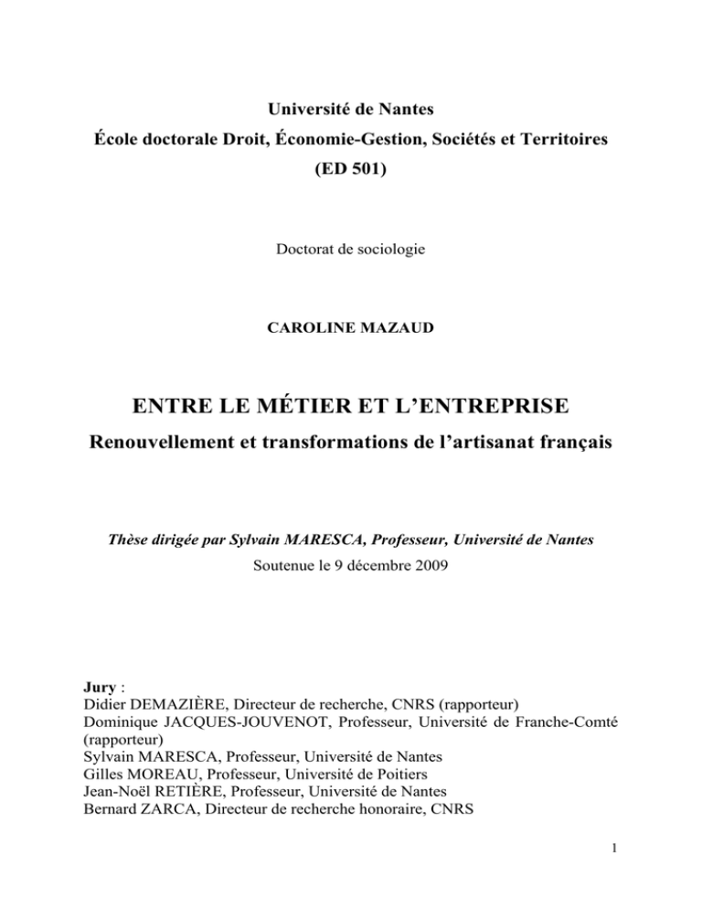 Université de Nantes École doctorale Droit, Économie-Gestion, Sociétés et Territoires (ED 501) Doctorat de sociologie CAROLINE MAZAUD ENTRE LE MÉTIER ET L’ENTREPRISE Renouvellement et transformations de l’artisanat français Thèse dirigée par Sylvain MARESCA, Professeur, Université de Nantes Soutenue le 9 décembre 2009 Jury : Didier DEMAZIÈRE, Directeur de recherche, CNRS (rapporteur) Dominique JACQUES-JOUVENOT, Professeur, Université de Franche-Comté (rapporteur) Sylvain MARESCA, Professeur, Université de Nantes Gilles MOREAU, Professeur, Université de Poitiers Jean-Noël RETIÈRE, Professeur, Université de Nantes Bernard ZARCA, Directeur de recherche honoraire, CNRS 1 Entre le métier et l’entreprise. Renouvellement et transformations de l’artisanat français. Cette thèse analyse les changements dans l’organisation du travail artisanal et dans l’accès au statut d’artisan depuis les années 1980, moment où la sociologie a cessé de prendre ce groupe pour objet de recherche. Située à la croisée de plusieurs sociologies instituées (groupes professionnels, travail et mobilités sociales), elle combine différentes méthodes d’investigation : recueil et exploitation de données statistiques, observation et analyse de productions institutionnelles et entretiens avec des artisans sortants (âgés de 50 ans et plus) et entrants (installés depuis 3 à 5 ans) dans cinq communes de la Loire-Atlantique. Cette recherche révèle que le modèle du métier, quasi unique dans les années 1980, fait place à une variété de cas qui déstabilisent ce qui fondait la régulation du travail artisanal et la reproduction traditionnelle du groupe des artisans. Elle pointe en effet la variété dans les pratiques professionnelles, les savoirs mobilisés et dans les modes d’acquisition de ces savoirs. L’accès au statut d’artisan s’est aussi diversifié : des reconvertis (décrocheurs de l’Université ou ex-cadres) intègrent aujourd’hui le secteur des métiers. Contrairement à ce qui prévalait il y a une trentaine d’années, les artisans qui s’installent désormais ne sont majoritairement pas passés par un statut d’ouvrier et leurs parents sont plus souvent issus de catégories sociales moyennes et supérieures. On assiste finalement à un mouvement d’éloignement entre les classes populaires et les petits indépendants. Mots-clés : Artisan, entreprise, métier, transformations Between craft and business. Renewal and transformations of French craft industry. This thesis analyses the modifications that occurred in the craftwork organization and in the access to the craftsman status since the 1980s’, moment when Sociology stopped taking this group as a research subject. Standing at the crossroads of several institutionalized sociologies (professional groups, labour and social mobility), it combines different methods of investigation : the collection and exploitation of statistics, the observation and analysis of institutions’ documents and interviews with outgoing (50 years old and more) and incoming (set up for 3 to 5 years) craftsmen in five Loire-Atlantique’s communes. This research reveals that the craft pattern, almost unique in the 1980s’, leaves place to a diversity of cases which destabilizes what used to found the craftwork’s regulation and the traditional reproduction of the craftsmen group. It shows indeed the variety in the professional practices, the knowledge mobilized and in the ways this knowledge is acquired. The access to the craftsman status has also been diversified : people who dropped out of University or ex-executives retrain in the craft area. Contrary to what prevailed about thirty years ago, craftsmen who set up from now on did not in the majority go through a worker status and their parents are more often from the middle or upper social classes. We are finally witnessing a growing distance between the working classes and the small self-employed workers. Key-Words : Craftsman, Business, Craft, Transformations Discipline : Sociologie Centre nantais de sociologie (EA 3260) Chemin de la Censive du Tertre — BP 81 227 — 44 312 Nantes cedex 3 2 À mes parents, 3 Remerciements Mes remerciements vont d’abord aux artisans qui ont accepté de m’ouvrir les portes de leurs ateliers et de leurs domiciles et pris le temps de me livrer le récit de leurs parcours. Merci à la Chambre de métiers et de l’artisanat de Loire-Atlantique pour sa coopération, et en particulier à l’équipe entourant Michel Babicky, responsable du service Études et développement des entreprises, pour m’avoir facilitée l’accès aux sources extraites du Répertoire informatique des métiers. Merci également à Véronique Careil, salariée permanente du service Actions Économiques de la Chambre régionale des métiers et de l’artisanat des Pays de la Loire, pour avoir mis à ma disposition des données chiffrées et des études, notamment réalisées dans le cadre de l’Observatoire régional de l’artisanat. Je remercie aussi chacun des représentants des organisations professionnelles qui m’ont accueillie à l’occasion de différents entretiens : Élisabeth Fessart, Martine Lalande, Alain Pichavant, Marc Nédélec, Martine Guérin et Jean-Yves Chevalier. Cette thèse n’aurait par ailleurs jamais pu voir le jour sans le soutien institutionnel qui l’a encadrée. Je tiens ainsi à remercier la MSH Ange Guépin qui m’a offert les conditions matérielles favorables à la rédaction de ma thèse. Merci aux membres du Cens, mon laboratoire de recherche, qui, à l’occasion de séminaires ponctuels ou de discussions plus informelles, m’ont permis de mûrir mes idées ou de m’aiguiller sur de nouvelles pistes de recherche. Je tiens tout particulièrement à exprimer ma reconnaissance à Annie Collovald, Virginie Grandhomme, Ève Meuret-Campfort, Fabienne Pavis et Jean-Noël Retière pour leurs lectures attentives et leur