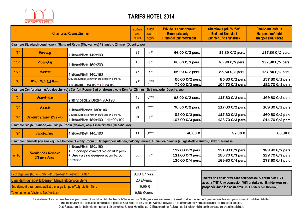 TARIFS HOTEL 2014 Chambres/Rooms/Zimmer surface area Fläche étage stairs Stock Prix de la chambre/nuit Room price/night Preis des Zimmer/Nacht Chambre + pdj "buffet" Bed and Breakfast Zimmer und Frühstück Demi-pension/nuit Halfpension/night Halbpension/Nacht Chambre Standard (douche,wc) / Standard Room (Shower, wc) / Standard Zimmer (Dusche, wc) n°5* Riesling n°6* Pinot-Gris n°7* Muscat n°8* Pinot-Noir 2/3 Pers. 1 lit/bed/Bett 140x190 1 lit/bed/Bett 160x200 1 lit/bed/Bett 140x190 15 1er 66,00 €/2 pers. 85,80 €/2 pers. 137,80 €/2 pers. 15 1er 66,00 €/2 pers. 85,80 €/2 pers. 137,80 €/2 pers. 15 1er 66,00 €/2 pers. 85,80 €/2 pers. 137,80 €/2 pers. 17 3ème 66,00 €/2 pers. 75,00 €/3 pers. 85,80 €/2 pers. 104,70 €/3 pers. 137,80 €/2 pers. 182,70 €/3 pers. Double/Doppelzimmer ou/or/oder 3 Pers. 1 lit/bed/Bett 180x190 + 1 lit 90x190 Chambre Confort (bain et/ou douche,wc) / Confort Room (Bad or shower, wc) / Komfort Zimmer (Bad und/oder Dusche, wc) n°2* Framboise n°3* Kirsch n°4* Gewurztraminer 2/3 Pers. n°9* Pinot-Blanc 2 lits/2 beds/2 Betten 90x190 1 lit/bed/Betten 180x190 Double/Doppelzimmer ou/or/oder 3 Pers. 1 lit/bed/Bett 180x190 + 1lit 90x190 Chambre Single (douche,wc) / single Room (shower, wc) / Einzelzimmer (Dusche, wc) 1 lit/bed/Bett 140x190 24 2ème 98,00 €/2 pers. 117,80 €/2 pers. 169,80 €/2 pers. 24 2ème 98,00 €/2 pers. 117,80 €/2 pers. 169,80 €/2 pers. 24 1er 98,00 €/2 pers. 107,00 €/3 pers. 117,80 €/2 pers. 136,70 €/3 pers. 169,80 €/2 pers. 214,70 €/3 pers. 11 3ème 48,00 € 57,90 € 83,90 € Chambre Familiale (cuisine équipée/balcon) / Family Room (fully equipped kitchen, balcony terrace) / Familien Zimmer (ausgestattete Küche, Balkon-Terrasse) n°10 Sorbier des Oiseaux 2/3 ou 4 Pers. 1 lit/bed/Bett 180x190 + un canapé convertible en lit 2 pers. + Une cuisine équipée et un balcon terrasse Petit déjeuner (buffet) / "Buffet" Breakfast / Früstück "Buffet" Dîner demi-pension/Halfpension Menu/Halbpension Menu Supplément pour animaux/Extra charge for pets/Aufpreis für Tiere Taxe de séjour/Visitor's Tax/Kurtaxe 50 er 1 9,90 € /Pers. 26 €/Pers. 10,00 € 112,00 €/2 pers. 121,00 €/3 pers. 130,00 €/4 pers. 131,80 €/2 pers. 150,70 €/3 pers. 169,60 €/4 pers. 183,80 €/2 pers. 228,70 €/3 pers. 273,60 €/4 pers. Toutes nos chambres sont équipées de tv écran plat LCD avec la TNT. Une connexion Wifi gratuite et illimitée vous est proposée dans les chambres (sauf Sorbier des Oiseaux). 0,88 €/pers Le restaurant est accessible aux personnes à mobilité réduite. Notre hôtel étant sur 3 étages sans ascenseur, il n'est malheureusement pas accessible aux personnes à mobilité réduite. The restaurant is accessible for disabled people. Our hotel is on 3 floors without elevator, it is unfortunately not accessible for disabled people. Das Restaurant ist behindertengerecht eingerichtet. Unser Hotel ist auf 3 Etagen ohne Aufzug, es ist leider nicht behindertengerecht eingerichtet.