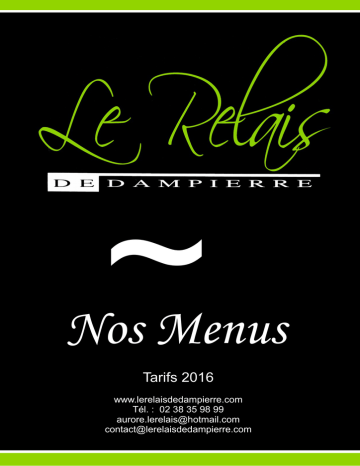 ~ Nos Menus Tarifs 2016 www.lerelaisdedampierre.com Tél. : 02 38 35 98 99 [email protected] [email protected] Menu Dampierre :34,00 € TTC Boissons, service , nappage, serviettes, verrerie et vaisselle compris Apéritif Kir pétillant ou cocktail maison + 1 canapé, 1 verrine et 1 cuillère gourmande Entrée au choix Feuilleté de blancs de volaille émincés sauce forestière Terrine de gibier aux champignons et confiture d’oignons Cassolette de queues d’écrevisses en croute de feuilletage Salade de queues d’écrevisses, copeaux de foie gras et agrumes Terrine de saumon et sandre, chantilly aux fines herbes Salade de gésiers aux lardons, croutons, noix et magret fumé Terrine marine aux fruits de mer et poissons et sa vinaigrette au xérès Emincé d’avocat, crevettes, surimi, saumon fumé et sauce cocktail Cassolette de ris de veau et champignons en croûte de feuilletage Plat au choix Cuisse de canard rôtie, jus de canard et pêches émincées Sauté d’agneau aux champignons Filet de sandre sauce à l’oseille Filet de canette aux pleurotes Sauté de veau à l’ancienne Civet de sanglier et sa garniture d’automne Paupiette de saumon et sandre aux petits légumes sauce bisque Trio de fromages et salade de saison Dessert au choix Tarte Crumble fruits rouges pommes et noix Charlotte poire, miel et nougat Tarte Tatin et boule de glace pralinée Charlotte aux fruits rouges - pistache et son coulis Vacherin glacé framboise citron et coulis de fruits rouges Charlotte poire chocolat et crème anglaise Forêt noire et sa crème anglaise Café, eau minérale et pain Vins servis Colombelle blanc Château Les Belles Murailles rouge Menu Sully : 38,00 € TTC Boissons, service , nappage, serviettes, verrerie et vaisselle compris Apéritif Kir pétillant ou cocktail maison pétillant + 2 canapés, 1 verrine et 1 cuillère gourmande Entrée au choix Salade périgourdine (Gésiers confits, lardons, noix, croûtons, magret fumé, manchon de canard, foie gras) Salade gâtinaise (Cuisses de caille confites, filets de caille, pignons de pin, œufs de caille, tomates, vinaigrette au miel, croûtons et magret fumé) Marbré de foie gras maison aux figues et sa brioche Salade de Saint Jacques tièdes aux agrumes et saumon fumé maison Salade Océane (Saint Jacques, avocat, crevettes roses, saumon fumé et légumes croquants) Cassolette de Saint Jacques et gambas sauce crustacé Trou Orléanais, Normand, Antillais ou Colonel Plat au choix Pavé de biche sauce grand veneur Médaillon de Lotte sauce poivre vert ou sauce Américaine Carré de Veau braisé sauce Forestière Filet de bœuf rôti sauce périgueux Suprême de volaille de l’Orléanais au vinaigre Pavé de sandre à l’unilatéral sauce vigneronne Carré d’agneau à la Solognote Magret de canard rôti au miel du Gâtinais Assortiment de fromages et salade de saison Dessert au choix Charlotte fruits rouge et pistaches Bavarois aux fruits exotiques et son coulis Charlotte chocolat noir et chocolat blanc, crème anglaise Assiette gourmande surprise de 5 desserts Nougat glacé maison, crème anglaise et coulis de framboises Tarte Tatin maison et sa boule de glace caramel fleur de sel Forêt Noire Café, eau minérale et pain Vins servis Colombelle blanc Château Les Belles Murailles rouge Menu Orléans : 44,00 € TTC Boissons, service , nappage, serviettes, verrerie et vaisselle compris Apéritif Kir pétillant ou cocktail maison + 1 verrine et 1 cuillère gourmande Entrée au choix Terrine de saumon et sandre aux petits légumes à la crème de ciboulette Feuilleté de volaille forestier Médaillon de saumon et sandre froid à la Parisienne Salade Océane (avocat, agrumes, julienne de légumes, saumon froid et crevettes) Terrine de gibier maison et confiture d’oignons Salade aux gésiers confits lardons et croûtons Demi avocat aux crevettes et saumon sauce cocktail Cassolette de volaille façon financière 2ème entrée au choix Paupiette de saumon aux petits légumes sauce bisque de homard Aile de raie et purée à l’ail, sauce aux herbes Cassolette de fruits de mer en croute de feuilletage Escalope de sandre sauce à l’oseille Filet de lieu noir fumé crème et petits légumes Trou Orléanais, Normand, Antillais ou Colonel Plat au choix Sauté de kangourou au poivre vert Cuisse de canard rôtie aux pêches et jus de canard Civet de gibier maison Sauté de veau façon cocotte Grand-Mère Suprême de pintadeau à la forestière Trio de fromages et salade de saison Dessert au choix Bavarois poire cassis et son coulis Charlotte poire miel nougat Vacherin glacé mangue-citron vert ou fruits rouges-citron Charlotte aux 2 chocolats et sa crème anglaise Tarte fine aux pommes et sa boule de glace vanille Charlotte aux fruits rouges et son coulis Café, eau minérale et pain Vins servis Colombelle blanc Château Les Belles Murailles rouge Menu Paris : 54,00 € TTC Boissons, service , nappage, serviettes, verrerie et vaisselle compris Apéritif Kir pétillant ou cocktail maison pétillant ou pétillant rosé + 1 verrine, 1 cuillère gourmande et 1 canapé Entrée au choix Salade Périgourdine Terrine de brochet aux queues d’écrevisses sauce cocktail Marbré de foie gras aux figues Salade de saint Jacques aux agrumes et saumon fumé Salade Gâtinaise 2ème entrée au choix Cassolette de Saint Jacques Filet de sandre sauce à l’oseille Cassolette aux fruits de mer Cassolette d’escargots forestière Assiette de saumon fumé par nos soins Trou Orléanais, Normand, Antillais ou Colonel Plat au choix Pavé de biche sauce grand veneur Gibelotte de canard rôtie aux pêches Carré de Veau sauce Bigarade Pavé de sandre à l’unilatérale sauce vigneronne Carré d’agneau rôti à la provençale Magret de canard rôti au miel du Gâtinais Assortiment de fromages et salade de saison ou 1/2 crottin de chèvre chaud Dessert au choix Bavarois aux fruits exotiques et son coulis Charlotte poire chocolat, crème anglaise Assiette gour
