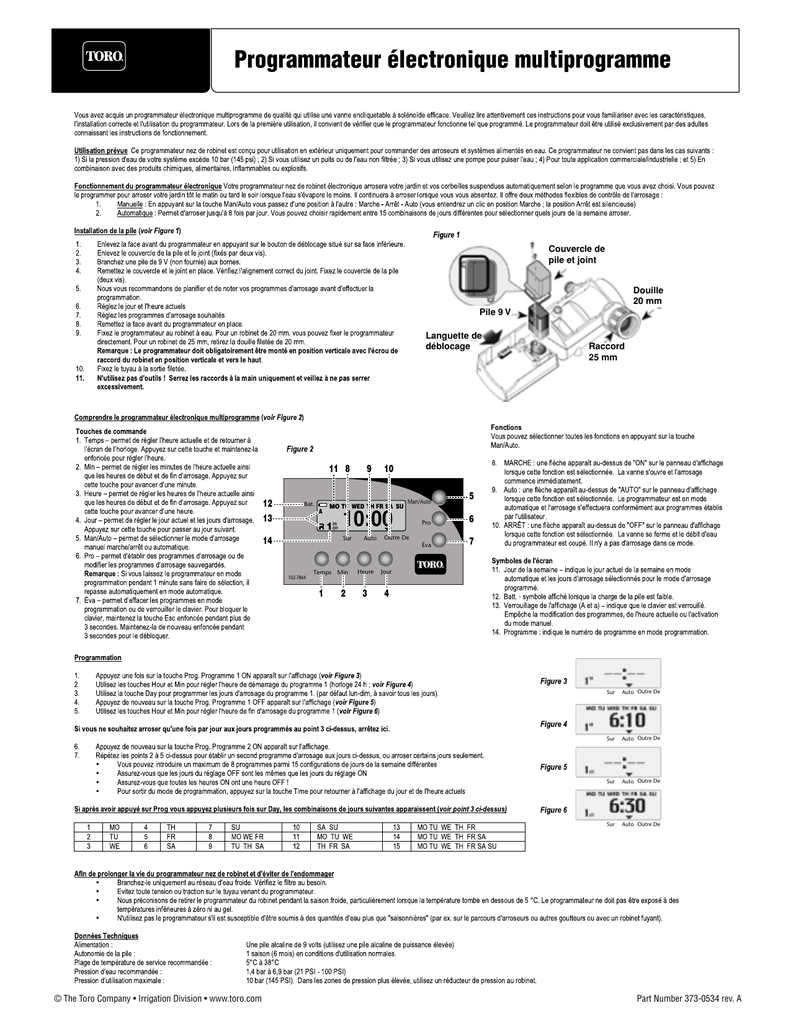 Programmateur électronique multiprogramme Couvercle de pile et joint Douille 20 mm Pile 9 V Languette de déblocage 11 8 12 13 Bat. A Temps Min 1 © The Toro Company • Irrigation Division • www.toro.com 10:00 Sur 102-7864 10 MO TU WED TH FR SA SU 1ONOFF 14 9 2 Auto Raccord 25 mm Man/Auto Outre De Heure Jour 3 4 5 Pro 6 Éva 7 Sur Auto Outre De Sur Auto Outre De Sur Auto Outre De Sur Auto Outre De Part Number 373-0534 rev. A