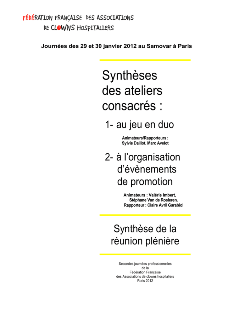 Journées des 29 et 30 janvier 2012 au Samovar à Paris Synthèses des ateliers consacrés : 1- au jeu en duo Animateurs/Rapporteurs : Sylvie Daillot, Marc Avelot 2- à l’organisation d’évènements de promotion Animateurs : Valérie Imbert, Stéphane Van de Rosieren. Rapporteur : Claire Avril Garabiol Synthèse de la réunion plénière Secondes journées professionnelles de la Fédération Française des Associations de clowns hospitaliers Paris 2012 1- Jeu en duo Liste des participants Noms, prénoms Structure Sophie Maucourt Camille Trébuchet Marie-Florence Antoine Linda Caron Séverine Rage Dorothée Delcourt Sandrine Turlure Marc Fievet Lucie Jacquemart Aurélie Lopez Perle Delorme Sadrine Chervet Nadien Pons Isabelle Bellaire Willy Masson Guy Lafrance Guillaume Van't Hoff Marie-Laure Marchand Dominique Vissuzaine Catherine Perès Edith Baudoin Trond Erik Vassdal Isabelle Bazin Carole Devillers Emmanuelle Rivier 1 2 3 Soleil 1 2 3 Soleil Bises de clowns Les clownologues Les clownologues Clowns de l'Espoir Clowns de l'Espoir Clowns de l'Espoir Clowns de l'Espoir Les Clowns Stétoscopes Clowns Z'Hôpitaux Hôpiclowns Genève Rire Le Rire Médecin - Nancy Le Rire Médecin - Nancy Le Rire Médecin - Paris Le Rire Médecin - Paris Le Rire Médecin – Nantes Le Rire Médecin – Nantes Soleil Rouge La Vie en clown Vivre aux éclats Vivre aux éclats Vivre aux éclats Vivre aux éclats Brice Goldschmidt Bénedicte Monnaux Aline Boucraut Julia Guillaud et tous ceux qui n'avaient pas écrit leurs noms sur la fiche prévue à cet effet! L’association Ch’ti Clown de Lille, absente, nous a retransmis son travail de réflexion sur le DUO. Leurs réflexions ont été mentionnées et intégrées à la synthèse. Introduction Lorsque les cinq associations fondatrices de la Fédération Française des Associations de Clowns Hospitaliers ont pris l’initiative de réunir des « Journées professionnelles », deux thèmes de travaux sont aussitôt apparus comme cruciaux. Le premier enjeu nous a semblé être le professionnalisme des comédiens qui interviennent dans les lieux de soins et donc la question de leur formation comme de leur rémunération. C’est au traitement de cette question que se sont employées les « Premières journées de la Fédération » qui se sont déroulées l’an dernier à Lille. Relié à l’enjeu du professionnalisme mais ne se confondant pas avec lui, la qualité nous a paru un second enjeu primordial. C’est pourquoi nous avons choisi d’y consacrer, cette année, à Paris, les « Secondes Journées de la Fédération ». A l’intérieur de la vaste problématique de la qualité, nous avons choisi de nous concentrer sur la question du jeu en duo dans la mesure où les fondateurs ont choisi de faire de ce dispositif de jeu à deux comédiens un critère pour pouvoir adhérer à la Fédération. Ce faisant, notre souhait n’est nullement de nous livrer aux délices de la polémique ni de lancer quelque anathème que ce soit. Il s’agit plutôt d’explorer du mieux que l’on pourra les tenants et les aboutissants de cette question du duo, sans aucunement caricaturer le jeu en solo. C’est pourquoi les travaux ont été scindés en deux parties : 1- Les points forts du duo 2- Les points de vigilance à avoir et l’expertise des vertus du solo C’est la synthèse de ces travaux - qui ont réunis pendant quatre heures une cinquantaine de participants – que l’on voudra bien trouver ci-après. 1- Les points forts du jeu en duo En amont des journées, et dans la perspective de facilité les travaux, la Fédération avait adressé à l’ensemble des inscrits un document qui leur proposait d’indiquer les avantages du jeu en duo en distinguant par catégorie de « bénéficiaires » : enfants, soignants, parents, comédiens. Les participants ont tenu à marquer que cette compartimentation pouvait être pernicieuse en laissant entendre que les bienfaits qu’en tiraient les comédiens ne bénéficiaient qu’à eux alors que les autres catégories, à l’évidence, en tiraient également avantage. Ce sont donc les bénéfices « transversaux » qui ont d’abord été mis en avant : • Le jeu en duo permet avant une « triangulation » qui ouvre le jeu et permet à tous les présents, dans une chambre, de choisir la place et le rôle qui lui convient (actif, passif, spectateur, metteur en scène, etc.) • Le jeu à deux est un dispositif favorisant la parité homme-femme, parité qui favorise elle-même les mécanismes d’identification chez les enfants • Le fait d’avoir un partenaire permet de disposer d’un « garde-fou », quelqu’un qui va vous rappeler les règles d’hygiène, les mesures prudentielles, qui va également constituer un tiers-témoin en cas de mise en cause par un enfant, un parent ou un soignant. Sur le plan éthique, le partenaire peut également fonctionner comme un « températeur de transgression » • Etre deux permet également d’assurer une meilleure écoute de ce que disent les personnes et notamment, dans la transmission, de ce que disent les soignants. Ces éléments transversaux ayant été commentés et illustrés, les participants ont pu cerner l’intérêt du duo pour le jeu et l’ « entretien » des comédiens : A- L’intérêt pour le jeu théâtral • Il y a une dynamique du jeu à deux qui est incomparable • Le duo est stimulant, relançant, on évite le machinal et le machinique. Il oblige à hausser le niveau de jeu. • Le duo permet de la variété, de la diversité dans les propositions artistiques. • Il évite La répétition, il permet de ne pas tourner en rond. • Le duo, c’est la base des combinaisons relationnelles : c’est l’amour, c’est le conflit, c’est être deux, c’est la vie à deux avec le blanc et l’auguste. Le duo, c’est le duel. • Le duo permet de tirer les leçons du jeu, de réfléchir et d’apprendre, d’améliorer, de s’améliorer. • Il perme