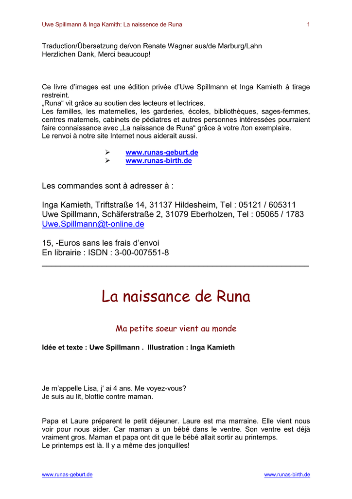 Uwe Spillmann & Inga Kamith: La naissence de Runa 1 Traduction/Übersetzung de/von Renate Wagner aus/de Marburg/Lahn Herzlichen Dank, Merci beaucoup! Ce livre d’images est une édition privée d’Uwe Spillmann et Inga Kamieth à tirage restreint. „Runa“ vit grâce au soutien des lecteurs et lectrices. Les familles, les maternelles, les garderies, écoles, bibliothèques, sages-femmes, centres maternels, cabinets de pédiatres et autres personnes intéressées pourraient faire connaissance avec „La naissance de Runa“ grâce à votre /ton exemplaire. Le renvoi à notre site Internet nous aiderait aussi. ! ! www.runas-geburt.de www.runas-birth.de Les commandes sont à adresser à : Inga Kamieth, Triftstraße 14, 31137 Hildesheim, Tel : 05121 / 605311 Uwe Spillmann, Schäferstraße 2, 31079 Eberholzen, Tel : 05065 / 1783 [email protected] 15, -Euros sans les frais d’envoi En librairie : ISDN : 3-00-007551-8 __________________________________________________________ La naissance de Runa Ma petite soeur vient au monde Idée et texte : Uwe Spillmann . Illustration : Inga Kamieth Je m’appelle Lisa, j‘ ai 4 ans. Me voyez-vous? Je suis au lit, blottie contre maman. Papa et Laure préparent le petit déjeuner. Laure est ma marraine. Elle vient nous voir pour nous aider. Car maman a un bébé dans le ventre. Son ventre est déjà vraiment gros. Maman et papa ont dit que le bébé allait sortir au printemps. Le printemps est là. Il y a même des jonquilles! www.runas-geburt.de www.runas-birth.de Uwe Spillmann & Inga Kamith: La naissence de Runa 2 Maman n’a presque plus de place derrière le lavabo. Parfois je sens comme notre bébé bouge dans son ventre. Il lui arrive de gigoter beaucoup. Comme moi. Au petit déjeuner maman ne mange rien, même pas un pain au miel. Elle dit que son ventre lui fait mal. „Ca va sans doute bientôt commencer“, dit-elle à papa. Laure et moi nous disons : „Hourra, le bébé va venir aujourdhui!“ „Attendons d‘abord si les douleurs augmentent“ répond maman, „peut-être que c’est une fausse alerte“. Papa joue au cirque avec moi. Maman ne regarde même pas. Pourtant nous sommes acrobates et nous réalisons des tours dangereux! Ma marraine a beaucoup de temps pour moi. Le soleil brille et Laure joue avec moi et Fabio. Fabio est mon ami, lui aussi a 4 ans. Nous aimons surtout construire dans le sable des étables pour nos animaux en bois. J‘ en ai trois, Fabio en a cinq, il a même un ânon. Quand je veux aller prendre mon moule pour pâté de sable, il faut que je sois calme. Dans le corridor maman téléphone à Karin. C’est notre sage-femme. Je viens de finir de me déguiser quand je vois la voiture rouge de Karin. „Ca y est !“ dit Fabio. „ Votre sage-femme arrive !“ Aujourd’hui elle porte une grande valise multicolore. Karin est gentille, un jour elle m’a offert un caillou bleu et parfois j’ai le droit de jouer avec son stéthoscope. Nous lui disons „Salut Karin! „, elle rit seulement et rentre vite dans la maison. Parfois, j’entends maman gémir et elle respire très fort. C’est tout à fait normal disent papa et la sage-femme. Moi, je me sens un peu bizarre. Heureusement que Laure est avec moi – et Fabio bien sûr. Car maintenant nous jouons à la marchande dehors. Sur la chaise, il y a le cétégé de Karin. Avec cet appareil, on peut entendre les battements de coeur du bébé et il y a du papier qui en sort comme de notre fax. Heureusement nous avons des toilettes-visiteurs. Car je ne peux pas aller dans la salle de bain, parce que maman est dans la baignoire et que la sage-femme lui masse le dos. L’eau chaude et les massages font du bien à maman pendant les contractions. Papa caresse le ventre de maman et lui masse le dos. Papa se donne beaucoup de peine pour aider maman à accoucher. Il a fait la même chose quand moi je suis née. C‘était autrefois, mais je le sais, parce que nous avons des photos dans notre album. www.runas-geburt.de www.runas-birth.de Uwe Spillmann & Inga Kamith: La naissence de Runa 3 Tout rond, le ventre de maman prend appui sur le ballon-sauteur et son dos peut se détendre. Je prends toujours le ballon pour sauter, mais seulement quand quelqu’un me tient. Fabio n’a plus voulu jouer avec moi parce qu’il voulait toujours mon vélo. Alors je suis retournée dans la maison avec Laure. Juste au moment, où le bébé va vraiment sortir du ventre de maman. Dans la chambre à coucher, il fait presque sombre et ca sent tout autrement que d’habitude. Le chauffage est ouvert pour que le bébé trouve une chaleur douce et agréable. Oh! Maman a crié très fort. Et ensuite nous entendons le bébé! „Ouêêêhhh!“ fait-il mais quand maman le prend dans ses bras, il se calme vite. Maman et papa et Laure pleurent un peu, parce qu’ils sont si heureux. Même Karin verse quelques larmes. De bonheur, parce que maintenant, j’ai une petite soeur. Hourra, j’ai une petite soeur! Nous aidons à couper le cordon ombilical. Il faut faire très attention à ce que les pinces soient bien placées, a dit Karin. Ma petite soeur est mesurée, pesée, baignée et langée. Et j’ai le droit d’aider. Je sais y faire, car je suis une grande soeur maintenant. Karin range ses affaires de sage-femme. Il y a beaucoup de place dans une mallette de sage-femme. J’ai une mallette de médecin mais elle est plus petite. Karin met les couches en papier dans un sacpoubelle. Bientôt, nous allons tous boire à la santé de ma petite soeur. Les adultes boivent du champagne et moi, je bois du champagne pour enfants. C’est en réalité de l’eau minérale, mais dans mon verre, ca pétille aussi joliment que chez les autres. „Félicitations“ disent-ils tous, car c’est aussi un anniversaire. Quand la sage-femme rentre chez-elle, il fait déjà sombre. Maman, papa et moi, nous ne pouvons nous arrêter d’admirer notre bébé. Nous regardons sans cesse la petite Runa. Oui, ma petite soeur s
