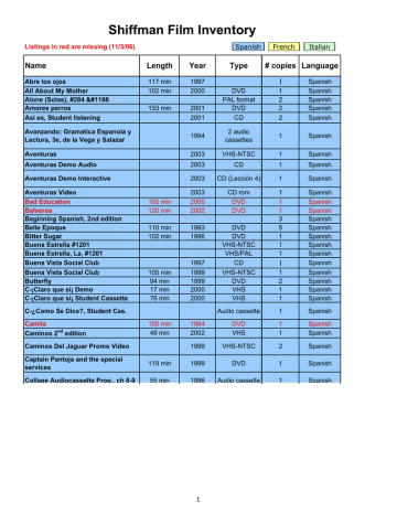 Shiffman Film Inventory Spanish Listings in red are missing (11/3/06). Name Length Year Abre los ojos All About My Mother Alone (Solas), #284 Ү Amores perros Así es, Student listening 117 min 102 min 1997 2000 153 min 2001 2001 Type French Italian # copies Language 1 DVD PAL format DVD CD 1 2 2 2 Spanish Spanish Spanish Spanish Spanish Avanzando: Gramatica Espanola y Lectura, 3e, de la Vega y Salazar 1994 2 audio cassettes 1 Spanish Aventuras 2003 VHS-NTSC 1 Spanish Aventuras Demo Audio 2003 CD 1 Spanish Aventuras Demo Interactive 2003 CD (Lección 4) 1 Spanish 105 min 120 min 2003 2005 2002 CD rom DVD DVD 110 min 102 min 1993 1996 1997 1999 1999 2000 2000 1 105 min 94 min 17 min 76 min DVD DVD VHS-NTSC VHS/PAL CD VHS-NTSC DVD VHS VHS 1 1 1 3 5 1 1 1 1 2 1 1 Spanish Spanish Spanish Spanish Spanish Spanish Spanish Spanish Spanish Spanish Spanish Spanish Spanish Audio cassette 1 Spanish 1984 2002 DVD VHS 1 1 Spanish Spanish 1999 VHS-NTSC 2 Spanish Aventuras Video Bad Education Balseros Beginning Spanish, 2nd edition Belle Epoque Bitter Sugar Buena Estrella #1201 Buena Estrella, La, #1201 Buena Vista Social Club Buena Vista Social Club Butterfly C-¡Claro que sí¡ Demo C-¡Claro que sí¡ Student Cassette C-¿Como Se Dice?, Student Cas. Camila Caminos 2nd edition 105 min 49 min Caminos Del Jaguar Promo Video Captain Pantoja and the special services 119 min 1999 DVD 1 Spanish Collage Audiocassette Prog., ch 8-9 55 min 1996 Audio cassette 1 Spanish 1 Name Length Year Death and the Maiden #106 E-¡En Directo!, tape sample Type # copies Language VHS-NTSC 1 1988 Audio cassette 1 Spanish El Espejo Enterrado, Reflexiones Sobre Espana y el Nuevo Mundo, Carlos Fuentes--Programa II, La Batalla de los Dioses 59 min. 1991 VHS 1 Spanish El Espejo Enterrado, Reflexiones Sobre Espana y el Nuevo Mundo, Carlos Fuentes--Programa III, La Edad de Oro 59 min. 1991 VHS 1 Spanish El Espejo Enterrado, Reflexiones Sobre Espana y el Nuevo Mundo, Carlos Fuentes--Programa IV, El Precio de la Libertad 59 min 1991 VHS 1 Spanish 59 min 1991 VHS 1 Spanish Audio cassette 1 Spanish VHS-NTSC 1 Spanish El Espejo Enterrado, Reflexiones Sobre Espana y el Nuevo Mundo, Carlos Fuentes--Programa V, Las Tres Hispanidades Encuentros, 3rd e. student listening cassette Enigma de Quetzalcoatl, El Enrevistas, McGraw Hill Demo, Chapter 4 56 min 1993 1 Ernesto Cardenal, Cantico Cosmico 30 min 1997 VHS-NTSC 1 Spanish Eva Peron Farmingville Flores de otro mundo Forging of the New World, The Frida Fronteras, Second Edition, Audio cassettes to accompany the laboratory manual for LevyKonoskey/Daggett/Cecsarini Fuentes Accompanying Conversation Cassette 120 min 78 min 106 min 1996 2004 1999 2004 2002 DVD DVD DVD DVD DVD 2 1 1 1 2 disc set Spanish Spanish Castellano Spanish Spanish 12 audio cassettes 12 Spanish 1 Spanish Gloria Estefan – Mi Tierra Gramatica Espanola Lec. 3E Guantanamera Hamlet How to Pronounce Spanish Correctly I, the Worst of All In the time of the butterflies Interacciones Knocks At My Door Like Water For Chocolate (copy) Lugar en el mundo, un 123 min 104 min 155 min 107 min 1hr 32 min 65 min 105 min 105 min 120 1993 CD 1 1995 1948 DVD VHS-NTSC 2 1 1 Spanish Spanish Spanish Engl/Span? 1 Spanish 1 1 1 1 5 1 Spanish Spanish Spanish Spanish? Spanish Spanish 1990 2000 2002 1998 1992 1992 2 DVD DVD VHS-NTSC VHS-NTSC DVD DVD Name Year Type 127 min 2004 2003 1997 1982 2002 2004 115 min 2002 DVD DVD DVD DVD VHS DVD VHS/PAL DVD 1 1 1 1 Set of 12 1 1 1 1983 VHS-NTSC 1 VHS-NTSC 1 Spanish VHS 1 Spanish 1985 2002 DVD VHS-NTSC 1 1 Spanish Spanish 2002 Interactive CDROM 2 Spanish Puntas, Sp. 2.56, Ch. 10 a&b Audio cassette 1 Spanish Punto y aparte, audio CD to accompany 2nd edition, McGraw-Hill 4 audio CDs for Windows & Mac 1 Spanish 1995 Audio cassette 1 Spanish 2004 DVD 1 Spanish Many faces of Borges, The Mariachi, El Men With Guns Missing Mosaicos Motorcycle Diaries, The Nina de Tus Ojos, La /#1207 Nine Queens Length 81 min 128 min 123 min Norte, El Nuevos Destinos Demo Nuevos Destinos Preview "Dos Abogadas" Ep. 1 Oriana Panorama 88 min Panorama, lec. 1-15 Q-¿Qué tal? An Introductory Course, 4th e, sample student audio cassette McGraw Hill Raising Victor Vargas Revista Film Collection Demo., Lección 1 88 min VHS Rubén Blades Live! Yson del Solar S-¿Sabías que…? 28 min S-¿Sabías que…? 1989 CD 2004 a 2004 S-¿Sabías que…? 1 hour 2004 S-¿Sabías que…? 3rd edition 36 min 2004 S-¿Sabías que…? 2nd edition 46 min 2004 Sabias Dire, Beginning Spanish, 3rd edition Sabias Dire, Listen and Com… Sesión Latina Solas/European, HVS 1 hour 1992 Spanish Slides, Set C, McGraw-Hill, Inc. Jorge Gracia, Commentary and Questions in Spanish Strawberry & Chocolate Talk to her # copies Language 104 min 114 min 1994 2002 3 Spanish Spanish Spanish Spanish Spanish Spanish Spanish Spanish 1 1 Volume 3 of CD (Instructor) 3 VHS-NTSC 2 Volume 2 of CD 3 Volume 1 of CD 3 Spanish Spanish Spanish Spanish Spanish Spanish 1 Spanish VHS-NTSC VHS-NTSC 1 1 Spanish Spanish Spanish 2 sets of slides 2 Spanish DVD DVD 1 2 Spanish Spanish Name Year Type Temas Demo 2000 CD Rom 1 Spanish Temas, Lab audio tapes 2000 Audio cassette 3 Spanish Tesoros Demo, McGraw Hill 2001 CD-Rom 1 Spanish 1 Spanish CD DVD 1 1 Spanish Spanish VHS/PAL 1 Spanish VHS 1 Spanish 2001 VHS CD-Rom 1 1 of 2 Spanish Spanish 85min 110 min 2001 2003 2000 CD-Rom DVD DVD 2 of 2 1 1 Spanish Spanish Spanish 89 min 1988 DVD 1 Spanish 1h, 46 min 1985 VHS-NTSC 1 French 1992 2 DVD set 1 French 2001 1992 1976 2003 DVD VHS-NTSC VHS-NTSC DVD VHS/PAL 1 1 1 1 1 French French French French French VHS/PAL 1 French DVD CD 1 1 French French Behind the Scenes: La Radio, #735 VHS-NTSC 1 French Behind the Scenes: La Télé, #736, VHS-NTSC 1 French Behind the Scenes: Le Journal, #732 VHS-NTSC 1 French VHS-NTSC 1 French VHS 1 French DVD DVD VHS VHS-NTSC VHS/PAL VHS-NTSC 1 1 1 1 1 1 French French French French French French Texts e Conversations, a: chapt -9; b: chapt. 10-18 Tierra Gitana, Gipsy Kings Tinta Roja