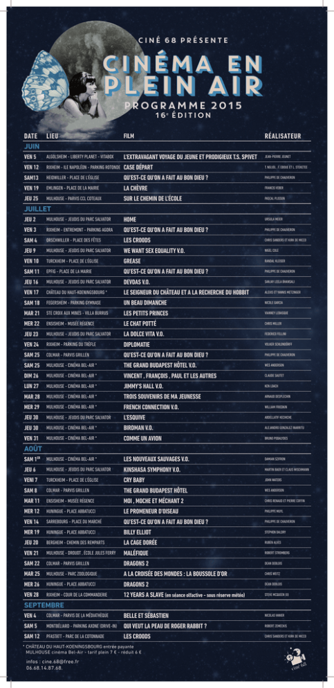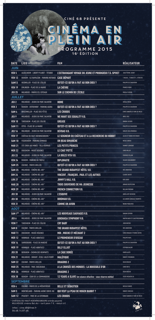 ciné 68 présente programme 2015 16e édition DATE LIEU JUIN FILM RÉALISATEUR VEN 5 ALGOLSHEIM - LIBERTY PLANET - VITABOX L'EXTRAVAGANT VOYAGE DU JEUNE ET PRODIGIEUX T.S. SPIVET JEAN-PIERRE JEUNET VEN 12 RIXHEIM - ILE NAPOLÉON - PARKING ROTONDE CASE DÉPART T. NGIJOL , F. EBOUE ET L. STEKETEE SAM13 HEIDWILLER - PLACE DE L'ÉGLISE QU'EST-CE QU'ON A FAIT AU BON DIEU ? PHILIPPE DE CHAUVERON VEN 19 EMLINGEN - PLACE DE LA MAIRIE LA CHÈVRE FRANCIS VEBER JEU 25 MULHOUSE - PARVIS CCL COTEAUX SUR LE CHEMIN DE L'ÉCOLE PASCAL PLISSON JUILLET JEU 2 MULHOUSE - JEUDIS DU PARC SALVATOR HOME URSULA MEIER VEN 3 RIXHEIM - ENTREMONT - PARKING AGORA QU'EST-CE QU'ON A FAIT AU BON DIEU ? PHILIPPE DE CHAUVERON SAM 4 ORSCHWILLER - PLACE DES FÊTES LES CROODS CHRIS SANDERS ET KIRK DE MICCO JEU 9 MULHOUSE - JEUDIS DU PARC SALVATOR WE WANT SEX EQUALITY V.O. NIGEL COLE VEN 10 TURCKHEIM - PLACE DE L'ÉGLISE GREASE RANDAL KLEISER SAM 11 EPFIG - PLACE DE LA MAIRIE QU'EST-CE QU'ON A FAIT AU BON DIEU ? PHILIPPE DE CHAUVERON JEU 16 MULHOUSE - JEUDIS DU PARC SALVATOR DEVDAS V.O. SANJAY LEELA BHANSALI VEN 17 CHÂTEAU DU HAUT-KOENINGSBOURG * LE SEIGNEUR DU CHÂTEAU ET A LA RECHERCHE DU HOBBIT ALEXIS ET YANNIS METZINGER SAM 18 FEGERSHEIM - PARKING GYMNASE UN BEAU DIMANCHE NICOLE GARCIA MAR 21 STE CROIX AUX MINES - VILLA BURRUS LES PETITS PRINCES VIANNEY LEBASQUE MER 22 ENSISHEIM - MUSÉE RÉGENCE LE CHAT POTTÉ CHRIS MILLER JEU 23 MULHOUSE - JEUDIS DU PARC SALVATOR LA DOLCE VITA V.O. FEDERICO FELLINI VEN 24 RIXHEIM - PARKING DU TRÈFLE DIPLOMATIE VOLKER SCHLONDÖRFF SAM 25 COLMAR - PARVIS GRILLEN QU'EST-CE QU'ON A FAIT AU BON DIEU ? PHILIPPE DE CHAUVERON SAM 25 MULHOUSE - CINÉMA BEL-AIR * THE GRAND BUDAPEST HÔTEL V.O. WES ANDERSON DIM 26 MULHOUSE - CINÉMA BEL-AIR * VINCENT , FRANÇOIS , PAUL ET LES AUTRES CLAUDE SAUTET LUN 27 MULHOUSE - CINÉMA BEL-AIR * JIMMY'S HALL V.O. KEN LOACH MAR 28 MULHOUSE - CINÉMA BEL-AIR * TROIS SOUVENIRS DE MA JEUNESSE ARNAUD DESPLECHIN MER 29 MULHOUSE - CINÉMA BEL-AIR * FRENCH CONNECTION V.O. WILLIAM FRIEDKIN JEU 30 MULHOUSE - JEUDIS DU PARC SALVATOR L'ESQUIVE ABDELLATIF KECHICHE JEU 30 MULHOUSE - CINÉMA BEL-AIR * BIRDMAN V.O. ALEJANDRO GONZALEZ INARRITU VEN 31 MULHOUSE - CINÉMA BEL-AIR * COMME UN AVION BRUNO PODALYDES SAM 1ER MULHOUSE - CINÉMA BEL-AIR * LES NOUVEAUX SAUVAGES V.O. DAMIAN SZIFRON JEU 6 MULHOUSE - JEUDIS DU PARC SALVATOR KINSHASA SYMPHONY V.O. MARTIN BAER ET CLAUS WISCHMANN VENI 7 TURCKHEIM - PLACE DE L'ÉGLISE CRY BABY JOHN WATERS SAM 8 COLMAR - PARVIS GRILLEN THE GRAND BUDAPEST HÔTEL WES ANDERSON MAR 11 ENSISHEIM - MUSÉE RÉGENCE MOI , MOCHE ET MÉCHANT 2 CHRIS RENAUD ET PIERRE COFFIN MER 12 HUNINGUE - PLACE ABBATUCCI LE PROMENEUR D'OISEAU PHILIPPE MUYL VEN 14 SARREBOURG - PLACE DU MARCHÉ QU'EST-CE QU'ON A FAIT AU BON DIEU ? PHILIPPE DE CHAUVERON MER 19 HUNINGUE - PLACE ABBATUCCI BILLY ELLIOT STEPHEN DALDRY JEU 20 BERGHEIM - CHEMIN DES REMPARTS LA CAGE DORÉE RUBEN ALVES VEN 21 MULHOUSE - DROUOT , ÉCOLE JULES FERRY MALÉFIQUE ROBERT STROMBERG SAM 22 COLMAR - PARVIS GRILLEN DRAGONS 2 DEAN DEBLOIS MAR 25 MULHOUSE - PARC ZOOLOGIQUE A LA CROISÉE DES MONDES : LA BOUSSOLE D'OR CHRIS WEITZ MER 26 HUNINGUE - PLACE ABBATUCCI DRAGONS 2 DEAN DEBLOIS VEN 28 RIXHEIM - COUR DE LA COMMANDERIE 12 YEARS A SLAVE (en séance olfactive - sous réserve météo) STEVE MCQUEEN (II) AOÛT SEPTEMBRE VEN 4 COLMAR - PARVIS DE LA MÉDIATHÈQUE BELLE ET SÉBASTIEN NICOLAS VANIER SAM 5 MONTBÉLIARD - PARKING AXONE (DRIVE-IN) QUI VEUT LA PEAU DE ROGER RABBIT ? ROBERT ZEMECKIS SAM 12 PFASTATT - PARC DE LA COTONNADE LES CROODS CHRIS SANDERS ET KIRK DE MICCO * Château du Haut-Koeningsbourg entrée payante MULHOUSE cinéma Bel-Air - tarif plein 7 € - réduit 6 € infos : [email protected] 06.68.14.87.68.