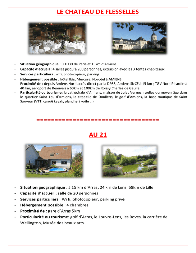 LE CHATEAU DE FLESSELLES - Situation géographique : 0 1H30 de Paris et 15km d’Amiens. Capacité d’accueil : 4 salles jusqu’à 200 personnes, extension avec les 3 tentes chapiteaux. Services particuliers : wifi, photocopieur, parking Hébergement possible : hôtel Ibis, Mercure, Novotel à AMIENS Proximité de : depuis Amiens Nord accès direct par la D933, Amiens SNCF à 15 km ; TGV Nord Picardie à 40 km, aéroport de Beauvais à 60km et 100km de Roissy Charles de Gaulle. Particularité ou tourisme: la cathédrale d’Amiens, maison de Jules Vernes, ruelles du moyen âge dans le quartier Saint Leu d’Amiens, la citadelle de Doullens, le golf d’Amiens, la base nautique de Saint Sauveur (VTT, canoë kayak, planche à voile …) ---------------------------------AU 21 - Situation géographique : à 15 km d’Arras, 24 km de Lens, 58km de Lille Capacité d’accueil : salle de 20 personnes Services particuliers : Wi fi, photocopieur, parking privé Hébergement possible : 4 chambres Proximité de : gare d’Arras 5km Particularité ou tourisme: golf d’Arras, le Louvre-Lens, les Boves, la carrière de Wellington, Musée des beaux arts. LE DOMAINE DE L ABBAYE - Situation géographique : 57 km de Valenciennes Capacité d’accueil : 440 personnes grâce à la salle et la tente « Caïdale » de 216 m2 Matériel disponible : régie son et lumière Services particuliers : Wi fi, photocopieur, parking Hébergement possible : ibis à Valenciennes Proximité de : 2km de la gare de Raismes, axe routier A23 Particularité ou tourisme: étang de pêche, espace pour les sports mécaniques, forêt, location de VTT, parcours aventure (accro branche) kayak … ---------------------------------LA FATTORIA - Situation géographique : à 15 minutes de Béthune, 20 min de Lens, 30 min d’Arras, Capacité d’accueil : salle de 20 personnes. Matériel disponible : paperboard, rétroprojecteur, accès internet Services particuliers : Wi fi, photocopieur, parking privé sécurisé, service de nettoyage, service de navette pour Lille (aéroport, gare) - Hébergement possible : 2 chambres d’hôtes, 3 gîtes - Proximité de : axes majeurs du nord pas de calais - Particularité ou tourisme: location de vélos, terrain de pétanque, table de ping-pong, étang de pêche, centre équestre, golf … LA MAISON DE LA CHICOREE - Situation géographique : 29 km de Valenciennes, 17 km de Saint Amand les eaux Capacité d’accueil : 150 personnes en cocktail, assis 70 personnes, repas 50 personnes Matériel disponible : video projecteur, micro sans fil, table ronde et rectangulaire Services particuliers : wifi, photocopies, fax, Hébergement possible : gite ferme de la place et la verdière Proximité de : gare à 1.6 km, A23 Particularité ou tourisme: le musée de la chicoree, le casino de Saint Amand les eaux, parc naturel de la scarpe escaut, bowling de Douai, hippodrome de Douai ---------------------------------LA PARENTHESE - Situation géographique : 9 km de Béthune, 23 km de Hazebrouck Capacité d’accueil : salle de réception de 40 personnes Services particuliers : Wi fi, parking Hébergement possible : 2 chambres d’hôtes et 2 gîtes Proximité de : 9km de la gare de Béthune, A26 Particularité ou tourisme: terrain de 700m2, étang de pêche et terrain de pétanque. LE COTTAGE - Situation géographique : 5 km de Douai, 20km d’Arras, Cambrai et Lens, 40 km de Lille - Capacité d’accueil : salle de 150 personnes - Services particuliers : parking privé, wifi, vidéoprojecteur, tableau interactif, sono Bose, micro HF … - Hébergement possible : de nombreux hôtels sur Douai et les alentours - Proximité de : proximité de l’A1, l’A2 et l’A26, 3.3 km de la gare de Douai - Particularité ou tourisme: le beffroi de Douai et le musée, le parlement des Flandres et le parvis. ---------------------------------LE MANOIR DE FOURCY - Situation géographique : 5minutes de Douai, 15 minutes d’Arras, 30 minutes de Lille, 25 minutes de Lens, 25 minutes de Lesquin - Capacité d’accueil : 4 salons pour recevoir entre 10 à 500 personnes - Services particuliers : Wi fi, écran, vidéoprojecteur, sonorisation, paperboard, TV, magnétoscope et rétroprojecteur. - Hébergement possible : 8 chambres de 6 personnes - Proximité de : proximité de l’A1, l’A2, l’A26, gare de Douai à 10 minutes, 30 minutes de l’aéroport de Lesquin. Particularité ou tourisme: le beffroi de Douai, le musée, le parlement des Flandres et le parvis de Douai. LE PRIEURE D ABSCON - Situation géographique : 23 km de Douai, de Valenciennes Capacité d’accueil : 1 salle de 110 personnes et 1 salle de 50 personnes Services particuliers : wifi – Parking : oui Hébergement possible : hôtels aux alentours de Somain Proximité de : l’ A21 -------------------------------------------LES CEDRES - Situation géographique : 6,5 km de Douai, 22 d’Arras, 27 km de Lens, 45 km de Lille - Capacité d’accueil : salle de 10 à 140 personnes, jusqu’à 300 en cocktail et une salle de 25 personnes - Services particuliers : Wi fi, parking privé, écran et sonorisation - Hébergement possible : 4 chambres d’hôtes, 1 suite - Proximité de : l’A1 et l’A21, 30minutes de l’aéroport de Lesquin - Particularité ou tourisme: jeux de société, Ping pong, terrain de badminton, le Louvre Lens, le mémorial de Vimy, le centre minier de Lewarde, les places de Lille et Arras MANOIR LE LOUIS XXI - Situation géographique : à proximité de Cambrai sur l'axe ARRAS-CAMBRAI-ST QUENTIN - Capacité d’accueil : une salle de 130 à 220 personnes assises et 400 debout - Matériel disponible : aucun - Hébergement possible : 1 studio de 4 personnes + 1 gîte de 4 personnes - Proximité de : CAMBRAI, ARRAS, AMIEN - Particularité ou tourisme: sites historiques et châteaux ----------------------------------------ESPACE DUFLOT - Situation géographique : proche de Béthune - Capacité d’accueil : 1 salle de réception pour 130 à 220 pers