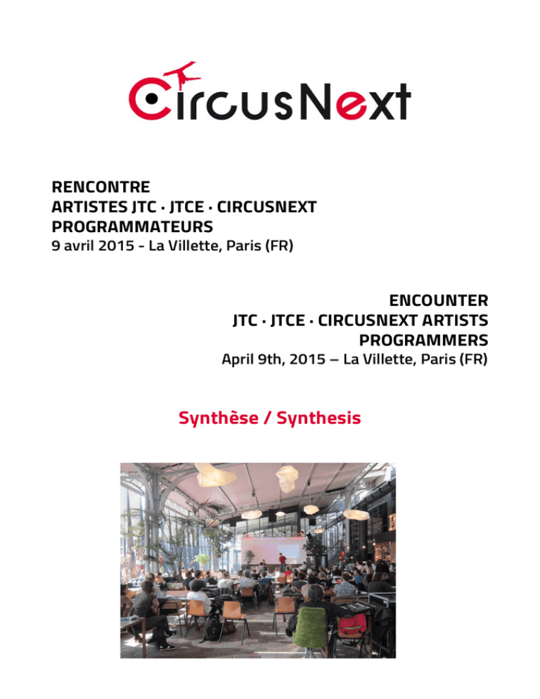 RENCONTRE ARTISTES JTC · JTCE · CIRCUSNEXT PROGRAMMATEURS 9 avril 2015 - La Villette, Paris (FR) ENCOUNTER JTC · JTCE · CIRCUSNEXT ARTISTS PROGRAMMERS April 9th, 2015 – La Villette, Paris (FR) Synthèse / Synthesis CircusNext 2013-‐2017, projet européen coordonné par Jeunes Talents Cirque Europe et soutenu par le programme Culture de la Commission Européenne, propose une saison inédite : après deux opérations de repérage et d’accompagnement d’auteurs émergents en 2013-‐2014 et 2015-‐2016, nous lancerons à l’été 2016 et jusqu’à l’été 2017 une saison européenne des arts du cirque. Cette saison sera l’occasion pour les partenaires et opérateurs culturels du territoire européen de diffuser les œuvres, en cours ou abouties, des auteurs qui auront été lauréats Jeunes Talents Cirque / Jeunes Talents Cirque Europe / CircusNext. 8 promotions d’auteurs singuliers de cirque contemporain qui ont marqué le secteur du spectacle vivant et contribué à l’essor des arts du cirque. La présence de ces auteurs dans vos festivals, vos programmations de saison, lors d’événements spécialement organisés pour l’occasion sera une opportunité pour les publics de (re)découvrir la création contemporaine européenne, d’être en dialogue avec ces artistes, d’appréhender leurs processus de création et de découvrir la très forte coopération française et européenne qui aura permis leur accompagnement. Une des actions mises en place par JTCE pour préparer cette saison européenne des arts du cirque a été la rencontre organisée à La Villette le 9 avril dernier lors du Festival Hautes Tensions : l’occasion de réunir 19 compagnies lauréates JTC / JTCE / CircusNext, représentant toutes les promotions, et qui sont venus présenter à une cinquantaine de professionnels européens leurs créations qui pourront être diffusées lors de la saison européenne des arts du cirque. Ce document est une compilation des propositions artistiques présentées par les compagnies à un instant T. Ces propositions vont évoluer, se créer, être diffusées : nous vous invitons à contacter les artistes pour les suivre, les accompagner et, pourquoi pas, vous inscrire dans la saison européenne des arts du cirque de CircusNext en les diffusant. Ces 19 compagnies ne sont elles-‐mêmes qu’un échantillon des bientôt 76 compagnies repérées depuis 2001 par JTC, JTCE puis CircusNext. Nous mettrons bientôt à votre disposition un répertoire complet de tous ces auteurs et espérons organiser cette saison européenne avec vous tous ! CircusNext 2013-‐2017, European project coordinated by Jeunes Talents Cirque Europe and supported by the Culture Program of the European Commission, proposes an unprecedented season: after two identification and support schemes for emerging authors in 2013-‐2014 and 2015-‐2016, we will launch from June 2016 till August 2017 a European Season of Circus Arts. This season will be the opportunity for partners and cultural operators of the European territory to disseminate the shows – whether they are in progress or finished – of the authors who were Jeunes Talents Cirque / Jeunes Talents Cirque Europe / CircusNext laureates. 8 promotions of creative authors of contemporary circus, who impacted the sector of performing arts and contributed to the development of circus arts. The presence of these authors in your festivals, your seasonal programming, in specially organized events will be an opportunity for the audience to (re)discover European contemporary creation, to be in dialogue with these artists, to have an insight in their creative processes, and to discover the strong European cooperation that allowed their support. One of the actions set up by JTCE to prepare this European Season of Circus Arts was the pitch session held in La Villette on April 9, 2015 during Hautes Tensions Festival: an occasion to bring together 19 JTC/JTCE/CircusNext laureates, representing all promotions, and who presented to about fifty European professionals their creations that can be programed during the European Season of Circus Arts. This document is a compilation of the artistic proposals presented by the companies at a time ‘T’. These proposals will evolve, be created, be disseminated: we invite you to contact the artists to follow their projects, support them, and participate in the CircusNext European Season of Circus Arts by disseminating them. These 19 companies are only a sample of the soon 76 companies identified since 2001 by JTC, JTCE, and CircusNext. Soon we will provide you with a complete directory of all these authors and hope to organize this European Season with you all! LAUREATS JEUNES TALENTS CIRQUE 2002 LAUREATES ............................................... 4 • CÉCILE MONT-REYNAUD & MAËVA TRIBOUILLARD ......................................................... 5 • MORGAN COSQUER, NEL BOSTOEN, JAN VERMEERSCH, BRAM DOBBELAERE, BENJAMON DE MATTEIS, MICKAËL LE GUEN, ETIENNE MANCEAU & VINCENT REVERSAT ................................................................................................................. 8 LAUREATS JEUNES TALENTS CIRQUE 2004 LAUREATES ............................................... 10 • MICHAËL PALLANDRE, CAROLINE LEROY, LAURA LAPORTE & LAURENCE BOUTE ...... 11 • JAN OVING & CLARISSA MARINETTI ..................................................................................... 13 • ROMAN MÜLLER & PETRONELLA VON ZERBONI ............................................................... 14 LAUREATS JEUNES TALENTS CIRQUE 2006 LAUREATES ............................................... 15 • JULIEN VITTECOCQ & JUR DOMINGO ................................................................................... 16 • ALEXANDRE FRAY.................................................................................................................... 18 • VINCENT WARIN & PIERRE JEAN CARRUS .........