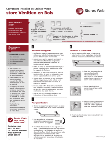 Comment installer et utiliser votre store Vénitien en Bois Vous devriez avoir: D'abord vérifier que vous avez tous les accessoires qui viennent avec votre store. Support de fixation pour les extrémités : x 1 paire Couvercles de cantonnières : x 1 paire (à utiliser si le store est installé à l’extérieur de la fenêtre) Vis: x 4 Support de fixation pour le milieu du store : x 1 (cela dépend de la longueur du store) La cantonnière: x 1 Attache cordon: x 1 Accessoires standards fournies pour les installations les plus courantes Commencer la pose VOUS AUREZ BESOIN: • Une perceuse • Un tournevis cruciforme • Un mètre métallique • Un crayon • Vos supports sont emballés séparément dans la boîte. Assurezvous de les avoir avant de jeter l'emballage. • Les supports sont de type universel et peuvent être utilisés pour une pose de face ou plafond. • Un support de fixation pour le milieu du store centre est fourni pour les stores les plus longs. Ils peuvent être utilisés pour une pose de face ou plafond. Ils doivent être situés aussi près que possible du centre du store. • Veuillez lire les instructions attentivement avant de commencer le montage de votre store. Besoin d’aide pour poser votre store? Contactez-nous 01 57 32 90 43 Du Lundi au Vendredi 9h30-13h00 et 14h00-18h00 1 3 Pour fixer les supports Pour fixer la cantonnière 1. Repérez les points de mesure que vous avez utilisée pour calculer la largeur du store. Vous pouvez utiliser le store pour modèle. 1. Si vous avez installé le store à l’intérieur de votre fenetre, retirez le plastique des bandes velcro et pousser la cantonnière sur le store. 2. Assurez-vous que les supports sont placés à une distance suffisante des poignées ou obstacles pour permettre aux stores de fonctionner sans gènes. 3. Faites en sorte de laisser assez d’espace pour pouvoir installer le store parfaitement entre les supports de fixations. 4. Maintenez un support en position et marquer l'endroit où les vis vont, en utilisant les trous dans le support de fixation comme guide. 5. Si vous posez le store sur un mur ou linteau, utilisez une perceuse, réglée celle-ci sur la taille nécessaires pour faire vos trous, et insérer les chevilles. 6. Si vous posez votre store dans un cadre en bois, visser vos supports. Il est recommandé de faire des trous de guidage pour permettre une fixation plus facile des vis. 2. Pour fixer les couvercles de votre cantonnière (si nécessaire) retirer les languettes du ruban adhésif double face et placer les au centre sur la cantonnière. 3. Placer l’extrémité de la cantonnière de l'autre côté du couvercle. 7. Fixer le support de fixation et répétez ces instructions de l'autre côté du store 2 Pour poser le store 1. Ouvrez les supports et glisser le store en place avec les commandes et les bandes velcro face à vous. 4. Assurez-vous que les embouts se joignent parfaitement et visez. Un adhésif approprié peut être également utilisé. 5. Fixez la cantonnière sur le store en utilisant les bandes de velcro. 2. Pour verrouiller le caisson une fois positionner, poussez vers le bas et fermez les supports. 3. Fixer l’attache cordon à un mur adjacent au store. Ce dispositif de sécurité doit être installé conformément à la législation de la sécurité des enfants. Pour obtenir des conseils sur cette réglementation veuillez consulter notre brochure sur les dispositifs de sécurité pour enfants concernant le montage et l’utilisation de vos stores. voir au verso Utiliser votre store: Utiliser votre store en toute simplicité. Il vous suffit juste de suivre les instructions ci-dessous. • Vous avez deux commandes pour faire fonctionner votre store; la tige de réglage qui fait pivoter les lames afin de jouer avec la luminosité et le cordon de tirage qui permet de monter ou baisser le store dans son intégralité • Pour monter le store, tirez sur le cordon jusqu'à ce que le store atteigne la hauteur désirée que vous vouliez et verrouiller cette position par déplacer le cordon a l’écart du store. • Pour baisser le store, relâchez le cordon de manœuvre à l’écart du store, puis laissez le cordon glisser à travers vos doigts. • Les lames doivent être ouvertes quand vous élever ou baisser le store. • Pour régler l'angle des lames, tournez la baguette d’orientation. Conseils de sécurité: Quelques conseils pour réduire les risques dans votre maison. • Déplacer les lits et meubles à l’écart de votre fenêtre. • Ne laissez pas les cordons ou chaînes pendent. Assurez-vous qu'ils sont en permanence hors de portée des enfants. • Ne pas attacher les fils et câbles et chaînes ensemble. • Vérifier l'état de tous les dispositifs de sécurité s'il n'est pas utilisé régulièrement et les remplacer si l'appareil est défectueux. • Remplacements peuvent être commandés sur www.makeitchildsafe.co.uk