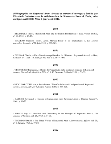 1 Bibliographie sur Raymond Aron. Articles et extraits d’ouvrages ; établie par Elisabeth Dutartre avec la collaboration de Simonetta Freschi, Paris, mise en ligne avril 2008. Mise à jour avril 2016. 1955 - BROMBERT Victor, « Raymond Aron and the French Intellectuals », Yale French Studies, n° 16, 1955, p. 13-23. - NADEAU Maurice, « MM. Aron, Merleau-Ponty et les intellectuels », Les Lettres nouvelles, 3e année, n°28, juin 1955, p. 892-903. 1956 - DELMAS Claude, « Un effort de compréhension de l’histoire : Raymond Aron (I et II) », Critique, n° 112 et 113, 1956, p. 992-999 et p. 1077-1091. 1959 - VENTORINO Francesco, « I limiti dell’oggettività della storia nel pensiero di Raymond Aron », Giornale di Metafisica, XIV, n° 1, 15 Gennaio- Febbraio 1959, p. 35-59. 1960 - RICCI GAROTTI Loris, « Storicismo e "filosofia della storia" nel pensiero di Raymond Aron », Società, XVI, n° 4, Luglio-Agosto 1960, p. 584-620. 1961 - BALMÈS Raymond, « Histoire et humanisme chez Raymond Aron », [France Forum ?], 1961, p. 19-22. 1963 - PIERCE Roy, « Liberalism and Democracy in the Thought of Raymond Aron », The Journal of Politics, vol. 25, 1963, p. 14-35. - THOMSON David, « The Three Worlds of Raymond Aron », International Affairs, vol. 39, n° 1, January 1963, p. 49-58. 1964 2 - HEURGON DESJARDINS Anne éd., Paul Desjardins et les Décades de Pontigny. Études, témoignages et documents inédits, Paris, PUF, 1964, XII-416 p., 23 cm. Nombreuses références à Raymond Aron. 1966 - NAVARRE Louis, « Non, Raymond Aron…», La Nouvelle critique : revue du marxisme militant, n° 172, février 1966, p. 99-115. (Sur des articles parus dans Preuves, janvier-février-mars 1965) - PIERCE Roy, « Raymond Aron : The Sociology of Politics », in Contemporary French Political Thought, London, Oxford University Press, 1966, 273 p., p. 216-249. 1968 - KERKVLIET Benedict J., « A Critique of Raymond Aron’s Theory of War and Prescriptions », International Studies Quarterly, vol. 12, n° 4, December 1968, p. 419-442. 1969 - KÖNIG René, « Sociologie et conscience de crise : réflexions à propos des Etapes de la pensée sociologique de Raymond Aron », Preuves, n° 214, janvier 1969, p. 74-80. 1970 - HERLING-GRUNDZINSKI Gustaw, « Un propos sur J.-P. Sartre et Raymond Aron [en polonais] », Kultura, n° 3, 1970, p. 41-46. 1971 - DELATTRE Michel, « Raymond Aron et la philosophie de l’histoire », Annales de l’Institut de Philosophie, Université libre de Bruxelles, 1971, p. 101-137. - FABRE-LUCE Alfred, « Les drogues des intellectuels », in Science et conscience de la société. Mélanges en l’honneur de Raymond Aron, tome 1, Paris, Calmann-Lévy, 1971, p. 415-428. - FESSARD Gaston, « Raymond Aron, philosophe de l’histoire et de la politique », in Science et conscience de la société. Mélanges en l’honneur de Raymond Aron, tome 1, Paris, Calmann-Lévy, 1971, p. 51-88. 3 - JOUVENEL Bertrand de, « Raymond Aron et l’autonomie de l’ordre politique », in Science et conscience de la société. Mélanges en l’honneur de Raymond Aron, tome 1, Paris, Calmann-Lévy, 1971, p. 233-247. - MARROU Henri, « L’Introduction à la philosophie de l’histoire: le point de vue d’un historien », in Science et conscience de la société. Mélanges en l’honneur de Raymond Aron, tome 1, Paris, Calmann-Lévy, 1971, p. 37-47. - SPERBER Manès, « Raymond Aron », in Science et conscience de la société. Mélanges en l’honneur de Raymond Aron, tome 2, Paris, Calmann-Lévy, 1971, p. 545-549. - THOMPSON Kenneth W., « Raymond Aron and the Study of International Relations », in Science et conscience de la société. Mélanges en l’honneur de Raymond Aron, tome 2, Paris, Calmann-Lévy, 1971, p. 387-404. - TOYNBEE Arnold J., « The Philosophy and Morphology of History », in Science et conscience de la société. Mélanges en l’honneur de Raymond Aron, tome I, Paris, CalmannLévy, 1971, p. 21-33. 1972 - STRONG Tracy B., « History and Choices : the Foundations of the Political Thought of Raymond Aron », History and Theory, 11, 1972, p. 179-192. 1973 - ALEXANDRE Philippe, « Raymond Aron devient la tête de Turc des Russes », Paris Match, 15 décembre 1973. - BORNE Etienne, « Raymond Aron et Jean-Paul Sartre : les deux camarades », France Forum, 126, juillet 1973. Reproduit in France Forum, n° 239-240, octobre-décembre 1987, p. 51-52. - MANENT Pierre, « Raymond Aron, la raison et la violence », Contrepoint, n° 12, 1973, p. 173-185. - WERNER Eric, « Raymond Aron et le problème de la guerre », Revue de métaphysique et de morale, 1, 1973 , p. 218-234. 1974 - MOREAU Pierre F., « Raymond Aron : un sociologue dans le siècle », Psychologie, septembre 1974, n° 56, p. 35-39. 1975 4 - IONESCU Ghita, « Raymond Aron : a Modern Classicist », in CRESPIGNY Anthony, MINOGUE Kenneth ed., Contemporary political philosophers, New York, Dodd, Mean & Company, 1975, p. 191-208. - MASCHKE Günter, « Die Denkmaschine oder die Gier, zu verstehen. Der französische Soziologie Raymond Aron wird siebzig - Rückblick auf sein Werk », Frankfurter Allgemeine Zeitung, 1975. 1976 - DOBRY Michel, « Clausewitz et l’"entre-deux", ou de quelques difficultés d’une recherche de paternité légitime », Revue française de sociologie, vol. XVII, n° 4, octobre-décembre 1976, p. 652-664. (Compte rendu de Penser la Guerre. Clausewitz) - FREUND Julien, « Guerre et politique. De Karl von Clausewitz à Raymond Aron », Revue française de sociologie, vol. XVII, n° 4, octobre-décembre 1976, p. 643-651. (Compte rendu de Penser la Guerre. Clausewitz) 1977 - McINNES Neil, « The Treasonous Clerks, with a French Warning to Australia », Quadrant, September 1977, p. 54-53. - RONCHEY Alberto, « Omaggio a Raymond Aron », [Corriere della Sera ?], 19 Giugno 1977. - SORUM Paul Clay, Intellectuals and Decolonization in France, Chapel Hill, The University of North Carolina Press, 1977, XIV-305 p. Chapitr