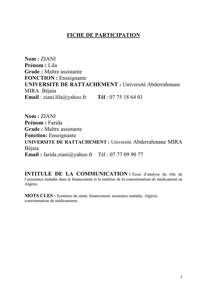 FICHE DE PARTICIPATION Nom : ZIANI Prénom : Lila Grade