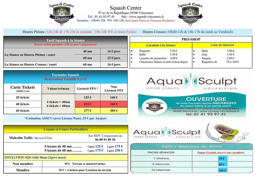 Squash Center 97 av de la République 94300 Vincennes Tel : 01.41.93.97.41 Site : www.squash-vincennes.fr Semaine : 10h40-23h WE 10h-18h (hors jours Fériés et Vacances Scolaires) Heures Pleines (12h-14h & 17h-23h la semaine ; 10h-18h WE et Jours Fériés) Heures Creuses (10h40-12h & 14h-17h du lundi au Vendredi) PRO-SHOP Tarif Squash à la Séance Réservation possible 24h avant Uniquement La Séance en Heures Pleines / court La Séance en Heures Creuses / court Location à la Séance 40 mn 16 €/pers 60 mn 22 €/pers 60 mn 16 €/pers Raquette 3.50 € Balle 3.50 € Lunettes de protection 4.00 € Chaussures Indoor en prêt (selon dispo) Vente de Matériel Balle Grip Surgrip Raquettes de 5.00 € 5.50 € 2.80 € 70 à 160 € Formules Squash Réservation Possible à J-15 Carte Tickets validité 2 ans Valeur/créneau Licencié FFS * Non Licencié FFS 125 € 160 € 215 € 245 € 277 € 305 € 20 tickets 40 tickets 4 tickets = 40mn 6 tickets = 60mn 60 tickets *Cotisation ASSCV (avec Licence Pass): 25 € par An/pers Leçons et Cours Particuliers Sur RDV Uniquement au 06 88 91 89 30 Malcolm Tullis Breveté d’Etat 5 leçons de 40 mn……... 5 leçons de 60 mn……... 1 pers 125 1 pers 175 € € 2 pers 175 2 pers 250 INITIATION SQUASH 40mn (2pers maxi) € € Sauna Gratuit réservé aux membres 19 € Non membre 49 € Terrain et matériel inclus 85 € Membre 30 € + 4 tickets pour Location du terrain 145 €