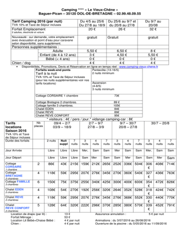 Camping **** « Le Vieux-Chêne » Baguer-Pican – 35120 DOL-DE-BRETAGNE – 02.99.48.09.55 Tarif Camping 2016 (par nuit) Du 4/5 au 25/6 Du 25/6 au 9/7 et Du 27/8 au 18/9 du 20/8 au 27/8 20 € 26 € TVA 10% et Taxe de Séjour incluses Forfait Emplacement Du 9/7 au 20/08 32 € 2 adultes, électricité et voiture Nouveauté : sur demande, votre emplacement avec évacuation et point d’eau pour caravane selon disponibilité, sans supplément. Personnes supplémentaires : Adulte Enfant (de 4 à 12 ans) Bébé (< 4 ans) Chien / dog • gratuit Gratuit 5,50 € 3€ 0€ 4€ gratuit 6,50 € 4,50 € 0€ 4€ 8€ 5,50 € 0€ 4€ Disponibilités, Promotions, Devis et Réservation en ligne en temps réel : www.camping-vieux-chene.fr Forfaits week-end ponts Pentecôte (13-16/5) 2 nuits minimum Tarif à la nuit TVA 10% et Taxe de Séjour incluses (pour les nuits supplémentaires voir nos Ascension tarifs locations) (4-8/5) 3 nuits minimum Tarifs locations Saison 2016 Cottage CORSAIRE 1 chambre 73€ Cottage Bretagne 2 chambres. Cottage famille 3 chambres. Chalet EDEN Chalet REVE Chalet REVE CONFORT 89 € 105€ 84€ 89€ 95€ Nb places TVA 10% et Taxe de Séjour incluses Durée des forfaits * visiteurs : 4€ / pers / jour.* vidange camping-car : 8€ 09/4 – 2/7 2/7 – 9/7 9/7 – 30/7 03/9 – 18/9 27/8 – 3/9 20/8 – 27/8 30/7 – 20/8 Jour Arrivée Libre Nuit suppl . Libre Jour Départ Libre Libre Libre 2 86€ 43€ 215€ 159€ 212€ 265€ 252€ 336€ 504€ 306 408€ 714€ € 4 118€ 59€ 295€ 207€ 276€ 345€ 270€ 360€ 540€ 327 436€ 763€ € 6 150€ 75€ 4 108€ 54€ 4 118€ 59€ 5 128€ 64€ 375€ 255€ 340€ 425€ 300€ 400€ 600€ 354 € 270€ 192€ 256€ 320€ 264€ 352€ 528€ 318 € 295€ 207€ 276€ 345€ 276€ 368€ 552€ 330 € 320€ 222€ 296€ 370€ 285€ 380€ 570€ 339 € Cottage CORSAIRE 2 nuits 1 chambre Cottage BRETAGNE 2 chambres Cottage FAMILLE 3 chambres Chalet EDEN 2 chambres Chalet REVE 2 chambres Chalet REVE CONFORT 2 chambres Location de draps (par lit) : Forfait Ménage : Location Lit Bébé+Chaise Bébé : Chien : 7 nuits 3 nuits 4 nuits 7 nuits 3 nuits 4 nuits 7 nuits 3 nuits 4 nuits 7 nuits Libre Mer, Sam Sam Mer Sam Sam Mer, Sam Sam Sam Sam Sam Mer Sam Sam Mer Sam 13 € 53 € 4 € par nuit 4 € par nuit Mer Assurance annulation : 472€ 826€ 424€ 742€ 440€ 770€ 452€ 791€ 5 € par nuit Animations : du 3/07/2016 au 26/08/2016 Ouverture de la piscine : du 5/05/2016 au 11/09/2016