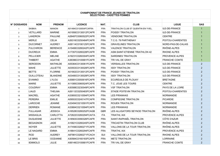 CHAMPIONNAT DE FRANCE JEUNES DE TRIATHLON SELECTIONS - CADETTES FEMMES N° DOSSARDS NOM PRENOM LICENCE NAT. CLUB LIGUE SAS 1 SKIBKA MANON A01494C0130054FCAFRA FRA TRIATHLON CLUB ST QUENTIN EN YVEL. ILE-DE-FRANCE 1 2 VETILLARD MARINE A01956C0130012FCAFR FRA POISSY TRIATHLON ILE-DE-FRANCE 1 3 LANDRON PAULINE A28487C0060522FCAFR FRA VENDOME TRIATHLON CENTRE 1 4 MERLE CELIA A26316C0250484FCAFR FRA T.C.G. 79 PARTHENAY POITOU-CHARENTES 1 5 DUCORNET AUDREY A08114C0190125FCAFR FRA GRAVELINES TRIATHLON NORD-PAS-DE-CALAIS 1 6 FULCHIRON BERENICE A15466C0280242FCAFR FRA VALENCE TRIATHLON RHÔNE-ALPES 1 7 DUCREUX EMMA A17357C0280228FCAFR FRA ASM.SAINT-ETIENNE TRIATHLON 42 RHONE ALPES 1 8 PELLICIER MELINE A19231C0260304FCAFR FRA SARDINES TRIATHLON PROVENCE ALPES 1 9 THIBERT AGATHE A38396C0100681FCAFR FRA TRI VAL DE GRAY FRANCHE COMTE 1 10 SERODON MATHILDE A05364C0130061FCAFR FRA VERSAILLES TRIATHLON ILE-DE-FRANCE 2 11 MAHE JULIETTE A03553C0130028FCAFR FRA ISSY TRIATHLON ILE-DE-FRANCE 2 12 BETTS FLORRIE A01902C0130012FCAFR FRA POISSY TRIATHLON ILE-DE-FRANCE 2 13 GUILLOTEAU BLANDINE A03480C0130028FCAFR FRA ISSY TRIATHLON ILE-DE-FRANCE 2 14 EVANNO LYLOU A35681C0050616FCAFR FRA ECUREUILS DE PLOUAY BRETAGNE 2 15 MARIE JULIETTE A11085C0060524FCAFR FRA T.C. JOUE LES TOURS CENTRE 2 16 COUDRAY EMMA A30588C0230549FCAFR FRA VSF TRIATHLON PAYS DE LA LOIRE 2 17 LIAUD THELMA A26112C0250483FCAFR FRA STADE POITEVIN TRIATHLON POITOU-CHARENTES 2 18 MACREL AGATHE A33693C0210594FCAFR FRA LES PIRANHAS NORMANDIE 2 19 PEREIRA EMILIE A09553C0240147FCAFR FRA COMPIEGNE TRIATHLON PICARDIE 2 20 LAROCHE JEANNE A33494C0210591FCAFR FRA ROUEN TRIATHLON NORMANDIE 2 21 DERRIEN ROMANE A33684C0210594FCAFR FRA LES PIRANHAS NORMANDIE 2 22 FULLAGAR JESSICA A16528C0280252FCAGB GBR LES ALLIGATORS SEYNOD TRIATHLON RHÔNE-ALPES 2 23 MISSAGLIA CARLOTTA A72822C0260294FCAITA ITA TRIATHL`AIX PROVENCE ALPES 2 24 DUQUESNE JULIETTE A18563C0090326FCAFR FRA SAINT-RAPHAËL TRIATHLON CÔTE D'AZUR 2 25 BEGAGNON JADE A15821C0280245FCAFR FRA TRICASTIN TRIATHLON CLUB RHÔNE-ALPES 2 26 NOYER JULIETTE A17456C0280271FCAFR FRA VALLONS DE LA TOUR TRIATHLON RHÔNE-ALPES 2 27 LE NAGARD EMMA A18641C0260294FCAFR FRA TRIATHL`AIX PROVENCE ALPES 2 28 ROD AUDREY A87981C0280271FCACH SUI VALLONS DE LA TOUR TRIATHLON RHONE ALPES 2 29 LE BRIS OCEANNE A30584C0160183FCAFR FRA METZ TRIATHLON LORRAINE 2 30 IEMMOLO JULIE A56146C0100681FCAFR FRA TRI VAL DE GRAY FRANCHE COMTE 2 31 HOUILLON MATHILDE A11854C0160183FCAFR FRA METZ TRIATHLON LORRAINE 2 32 LEQUIN LUDIVINE A37263C0040664FCAFR FRA MONTCEAU TRIATHLON BOURGOGNE 2 33 MAISONNEUVE LAURIE A27606C0030498FCAFR FRA CLERMONT TRIATHLON AUVERGNE 2 34 LEFRANC EMMA A47174C 0020434FCAFR FRA CARBON BLANC TRIATHLON AQUITAINE 2 35 LARROZE LAUGA PAULINE A23001C0180418FCAFR FRA TRIATHLON TOULOUSE METROPOLE MIDI-PYRÉNÉES 2 36 PASCAL ROMANE A23741C0180418FCAFR FRA TRIATHLON TOULOUSE METROPOLE MIDI-PYRÉNÉES 2 37 PIERRE MARJOLAINE A53528C0270015FCAFR FRA LE CLUB TRIATHLON REUNION 2 38 CARRIER CAMILLE A27761C0130061FCAFR FRA VERSAILLES TRIATHLON ILE-DE-FRANCE 3 39 BODIN BAYSSET TANIA A03603C0130028FCAFR FRA ISSY TRIATHLON ILE-DE-FRANCE 3 40 LEFEVRE MARINE A06785C0130091FCAFR FRA LA BRIE FRANCILIENNE TRIATHLON ILE-DE-FRANCE 3 41 LE GLEUT SYLVIA A34983C0050616FCAFR FRA ECUREUILS DE PLOUAY BRETAGNE 3 42 PAYANT JUSTINE A28653C0060524FCAFR FRA T.C. JOUE LES TOURS CENTRE 3 43 BOUREAU MARINE A29836C0230560FCAFR FRA ST JEAN DE MONTS VENDEE TRIATHLON AT PAYS DE LA LOIRE 3 44 DE POORTER INES A31613C0230564FCAFR FRA ENDURANCE 72 TRIATHLON PAYS DE LA LOIRE 3 45 JADEAU SIBILEA VALENTINE A26205C0250484FCAFR FRA T.C.G. 79 PARTHENAY POITOU-CHARENTES 3 46 DUSAUSSOY LOLA A33720C0210594FCAFR FRA LES PIRANHAS NORMANDIE 3 47 LUCAS REBECCA A44562C0190120FCAFR FRA LYS CALAIS TRIATHLON NORD-PAS-DE-CALAIS 3 48 NOTEBAERT PAULINE A57600C0190126FCAFR FRA TRIATHLON CLUB DE LIEVIN NORD PAS DE CALAIS 3 49 COUPIN ELOISE A08919C0190142FCAFR FRA BLANC NEZ TRIATHLON 62 NORD-PAS-DE-CALAIS 3 50 KEMPF LISE A16532C0280252FCAFR FRA LES ALLIGATORS SEYNOD TRIATHLON RHÔNE-ALPES 3 51 LACHAT EDMEE A15748C0280232FCAFR FRA C.R.V. LYON TRIATHLON RHÔNE-ALPES 3 52 SUTTY OCEANE A58179C0090326FCAFR FRA SAINT-RAPHAËL TRIATHLON COTE D AZUR 3 53 FOUCHARD NINA A14582C0280271FCAFR FRA VALLONS DE LA TOUR TRIATHLON RHÔNE-ALPES 3 54 VIAIN ELSA A15549C0280242FCAFR FRA VALENCE TRIATHLON RHÔNE-ALPES 3 55 MARION LUCIE A21856C0140370FCAFR FRA MONTPELLIER TRIATHLON LANGUEDOC-ROUSSILLO 3 56 LACOUR JEANNE A16247C0280249FCAFR FRA TRI 07 PRIVAS TRIATHLON RHÔNE-ALPES 3 57 MONTEIL LENA A38330C0100680FCAFR FRA GROUPE TRIATHLON VESOUL HAUTE SAON FRANCHE-COMTÉ 3 58 LEMOINE MATHILDE A36497C0040655FCAFR FRA DIJON TRIATHLON BOURGOGNE 3 59 BOYE ROMANE A11824C0160187FCAFR FRA VITTEL TRIATHLON LORRAINE 3 60 HOUILLON CAMILLE A11853C0160183FCAFR FRA METZ TRIATHLON LORRAINE 3 61 LIEBECK MATHILDE A46653C0020460FCAFR FRA LA TRIBU 64 AQUITAINE 3 62 AZZOLA ADELE A24081C0020464FCAFR FRA ES BLANQUEFORT NATATION/TRIATHLON AQUITAINE 3 63 GILBERT ISABELLA A73264C 0020432FCAGB GBR U.S. BERGERAC TRIATHLON AQUITAINE 3 64 FERREIRA ELISE A27342C0030499FCAFR FRA MONTLUCON TRIATHLON AUVERGNE 3 65 GALLOT DUVAL JUSTINE A03594C0130028FCAFR FRA ISSY TRIATHLON ILE-DE-FRANCE 4 66 LASNE CHARLOTTE A05181C0130054FCAFR FRA TRIATHLON CLUB ST QUENTIN EN YVEL. ILE-DE-FRANCE 4 67 ROUSSEL MÉLANIE A39665C0130091FCAFR FRA LA BRIE FRANCILIENNE TRIATHLON ILE-DE-FRANCE 4 68 BEUZET LUCIE A50359C0050616FCAFR FRA ECUREUILS DE PLOUAY BRETAGNE 4 69 BERTHOMIER JUSTINE A29077C0060528FCAFR FRA TRIATHLON CLUB CHATEAUROUX 36 CENTRE 4 70 POUVREAU LAURANE A31379C0230560FCAFR FRA ST JEAN DE MONTS VENDEE TRIATHLON AT PAYS DE LA LOIRE 4 71 CHATEAU MILA A29775C0230543FCAFR FRA BEST TRIATHLON SAINT-NAZAIRE PAYS DE LA LOIRE 4 72 FOSSANO LUANA A26237C0250484FCAFR FRA T.C.G. 79 PARTHENAY POITOU-CHARENTES 4 73 GUILLEMAN NOLWEN A08545C0190132FCAFR FRA RACING CLUB ARRAS TRIATHLON NORD-PAS-DE-CALAIS 4 74 JOSEPH AGATHE A50281C0200603FCAFR FRA CAEN TRIATHLON NORMANDIE 4 75 ELLAR