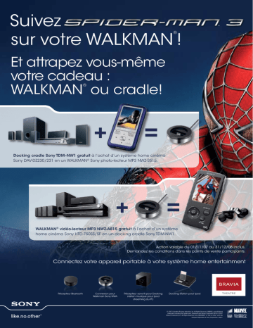 Suivez sur votre Walkman ! ® Et attrapez vous-même votre cadeau : Walkman ou cradle! ® Docking cradle Sony TDM–NW1 gratuit à l’achat d’un système home cinéma Sony DAV-DZ230/231 en un WALKMAN® Sony photo-lecteur MP3 NWZ-S515. WALKMAN® vidéo-lecteur MP3 NWZ-A815 gratuit à l’achat d’un système home cinéma Sony HTD-750SS/SF en un docking cradle Sony TDM-NW1. Action valable du 01/11/07 au 31/12/08 inclus. Demandez les conditions dans les points de vente participants. Connectez votre appareil portable à votre système home entertainment Récepteur Bluetooth Connexion pour Walkman Sony NWA Récepteur sans fil pour Docking station musique pour Ipod streaming du PC Docking station pour Ipod © 2007 Columbia Pictures Industries, Inc. All Rights Reserved. MARVEL, and all Marvel characters including the Spider-man, Sandman and Venom Characters TM & © 2007 Marvel Characters, Inc. All Rights Reserved. Sony, WALKMAN® et “like no other” sont des marques déposées de Sony Corporation, Japon. Pour profiter de cette offre exceptionnelle, il vous suffit de compléter le talon ci-dessous et de le renvoyer avec vos preuves d’achat à: Action Release your Music, c/o Promocontrol, BP 2667, 1414 Waterloo Conditions de l’action + coordonnées: ➔ Cette action est valable du 01/11/07 jusqu’au 31/12/07 ou jusqu’à épuisements des stocks. ➔ A l’achat d’un Sony home cinema-systeem DAVDZ230/231 et un Sony WALKMAN® photo-lecteur mp3 NWZ-S515 vous recevrez un Sony docking cradle TDMNW1ou à l’achat d’un Sony home cinema-systeem HTD-750SS/SF et un Sony docking cradle TDM-NW1 WALKMAN® video-lecteur mp3 NWZ-A815 vous recevrez un Sony docking cradle TDM-NW1 à domicile. ➔ Afin de pouvoir participer à cette action vous devez nous envoyer les éléments suivantes: - Le coupon-réponse dûment complété - Une copie de la preuve d’achat (mentionnant la date d’achat et le modèle acheté) - Code-barre original de l’emballage du Sony home cinema-systeem DAV-DZ230/231 ou le HTD750SS/SF (donc pas une copie!) Envoyez le tout en enveloppe à: Action Release your Music, c/o Promocontrol, BP 2667, 1414 Waterloo ➔ L’envoi à l’adresse indiquée doit se faire au plus tard le 31/01/08. Les coupons-réponse reçus après cette date et/ou incomplets ne seront pas pris en considération. ➔ Cette action est exclusivement valable en Belgique et au G.D. Luxembourg. Le Sony docking cradle TDM-NW1 ou le WALKMAN® ➔ video-lecteur mp3 NWZ-A815 sera seulement donné en Belgique ou au G.D. Luxembourg et l’appareil doit avoir été acheté en Belgique ou au G.D. Luxembourg. Maximum un envoi par appareil acheté. Sony ne ➔ peut être tenu pour responsable des envois endommagés, perdus ou ralentis. Vous recevrez le Sony docking cradle TDM-NW1 ou ➔ le WALKMAN® video-lecteur mp3 NWZ-A815 dans le mois qui suit la reception du coupon-réponse. Dans le cas contraire contactez-nous avant le 14/03/08 au plus tard. En complétant le coupon-réponse, vous signez votre ➔ acceptation des présentes conditions. Sony se réserve le droit de suspendre (temporaire➔ ment) cette action, de la modifier ou d’en modifier les conditions. Pour consulter toutes les conditions de cette action, ➔ surfez sur www.sony.be/promos Vous pouvez adresser vos questions concernant ➔ cette action par écrite à : [email protected], l’ adresse postale: Action Release your Music, c/o Promocontrol, BP 2667, 1414 Waterloo, ou bien par téléphone au numéro 02/352 03 98 (FR). J’ai droit à : O WALKMAN® video-lecteur mp3 NWZ-A815 O Docking cradle TDM-NW1 Nom de famille: Prénom: Rue: Numéro: Code postal: Boîte: Commune: Langue: Pays: NL FR E-mail: Tél.: Date de naissance (JJ/MM/AAAA): / / Lieu de votre achat: Date d’achat: Contrat d’utilisation des Données Personnelles: être si vous le souhaitez modifiées ou supprimées (dans les limites prescrites par la loi). Le traitement des Données Personnelles réalisé par Sony sera effectué conformément aux conditions ci-dessus et en vertu de la législation applicable. 5. Les enfants agés de moins de 14 ans doivent obtenir l’accord de leurs parents ou de de leur tuteur avant de fournir des données personnelles. 1. Le présent Contrat d’utilisation des Données Personnelles est un contrat conclu entre vous et Sony e-Solutions Europe B.V située en Belgique et chargée de gérer les Données Personnelles collectées par les sociétés du groupe Sony en Europe. 2. Les Données Personnelles fournies par l’intermédiaire de ce site Web ou par un autre média (“Données Personnelles”) peuvent être utilisées par Sony e-Solutions Europe B.V. et d’autres sociétés du groupe Sony implantées dans le monde entier (dénommées collectivement “Sony”) pour conseiller, offrir et vendre des marchandises et des services ainsi qu’à d’autres fins commerciales. Des objets complémentaires pourront être définis au cas par cas dans les conditions générales de vente ou d’utilisation éventuelles. 3. Ces Données Personnelles aideront Sony dans ses démarches consistant à améliorer sans cesse ses produits et ses services. Veuillez vous référer à la Déclaration de Confidentialité pour tout complément d’information: www.sony.be ou le numéro de téléphone: 070/ 222 130. 4. Sur simple demande adressée à Sony e-Solutions Europe B.V., vos Données Personnelles que Sony détient par-devers elle vous seront communiquées et pourront Veuillez signer et cocher la case ci-contre si vous approuvez ces conditions. SIGNATURE: Pour toute demande de renseignements concernant vos Données Personnelles: Sony Belgium, The Corporate Village, Da Vincilaan 7, D1, 1935 Zaventem ou contactez votre Centre d’information à la clientèle sur le numéro de téléphone: 070/ 222 130. Sony et “like no other” sont des marques déposées de Sony Corporation, Japon.