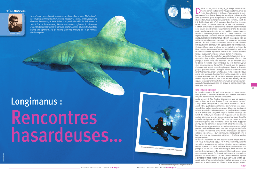 ÉGYPTE TÉMOIGNAGE Steven Surina Abu Fendira Steven Surina est moniteur de plongée en mer Rouge, dans le centre Alizés plongée, une structure commerciale internationale agréée de la FFESSM. À ce titre, depuis une décennie, il accompagne les croisières et en particulier celles du Sud, autour de Saint-Johns. Là, il rencontre régulièrement les requins longimanus dont il observe avec intérêt le comportement et constate les changements d’habitudes. Pourtant, malgré son expérience, il a été victime d’une mésaventure qui l’a fait réfléchir. Un récit singulier… 24 D epuis 10 ans, d’avril à fin juin, je plonge toutes les semaines dans le sud de la mer Rouge égyptienne, entre les récifs d’Abu Fendira et St Johns. J’observe ainsi le comportement d’une dizaine de requins océaniques présents sur la zone et identifiés grâce aux photos et aux films. À ma grande stupéfaction, tous les longimanus sont des femelles, allant de 2 à 3,50 mètres, et il n’est pas rare, dans la même journée, de rencontrer les mêmes animaux sur des sites différents… Il est fort probable qu’ils perçoivent les vibrations des moteurs et nous suivent ainsi à la trace. Car, malgré les efforts des centres et des moniteurs de plongée, les marins vident encore trop souvent leurs ordures organiques à la mer… Cette manne encourage les squales à suivre les bateaux, dans l’espoir de récupérer quelques miettes : le longimanus est bien connu pour être un prédateur qui n’hésite pas à se nourrir de tout ce qui passe à sa portée… En avril, nos rencontres nous permettent de déterminer les attitudes de chacun des squales selon les circonstances. Certains affichent une prudence qui les maintient en lisière du bleu, d’autres font preuve d’une curiosité inquisitrice. Mais nous ne relevons aucune agressivité même si des tensions naissent lorsque plusieurs d’entre eux évoluent dans la même zone. En mai, les choses changent alors que débute la période de reproduction. Les femelles s’approchent beaucoup plus près des plongeurs et des récifs. Plus étonnant : on en rencontre sous les points de largage en pneumatique, au nord des récifs, plus vives et curieuses que lorsqu’elles évoluent sous les bateaux. Certaines vont jusqu’à suivre les plongeurs durant la descente jusqu’à quarante mètres. Des signes de nervosité et d’irritation se font sentir, mais, encore une fois, sans réelle agressivité. Nous avons subi quelques charges d’intimidation mais elles se sont toujours terminées plus par de fortes émotions que par de véritables frayeurs. Pourtant, vers la fin du mois de mai, certains requins ne supportent manifestement plus la présence des plongeurs et d’autres disparaissent en laissant la place à des congénères plus imposants. Une tension palpable Rencontres hasardeuses… © D.R. Longimanus : Un document ex ceptionnel : le lon gimanus agres se Steven brutale © Dominique Barray ment. Les comportements des longimanus changent au fil des ans. Novembre - Décembre 2011 - N° 239 SUBAQUA Novembre - Décembre 2011 - N° 239 SUBAQUA La dernière semaine de mai, nous sommes en haute saison. Nous partons d’une marina bondée. Bon nombre de bateaux ont pour destination les récifs de Saint-Johns… Après un arrêt à Abu Fendira, étrangement vide de bateaux, nous arrivons sur le site de Gota Soraya, une petite ”patate” à vingt milles nautiques de la côte, sur le tropique du Cancer. Avant même que le bateau ait terminé de s’amarrer, nous observons déjà en surface deux longimanus… L’heure du briefing est arrivée. Nous insistons longuement sur la manière de se comporter et d’évoluer avec ces grands requins. Pendant ce temps, dès l’arrêt des moteurs, un moniteur tek n’appartenant pas à notre équipe, s’immerge avec ses plongeurs sans leur avoir donné la moindre consigne de sécurité ! Pour notre part, nous insistons sur certains points très importants : éviter les flashs d’appareil photo, les cris dans l’eau qui peuvent attirer la curiosité, ou bien encore un séjour prolongé en surface. À ce moment, gilet gonflé, caméra vidéo en main, une des plongeuses tek hurle en surface : ”Au secours, aidez-moi ! Il m’attaque !”. Le requin est dans ses palmes… Heureusement, la palanquée remonte à bord alors que nos plongeurs se préparent… Une forte tension est perceptible ! Le récit de l’instructeur tek nous apprend que les longimanus les ont suivis de la surface jusqu’à 40 mètres. Leurs mouvements saccadés et leurs approches rapides reflétaient une curiosité excessive. Il pense qu’il serait judicieux de ne pas immerger nos plongeurs sur ce site ! Avec mon collègue, nous décidons de prendre la température… En moins de 30 secondes, nous nous retrouvons dos à dos à 5 mètres de profondeur. Le premier longimanus fait son apparition. Un petit curieux très calme. Il passe à 3 mètres de nous, fait un tour et puis s’en va. Le second apparaît moins d’une minute plus tard. Malgré une nage un peu nerveuse, le requin prend ses distances et ne s’approche pas, 25 Témoignage > Longimanus : Rencontres hasardeuses… Un animal magnifique mais potentiellement dangereux. il mesure au moins 3,50 m ! Ne ressentant pas de risques potentiels, nous remontons et conseillons à nos plongeurs de s’immerger rapidement sans rester en surface et de rejoindre directement le récif… Mon coéquipier est déjà prêt. Nous nous immergeons les premiers et faisons une superbe plongée au cours de laquelle nous voyons quatre espèces différentes de requins mais pas de longimanus ! C’est sur le retour, alors que nous croisons la palanquée de mon collègue, que je comprends que quelque chose ne va pas ! Il est au bord de l’essoufflement. Cinq minutes plus tôt, une grosse femelle l’a plaqué à deux reprises le long du tombant, lui arrachant le masque à coups de museau ! Il a réussi à l