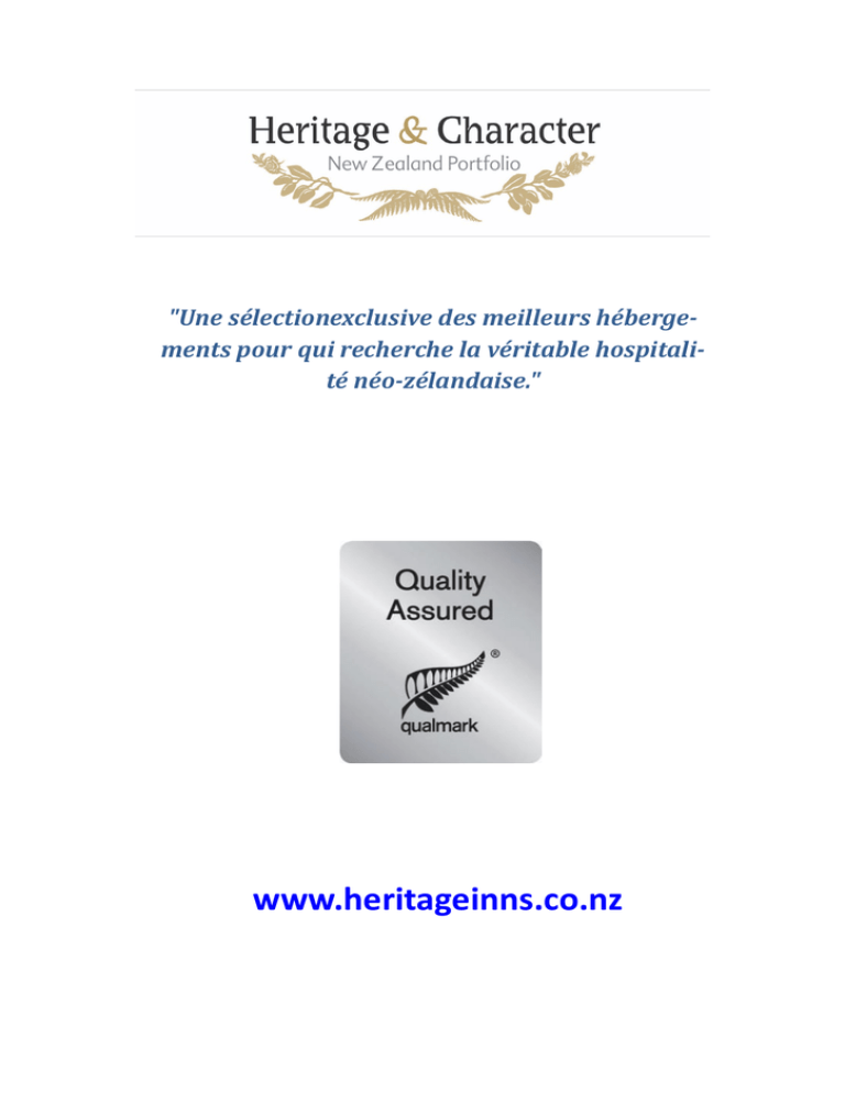 "Une sélectionexclusive des meilleurs hébergements pour qui recherche la véritable hospitalité néo-zélandaise." www.heritageinns.co.nz Soyez les bienvenus ! Heritage & Character New Zealand Portfolio est une collection unique des hébergements les plus raffinés en Nouvelle-Zélande : chalets, chambres d’hôtes, hôtels, villas de caractère et maison de campagne. Nos maisons d’hôtes à travers la Nouvelle-Zélande ont une réputation d’hébergements luxueux aux petits déjeuners exceptionnels et où nos invités sont reçus chaleureusement, comme des amis. Nos hôtes d’exception vous choieront, vous aideront à planifier vos activités et vous guideront vers des expériences culinaires et vinicoles de classe mondiale. Tarifs et Commissions Tous les tarifs sont sur la base d’une occupation double, par nuit et comprennent le petit déjeuner et la GST (taxe sur les biens et services). Ils sont donnés en dollars néo-zélandais. Les tarifs pouvant changer en fonction de la saison, nous vous conseillons de les vérifier quand vous effectuez votre réservation. Il est possible de réserver pour une seule personne, pour trois ou pour quatre ; pour cela, contactez directement les hôtes. Toutes les propriétés ont des modalités d’annulation. Qualmark La plupart des propriétés sont qualifiés Qualmark (organisation officielle de tourisme en NouvelleZélande). En outre, beaucoup ont aussi reçu une certification environnementale de tourisme responsable basée sur des critères environnementaux et sociaux. Distribution géographique Les propriétés HCP (Heritage & Character Portfolio) sont réparties sur 5 régions de Nouvelle-Zélande. Les régions sont : Haut de l’Ile du Nord, Centre et Bas de l’Ile du Nord, Haut de l’Ile du Sud, Centre de l’Ile du Sud, Bas de l’Ile du Sud. Les informations pour chaque propriété sont situées dans les chapitres de chaque région, et dans le même temps, vous pourrez trouver la région à côté du nom de la propriété. . www.heritageinns.co.nz Carte de Nouvelle-Zélande www.heritageinns.co.nz Bed of Roses Kerikeri Bay of Islands– Haut de l’Ile du Nord Ernest Dawson écrit : "Ils ne sont pas longs, les jours de vin et de roses". Bed of Roses est un lieu où le temps est suspendu, où tout est fait pour se reposer autour d’un verre de vin et où les roses restent ouvertes jusqu’à tard dans la soirée. Bienvenus à Bed of Roses, une chambre d’hôtes de prestige sur les collines de Kerikeri donnant sur le bassin près du Old Stone Store. Dans le jardin, les suites et les salles à manger, Bed of Roses a réussi à capturer l’élégance française. Toutes les suites sont magnifiquement meublées, la literie est haut de gamme et la décoration d’inspiration française. Du jardin montent jusqu’à la maison des parfums de lavande… Du fabuleux petit déjeuner au décor, tout à Bed of Roses est luxueux. Le jardin et ses parfums en font un lieu délicieux’’. fabulous breakfasts and fabulous decor. The garden and the perfumes all make for a delightful setting”. Tarifs:$350.00-$595.00 Tous les tarifs sont sur la base d’une occupation double, par nuit et comprennent le petit déjeuner et la GST (taxe sur les biens et services). Vos hôtes à Bed of Roses: Cliff etLouisa Hobson-Corry Adresse: 165 Kerikeri Road, Kerikeri, Bay of Islands0230 Téléphone: +64 9 407 4666 Courriel: [email protected]: www.bedofroses.co.nz Villa Toscana Whitianga–Haut de l’Ile du Nord Echappez-vous dans un lieu romantique et luxueux au plus pur style toscan, à l’abri des regards et au panorama superbe. A 8 minutes de Whitianga, au cœur d’une forêt originelle, Villa Toscana offre une vue à couper le souffle sur Mercury Bay et ses îles. Ne pouvant être réservée que par un groupe à la fois, elle est le cadre idéal et intime pour une occasion spéciale, une célébration romantique, mariage ou lune de miel. La Villa, construite en 1998, possède une aile complètement indépendante d’une centaine de mètres carrés, où vous pourrez trouver une terrasse privée, jardin, barbecue, jacuzzi extérieur et un héliport. La cuisine américaine et le salon, ainsi que les deux grandes chambres et la salle de bains, au chauffage au sol, sont meublées somptueusement et décorées de marbre de Carrare et granit. Sur demande préalable, il est possible de déguster un dîner au menu italien ainsi qu’une sélection exclusive de vins piémontais de notre cave. Tarifs:-complet (petit déjeuner à la carte, à la bougie dans votre suite, service quotidien) ; pour deux personnes, $580 en basse saison ou $850 en haute saison ; par personne supplémentaire $150 -indépendant (provisions pour le petit déjeuner fournies à votre arrivée, pas de service quotidien) ; pour deux personnes $390 en basse saison ou $580 en haute saison du 1er décembre au 31 mars ; par personne supplémentaire (total maximum de 4 personnes) $100 Tous les tarifs sont sur la base d’une occupation double, par nuit et comprennent le petit déjeuner et la GST (taxe sur les biens et services). Vos hotes dans la Villa Toscana: Giorgio et Margherita Allemano Adresse: 65TarapatikiDrive–Whitianga3510 Téléphone: +64 7 866 2293 Fax: +64 7 866 2269 Courriel: [email protected]: www.villatoscana.co.nz Endsleigh Cottages Havelock North- Centre et bas de l’Ile du NordLes trois maisons de caractère sont situées sur une colline dans la campagne à environ un kilomètre et demi du village. Le vaste jardin, originalement aménagé lors de la construction de la résidence principale en 1914, a été agrandi au fil des années et entoure maintenant toutes les maisons. La petite maison La petite maison comprend une adorable chambre double, une salle de bains au style classique et élégant et une large véranda.Entourée de vieux arbres charmants et d’un jardin au style rustique, elle est très populaire parmi les jeunes mariés. La maison du centre Cette maison date de 
