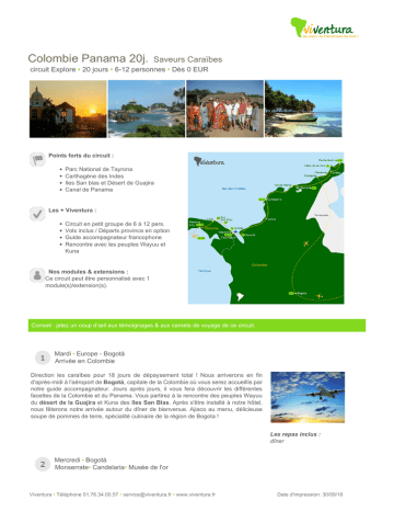 Colombie Panama 20j. Saveurs Caraïbes circuit Explore • 20 jours • 6-12 personnes • Dès 0 EUR Points forts du circuit : Parc National de Tayrona Carthagène des Indes Iles San blas et Désert de Guajira Canal de Panama Les + Viventura : Circuit en petit groupe de 6 à 12 pers. Vols inclus / Départs province en option Guide accompagnateur francophone Rencontre avec les peuples Wayuu et Kuna Nos modules & extensions : Ce circuit peut être personnalisé avec 1 module(s)/extension(s). Conseil : jetez un coup d’œil aux témoignages & aux carnets de voyage de ce circuit. Mardi • Europe - Bogotá Arrivée en Colombie Direction les caraïbes pour 18 jours de dépaysement total ! Nous arriverons en fin d'après-midi à l'aéroport de Bogotá, capitale de la Colombie où vous serez accueillis par notre guide accompagnateur. Jours après jours, il vous fera découvrir les différentes facettes de la Colombie et du Panama. Vous partirez à la rencontre des peuples Wayuu du désert de la Guajira et Kuna des îles San Blas. Après s'être installé à notre hôtel, nous fêterons notre arrivée autour du dîner de bienvenue. Ajiaco au menu, délicieuse soupe de pommes de terre, spécialité culinaire de la région de Bogota ! Les repas inclus : dîner Mercredi • Bogotá Monserrate• Candelaria• Musée de l'or Viventura • Téléphone 01.76.34.00.57 • [email protected] • www.viventura.fr Date d'impression: 30/09/16 Après une bonne nuit de sommeil, nous aurons une journée bien remplie pour visiter Bogotá. Cette ville de 8 millions d'habitants fut fondée en 1538. Nous prendrons le téléphérique pour accéder au Monserrate, montagne qui surplombe la ville. Ce lieu est idéal pour mesurer l'immensité de Bogotá. De retour sur le "plateau", nous nous dirigerons dans le quartier de La Candelaria, qui conserve son caractère authentique avec ses rues pavées et ses vestiges coloniaux. C'est dans ce quartier que l'histoire du pays s'est façonnée au rythme des révolutions. Cette après-midi, nous irons rêvé en parcourant les trésors du Musée de l’or, un musée incontournable de Colombie. Vous y trouverez la plus importante collection d'orfèvrerie pré-hispanique du monde. Les repas inclus : petit déjeuner, déjeuner 3h Jeudi • Bogotá - Cabo de la Vela Cabo de la Vela• vol vers la Péninsule Guajira• Mines de sel de Manaure Changement de décor et direction la côte caraïbe! Nous prendrons ce matin notre vol vers Riohacha, point de départ des excursions vers la péninsule de la Guajira, un paradis hors des sentiers battus. Nous voici sur les terres des indiens Wayuu, seul peuple à ne pas avoir été conquis par les espagnols ! Après notre déjeuner, nous partirons en Jeep en direction de la Guajira. En route, nous visiterons la ville d'Uribia, Manaure et ses mines de sel. Après ces 4 heures de piste au milieu du désert, nous arriverons à Cabo de la Vela, localité située en bord de mer des Caraïbes entre plages désertes et eaux turquoises. Une petite baignade vous tente ? L'eau n'est jamais froide sur ces plages désertes, profitez-en ! Pour terminer notre journée, nous pourrons admirer le coucher de soleil depuis le phare, avant de déguster une spécialité locale : la langouste ou le "Friche", barbecue de chèvre. Note : suivant la composition du groupe, les voyageurs peuvent être regroupés en chambres triples (Jour 3 à 5). Les repas inclus : petit déjeuner, déjeuner, dîner 2h 4h Vendredi • Cabo de la Vela - Punta Gallinas "Pilòn de Azúcar"• Bahia de Portete• Arrivée à Punta Gallinas Direction Punta Gallinas, pointe nord du continent sud-américain ! Nous visiterons d'abord le "Pilòn de Azúcar", petite colline située à 20 minutes à pied de notre hôtel. D'en haut, nous pourrons admirer la vue sur les plaines de la péninsule d'un côté et la mer des Caraibes de l'autre. Nous longerons ensuite le littoral pour rejoindre Punta Gallinas. En route nous pourrons observer des paysages désertiques chariés par la mer. Nous ferons étape à Puerto Bolivar, la belle plage de Pusheo et Bahia de Portete. Au coucher de soleil, la terre prend des couleurs ocre et rouge exceptionnelles ! Important : En fonction des conditions, nous pouvons être amenés à emprunter un bateau comme moyen de transport. Les repas inclus : petit déjeuner, déjeuner, dîner 4h Samedi • Punta Gallinas Punta Aguja• Dunes de Taroa Nous explorerons aujourd'hui les alentours de Punta Gallinas, entre autres, la plage "Punta Aguja" et son phare, pointe géographique la plus septentrionale du continent Sud Américain ! En fin de journée, nous découvrirons la plage de Taroa et ses grandes dunes. Nous les escaladerons, ferons face aux vents forts à cet endroit pour découvrir la mer et un paysage unique. Ce moment marquera la fin de notre expédition sur la Viventura • Téléphone 01.76.34.00.57 • [email protected] • www.viventura.fr Date d'impression: 30/09/16 péninsule de la Guajira. Le soir, pourquoi ne pas déguster une langouste dans ce cadre idyllique et reposant ? Nous passerons la nuit à Punta Gallinas avant de rejoindre la prochaine étape de notre voyage : le parc Tayrona. Les repas inclus : petit déjeuner, déjeuner, dîner 2h 1h Dimanche • Punta Gallinas - Tayrona Bahia Hondita• Uribia Nous commencerons la journée par un tour en bateau de la "Bahia Hondita" jusqu'à La Boquita, un ensemble de petites îles et criques cachées. Nous continuerons notre route en direction d'Uribia où nous déjeunerons. Ensuite, nous mettrons le cap sur le Parc National de Tayrona. Nous quitterons le peuple Wayuu, son artisanat et ses paysages désertiques pour retrouver la végatation luxuriante de la région Magdalena, ses plantations de bananiers et ses plages de sable fin. Nous arriverons en fin d'après midi à notre lodge, situé en bord de mer. En fonction des conditions, nous pouvons être amenés à emprunter un bateau de Punta Gallinas à Puerto B