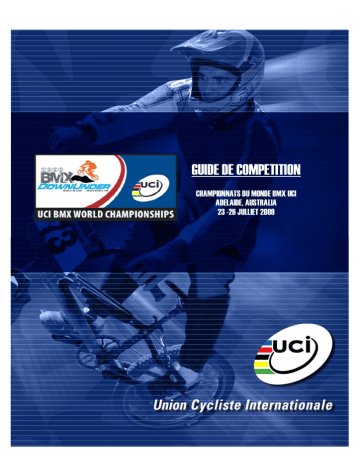 GUIDE DE COMPETITION CHAMPIONNATS DU MONDE BMX UCI ADELAIDE, AUSTRALIA 23 -26 JULLIET 2009 GUIDE DE COMPETITION INTRODUCTION Ce document résume les informations demandées par les Fédérations Nationales, quant à la participation aux Championnats du Monde BMX 2009. 1. PROCEDURED’INSCRIPTION……….........................................................................................2 2. FRAIS D’INSCRIPTION…..………..….........................................................................................3 3. PARAMETRES DE COURSE.....................................................................................................3 4. ACCREDITATIONS ...................................................................................................................5 5. CALENDRIER DE MANIFESTATIONS…...................................................................................6 6. TESTS ANTI-DOPAGE...……………….…………………………………………..…………..……..6 7. PRIX EN ESPECE……………………..……………………………………….……………..…….....6 8. OFFICIELS DE L’UCI ................................................................................................................8 9. INFORMATIONS GENERALES.................................................................................................8 10. CONTACTS...............................................................................................................................9 Ce document prévu notamment pour les Fédérations Nationales ainsi que les chefs d’équipes, focalise principalement sur l’aspect sportif des Championnats du Monde. Pour plus d’information à ce sujet (logement, transport, accréditation…) veuillez vous rendre sur la partie inférieure du document, sous informations générales. S’il vous reste des questions ou suggestions concernant ce document, n’hésitez pas à contacter le siège de l’UCI. Aigle, le 27 avril 2009 1. PROCEDURE D’INSCRIPTION Le système d’inscription en ligne sera activé le 15 mai 2009 et les Fédérations pourront inscrire les coureurs jusqu’aux délais suivants : Délai pour les classes Challenge; 15 juin 2009 Délai pour les classes Championnats (élite); 15 juillet 2009 Toutes les Fédérations sont priées d’utiliser le système d’inscription en ligne. Une pénalité de € 10.sera encaissée à chaque inscription n’ayant pas utilisé le système en ligne, ainsi que les inscriptions ne respectant pas les délais. Veuillez noter que les inscriptions reçues après les délais peuvent être refusées par l’UCI. Merci d’utiliser le login et mot de passe de votre Fédération, (identique à celui utilisé pour toutes les disciplines cyclistes comme communiqué séparément). Vous pouvez y accéder via le site suivant : http://oldsite.uci.ch/uciroot/wscdm.htm Les Fédérations Nationales ayant des factures encore impayées à ce jour concernant les frais d’inscription des Championnats du Monde d’éditions précédentes, ne pourront pas inscrire leurs coureurs pour les Championnats du Monde de BMX et ne pourront pas accéder au système d’inscription en ligne. Chaque coureur doit s’inscrire par le biais de sa Fédération Nationale, aucune inscription individuelle ne sera acceptée. Après la fermeture du système d’inscription en ligne, toutes les Fédérations enregistrant des coureurs pour les Championnats du Monde BMX 2009 recevront une facture pour les frais d’inscription. 2. FRAIS D’INSCRIPTION Championnats du Monde Frais d’inscription Individuels Individuels Equipes Nationales Equipes Nationales Equipe BMX UCI Equipe BMX UCI Championnat Challenge Championnat Challenge Championnat Challenge € 80 € 62 € 80 € 80 € 100 € 100 Inscription Pas faite en ligne Inscriptio n tardive € 90 € 72 € 90 € 90 € 110 € 110 € 90 € 72 € 90 € 90 € 110 € 100 COMPTE EN BANQUE DE L’UCI Les frais d’inscription peuvent être virés sur le compte suivant (Merci de ne pas payer les frais d’inscription à l’avance, mais d’attendre la réception de la facture ! ). Nom de la banque : UBS SA Place Saint-François 1 1003 Lausanne Switzerland Numéro de compte : 243-309288.01M BIC: UBSWCHZH80A Veuillez mentionner votre numéro de facture IBAN: CH23 0024 3243 3092 8801 M Swift: UBSWCHZH10A -2- 3. PARAMETRES DE COURSE Les Championnats du Monde BMX 2009 se dérouleront selon les paramètres suivants (conforme aux règlements de l’UCI) • Classe de la course: selon point 6.1.002, 6.1.003 6.1.004 et 6.1.005 de la partie 6 du règlement UCI 2009. • Détermination de l’âge: selon point 6.1.001 de la partie 6 du règlement UCI 2009. • Composition des classes: selon point 6.1.007 de la partie 6 du règlement UCI 2009. • Système de transfert: selon Annexe 3 de la partie 6 du règlement UCI 2009. • Numéro de course: selon Paragraphe §10 de la partie 6 du règlement UCI 2009. • Numéro de plaque: selon point 6.1.071 et 6.1.072 partie 6 du règlement UCI 2009 • Préinscription: pour les Championnats du Monde BMX Challenge est sujette aux restrictions suivantes : Toutes classes Challenge (Masters inclus); chaque Fédération Nationale pourra inscrire jusqu’à 16 coureurs dans chaque catégorie Challenge qui est programmée pour la compétition. Le pays organisateur pourra inscrire un nombre plus important de coureur dans chaque catégorie limitée, avec un maximum de 32 coureurs. Classes Championnat (bicyclette standard) : aux épreuves de bicyclette standard, dans les catégories Elite et Junior Elite, un coureur pourra s’inscrire uniquement si : - Il a gagné au moins 1 point au classement UCI dans l’année en cours des qualifications pour les Championnats du Monde ou, - Il a gagné au moins 1 point au classement UCI au précédant Championnat du Monde Classes Championnats (Cruiser); Il n’y a pas de restriction pour les 