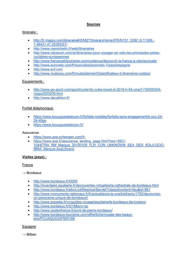 Sources Itinéraire : http://fr.mappy.com/itineraire#/0/M2/TItineraryHome/IFR/N151.12061,6.11309,1.48431,47.25383/Z7/ http://www.viamichelin.fr/web/Itineraires http://www.cityzeum.com/ar/itineraires-pour-voyager-en-velo-les-principales-pistescyclables-europeennes http://www.francevelotourisme.com/contenus/decouvrir-la-france-a-velo/eurovelo http://www.eurovelo.com/fr/eurovelos/eurovelo-1/pays/espagne http://www.ecf.com http://www.routeyou.com/fr/route/planner/0/planificateur-d-itineraires-outdoor Equipements : http://www.go-sport.com/sport/cycle/vtc-cube-travel-sl-2016-h-54-cms/f-730000304mpgs2020209.html http://www.decathlon.fr/ Forfait téléphonique: https://www.bouyguestelecom.fr/forfaits-mobiles/forfaits-sans-engagement/b-you-2424-40go https://www.bouyguestelecom.fr/ Assurance: https://www.axa-schengen.com/fr, https://www.axa.fr/assurance_landing_page.html?xtor=SEC1044[TRA_RM_Marque_20150105_FLR_CON_UNKNOWN_SEA_DES_SOLI]-GOO[BRA_Marque-Axa]-[brand Visites (pays) : France → Bordeaux http://www.bordeaux.fr/l3293 http://inventaire.aquitaine.fr/decouvertes-virtuelles/la-cathedrale-de-bordeaux.html http://www.bordeaux.fr/ebx/LinkResolverServlet?classofcontent=lieu&id=961 http://www.monuments-nationaux.fr/fr/actualites/a-la-une/bdd/actu/1792/decouvrezun-panorama-unique-de-bordeaux// http://www.expedia.fr/vc/guides-voyage/aquitaine/le-bordeaux-de-lunesco http://www.bordeaux.fr/l218&src=sp http://www.cestenfrance.fr/pont-de-pierre-bordeaux/ http://www.bordeaux-tourisme.com/offre/fiche/musee-des-beauxarts/PCUAQU033FS00168 Espagne → Bilbao http://www.guggenheim-bilbao.es/fr/horaires-et-tarifs/ http://www.bilbaoturismo.net/BilbaoTurismo/fr/nuevos-puentes/pont-zubizuri http://www.info-stades.fr/article/510/photos-video-nouveau-stade-san-mames-athleticbilbao http://www.bilbao.net/cs/Satellite/funicularArtxanda/Horarios---Tarifas--Normas/es/100001131/Contenido http://www.bilbaoturismo.net/BilbaoTurismo/fr/plazas/place-de-federico-moyua http://www.inseec-travel-tips.com/2014/bilbao-ville-il-fait-bon-vivre http://www.inseec-travel-tips.com/2014/bilbao-ville-il-fait-bon-vivre → Madrid http://www.cityzeum.com/palais-royal-4 http://www.cityzeum.com/museo-nacional-del-prado http://www.routard.com/mag_dossiers/id_dm/110/ordre/15.htm http://www.habitatapartments.com/fr/madrid/main-sights/view/plaza-de-cibeles http://www.habitatapartments.com/fr/madrid/main-sights/view/crystal-palace http://www.jdroadtrip.tv/blog/stade-santiago-bernabeu-real-madrid/ www.munimadrid.es/templodebod → Cordoue http://francais.turismodecordoba.org/seccion/la-mosquee-cathedrale-de-cordoue http://www.spainisculture.com/fr/jardines_historicos/cordoba/alcazar_de_los_reyes_cr istianos.html http://www.spainisculture.com/fr/monumentos/cordoba/calleja_de_las_flores.html http://www.andalucia.org/es/turismocultural/visitas/cordoba/monumentos/palacio-dela-merced/ → Grenade http://www.alhambradegranada.org/fr/info/billeterie.asp http://www.cityzeum.com/chapelle-royale-a-grenade http://structurae.info/ouvrages/stade-nuevo-los-carmenes https://www.expedia.fr/Parc-Federico-Garcia-Lorca-Grenade.d6067149.Sites-dInteret → Valence http://www.visitvalencia.com/fr/que-visiter-valencia/monuments/liste-desmonuments/monument/7809 http://www.easyvoyage.com/espagne/la-cathedrale-de-valence-6337 http://www.torosvalenciatour.com/fr/tarifas-y-horarios/ http://www.spainisculture.com/fr/monumentos/valencia/torres_de_serranos.html → Barcelone http://www.barcelona-tourist-guide.com/fr/attraction/musee-barcelone.html#sagrada http://www.barcelona-tourist-guide.com/fr/gaudi/parc-guell.html http://www.barcelona-tourist-guide.com/fr/albums-fr/magic-fountains-montjuic/ https://www.classictic.com/fr/barcelone/basilica_santa_maria_del_pi/543/ http://www.barcelonaturisme.com/wv3/fr/page/1211/.html http://fr.barcelona.com/annuaire_barcelone/musees_barcelone/musee_picasso_barc elone http://fr.barcelona.com/annuaire_barcelone/monuments_barcelone/palais_de_la_mus ique http://www.barcelona-tourist-guide.com/fr/gaudi/casa-batllo.html France → Nimes http://arenes-nimes.tickeasy.com/Information.aspx http://www.avignon-et-provence.com/tourisme-gard/nimes-ville-romaine/maisoncarree-nimes.htm#.VkoJFoRjGQs http://www.nimes.fr/index.php?id=285&id_site=7 Italie: → Turin : http://www.juventus.com/it/ http://www.bellitalie.org/turin.php → Milan : http://www.visiter-milan.com/ https://www.expedia.fr/things-to-do/visite-du-theatre-de-la-scala-et-de-sonmusee.a182439.detailsactivites?regionId=180012&semcid=FR.MULTILOB.GOOGLE.SEARCH.TSHOP&kwo rd=+visite_+scala_+milan!m.ZzZz.4280000009724.0.88303925350.%2Bvisite%20%2 Bscala%20%2Bmilan.+visite_+scala_+milan®ionId=59&semcid=FR.MULTILOB.G OOGLE.SEARCH.TSHOP&kword=france_activities_DSA!e.ZzZz.4280000002077.0.8 1262153226._inurl%3Awww.expedia.fr%2Fthings-to-do%23inurl%3Adetailsactivites.france_activities_dsa&gclid=Cj0KEQiAyIayBRDo4vjdqJrgxZ0BEiQAhOYCY EgWjdoXSns9Ezu_l_zYVAhUoHB3CPWTdhAb3hvGi68aAtFp8P8HAQ → Genes : http://www.visitgenoa.it/sites/default/files/G%C3%AAnes%20en%20poche_0.pdf http://teatriemusei.ovest.com/ http://teatriemusei.ovest.com/fr/palais-ducal-de-genes.php http://teatriemusei.ovest.com/fr/aquarium-de-genes.php → Pise : http://www.venere.com/fr/blog/prix-entrees-tour-de-pise/ http://www.monnuage.fr/voyage/italie/toscane/pise → Florence: http://www.florence-tourisme.com/ http://www.florence-tourisme.com/programme-un-jour.html → Pérouse : https://www.google.fr/webhp?sourceid=chrome-instant&ion=1&espv=2&ie=UTF8#q=p%C3%A9rouse%20cath%C3%A9drale%20san%20lorenzo%20entr%C3%A9e %20prixhttp://www.bellitalie.org/photos-perouse.html#porteetrusque → Rome : http://www.rome-passion.com/ → Venise : http://monumentsdevenise.com/ http://www.gallerieaccademia.org/?lang=fr http://www.palazzograssi.it/fr/billetterie-et-horaires Slovénie: → Ljubljana : http://www.tourisme-slovenie.com/ljubljana-chateau.html → Celje : http://www.slovenia.info/pictures/publication_language/2010/STO__Katalog_Zgodovinska_mesta_FR