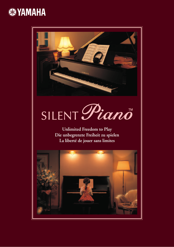 Unlimited Freedom to Play Die unbegrenzte Freiheit zu spielen La liberté de jouer sans limites Real Pianos...with Real Advantages Akustische Klaviere...mit echten Vorteilen De Vrais Pianos…avec de Vrais Avantages Imagine yourself seated at a classic Yamaha piano. Picture the elegant craftsmanship... the superb tone... the renowned responsive sensitivity of the Yamaha keyboard and action. Now imagine that you could also play the same instrument in total privacy through headphones, with the same touch, tone and expressive control. Integrating state-of-the-art Yamaha digital components into traditional Yamaha pianos, Silent Piano™ instruments offer unparalleled flexibility. Students, for example, can practice scales while others in the same room converse or watch TV, eliminating any need for a separate music room. Creative musicians can pursue their vision without restraint, even while housemates are asleep, and interact with MIDI and audio equipment. City dwellers need never worry about neighbors nearby. And educators can have multiple pianos in a single room, without players interfering with one another. Yet despite these extended capabilities, you still enjoy all the inimitable attributes of a fine acoustic piano. Expanding your opportunities without compromising your standards—that, in essence, is the integral advantage of Yamaha Silent Piano™. Stellen Sie sich vor, Sie säßen an einem klassischen Klavier von Yamaha. Eleganz...wunderschöner Klang... die einmalige Anschlagsdynamik der Yamaha Klaviatur und Mechanik. Stellen Sie sich nun weiterhin vor, dass Sie dasselbe Instrument in totaler Stille über einen Kopfhörer spielen könnten, und das mit demselben Klang, derselben Dynamik und demselben Spielgefühl! Durch die Integration der modernen digitalen Yamaha Komponenten in die traditionellen Yamaha Klaviere und Flügel bieten die Silent Piano™ Instrumente eine beispiellose Flexibilität. So ist es zum Beispiel möglich zu üben, ohne darauf Rücksicht nehmen zu müssen, dass Familienmitglieder oder Nachbarn gestört werden. Kreative Musiker können ihren Ideen freien Lauf lassen und mit MIDI-fähigen Geräten arbeiten, selbst wenn andere Personen im Hause schlafen. So bietet sich für Musikschulen die Möglichkeit mehrere Klaviere in einem Unterrichtsraum zu verwenden, ohne dass sich die Schüler gegenseitig stören. Trotz dieser erweiterten Fähigkeiten kommen Sie natürlich weiterhin in den Genuss eines klassischen akustischen Klaviers. Der wesentliche Vorteil der Yamaha Silent Piano™ Klaviere und Flügel liegt also darin, dass Sie Ihre Möglichkeiten erweitern, ohne Ihre Anforderungen einschränken zu müssen. Imaginez-vous installé(e) devant un piano acoustique Yamaha. Appréciez la qualité de finition du meuble... écoutez cette superbe sonorité... ressentez la qualité du toucher et de la mécanique qui font la réputation des pianos Yamaha. Maintenant, imaginez que vous puissiez également jouer ce même instrument, rien que pour vous, grâce à l’utilisation d’un casque, avec la même qualité de toucher, de sonorité et d’expression musicale. En intégrant, au piano traditionnel, les composants électroniques issus des technologies de pointe développées par Yamaha, les pianos de la série Silent PianoMD vous offrent une incomparable souplesse d’utilisation. Par exemple, les étudiants peuvent faire leurs gammes dans la même pièce où d’autres personnes conversent ou regardent la télévision. Il n’est donc plus nécessaire d’avoir une pièce réservée pour le piano. La créativité musicale peut s’exprimer pleinement, toute la nuit, en communiquant entre le Silent PianoMD et des périphériques MIDI et audio. Il n’est plus nécessaire de s’inquiéter du bruit pour les voisins, et une seule salle de travail (dans un conservatoire par exemple) peut être équipée de plusieurs pianos sans aucune gène pour les élèves. Avec toutes les fonctions qui vous sont offertes, vous savourez les qualités inimitables d’un piano de facture irréprochable. L’étendue de vos possibilités, sans compromettre vos qualités pianistiques, voilà l’avantage essentiel des pianos Yamaha de la série Silent PianoMD. Grand pianos • Flügel • Pianos à queue Grand “Silent Piano ” ™ Normal mode Hammer shank stopper Hammer sensor Silent Piano™ mode QuickEscape mechanism Grayscale key sensor The Yamaha QuickEscape action automatically optimizes hammer escapement for normal and Silent Piano™ play, ensuring natural keyboard touch and response in either mode of play. Shutter Silent Piano™ lever Tone generator Der Yamaha QuickEscape-Mechanismus optimiert die Hammerauslösung im Silent Piano™-Modus automatisch, um zwischen normalem Betrieb und Silent Piano™-Modus so umzuschalten zu können, dass der natürliche Anschlag und das Ansprechverhalten in beiden Spielarten erhalten bleiben. Le système QuickEscape de Yamaha améliore le retour du marteau en mode Normal et en mode Silent PianoMD, assurant un toucher et un niveau de réponse naturels du clavier. Inside a Grand “Silent Piano™” ™ The Grand Silent Piano System is designed to capture all the tonal subtleties of the grand piano. The shift of a lever keeps hammers from striking the strings, while a small control unit activates digital piano tones. Grayscale key, hammer and pedal sensors register every motion, including keyrelease velocity. Contact-free optical sensing and a QuickEscape action mechanism maintain natural touch and response in both normal and Silent Piano™ play. Ultra-realistic digital piano tones are stereo sampled from the CFIIIS Yamaha concert grand. Using 30 MB of memory, they even reproduce the harmonics of other strings when using the sustain pedal. Reverb effects can simulate chamber and hall acoustics. MIDI, AUX and dual headphone jacks let you interact with external equipment, play at controlled volume through external speakers, play along with audio acco