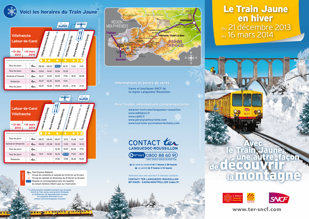 * Tous les jours 08.50 09.43 10.10 10.37 11.33 11.51 Tous les jours 13.50 14.43 15.06 15.25 - - 16.55 17.16 18.12 18.28 16.25 16.55 17.14 - - Tous les jours 18.47 19.38 19.59 20.20 21.15 21.31 Latour-de-Carol Villefranche > 21 déc 2013 > 16 mars 2014 FontRome u-Od eillo-V ia Mont -Louis -la-C aban asse Fontp édrou se-St -Thom as Villef ranch e-Ver net-le s-Bain s 16.25 15.27 1 Latou r-deCaro l-Env eitg Bour g-Ma dame 15.27 Dimanche Vendredi et Samedi PERPIGNAN T êt Ca ir pc e l nf Aud Toulouse 2027 m Pic de la Fageolle Vinça e nt Ille-sur-Têt 08.27 08.45 09.47 10.12 10.38 11.27 09.20 09.38 10.39 11.05 11.26 12.14 Tous les jours - - 15.35 15.57 16.20 17.13 Tous les jours 15.17 15.35 16.33 16.55 17.20 18.13 Dimanche - - 17.35 17.59 18.30 19.29 Samedi et Dimanche 2 Ria-Sirach Marquixanes PYRÉNÉES PYRÉNÉES ORIENTALES Tech 2910 m Le Puigmal Barcelone Informations et points de vente : Gares et boutiques SNCF de la région Languedoc-Roussillon Pour toutes informations complémentaires : www.ter-sncf.com/languedoc-roussillon www.laRégion.fr www.cg66.fr www.perpignantourisme.com www.tourisme-pyreneesorientales.com CONTACT LANGUEDOC-ROUSSILLON Avec le Train Jaune, une autre façon 0800 88 60 91 APPEL GRATUIT DEPUIS UN POSTE FIXE Le samedi de 9 heures à 14 heures Légende Elne ORIENTALES Du lundi au vendredi de 7 heures à 20 heures Train Express Régional 1 Circule les vendredis et samedis du 14 février au 15 mars 2 Circule les samedis et dimanches du 15 février au 16 mars --.-- Horaires en correspondance avec les navettes du Conseil Général à Mont-Louis sur réservation Du Prades-Molitg-les-Bains N'oubliez pas de vous reporter aux renvois ci-dessous Tous les jours 21 décembre 2013 au 16 mars 2014 Le Soler St-Féliu-d’Avall Villefranche - Vernet Les Bains Serdinya Co Olette - Canaveilles-les-Bains Joncet Mont-Louis Nyer La-Cabanasse Thuès-les-Bains Bolquère-Eyne Sauto Thuès-Carança Latour- Font-Romeu de-Carol Odeillo-Via Estavar Planès Fontpédrouse St-Thomas Bena-Fanes Saillagouse pir Ur-les-Escaldes les Err Bourg-Madame al V Osséja Ste-Léocadie Odeillo-Via Têt Millas La Sentinelle pour RCS Montpellier 490 867 744 - Octobre 2013 N'oubliez pas de vous reporter aux renvois ci-dessous Horaires non contractuels donnés sous toute réserve de modifications > 16 mars 2014 RÉGION MIDI PYRÉNÉES Le Train Jaune en hiver Etang de Leucate Palais des Rois de Majorque Ag ly Fenouillèdes Pays de Sault gre Sè > 21 déc 2013 Latou r-deCaro l-Env eitg Villefranche Latour-de-Carol Villef ranch e-Ver net-le s-Bain s Fontp édrou se-St -Thom as Mont -Louis -la-C aban asse FontRome u-Od eillo-V ia Bour g-Ma dame Voici les horaires du Train Jaune Adressez tous vos courriers à l'adresse suivante : CONTACT TER LANGUEDOC-ROUSSILLON BP 31025 - 34006 MONTPELLIER Cedex 01 de découvrir la montagne * La fiche horaires complète reprenant tous les points d'arrêt du Train Jaune, ainsi qu'entre Perpignan et Villefranche, est disponible dans les gares du Languedoc-Roussillon ou sur www.ter-sncf.com/languedoc-roussillon www.ter-sncf.com Avec la Région Languedoc-Roussillon, Du 21 décembre 2013 au 16 mars 2014 Au départ de toutes les gares de la Région Languedoc-Roussillon, découvrez le Train Jaune, une façon unique et écomobile de profiter des charmes de la Cerdagne en famille ou entre amis… La Région Languedoc-Roussillon et la SNCF vous proposent un seul prix 11,00€ ALLERRETOUR quelles que soient l’origine et la destination entre Perpignan et Latour-de-Carol - Enveitg, avec un forfait valable de 1 à 8 jours au choix. En achetant votre billet "Le Train Jaune en hiver", vous bénéficiez de nombreux avantages : Nos partenaires Prix valables par personne sur présentation du billet "Train Jaune en hiver" La navette à 1€ du Conseil Général des Pyrénées Orientales Les correspondances sont assurées avec les trains arrivant à 10h10 à l'aller et partant à 16h55 au retour. Réservation transport à la demande, la veille avant 16h et le vendredi pour le week-end et le lundi (du 21 décembre 2013 au 16 mars 2014). Téléphone : 04 68 80 80 80 Gare de Mont-Louis Pyrénées 2000 Navette 1€ par trajet simple et par personne 50% de réduction sur les parcours complémentaires pour rejoindre Perpignan au départ de toutes les gares de la Région Languedoc-Roussillon conjointement à l'achat du forfait "Le Train Jaune en hiver". Les Bains Chauds de St-Thomas à prix réduits et la navette gratuite au départ de la gare de Fontpédrouse. + + + adoptez la solution pratique et écomobile ! Le choix d’une journée détente aux Bains Chauds de St-Thomas à Fontpédrouse Pour rejoindre les stations de ski de l’Espace Cambre d’Aze à Eyne / St-Pierre-Dels-Forcats et de Pyrénées 2000, au départ de la gare de Mont-Louis-la-Cabanasse une navette du Conseil Général des Pyrénées Orientales vous amène au pied des pistes (possibilité de rejoindre Font-Romeu par la télécabine de Pyrénées 2000). Espace Cambre d'Aze + • Des navettes gratuites au départ de la gare de Fontpédrouse jusqu’au site des Bains. Départs : 10h, 13h et 17h. Réservation 48h à l'avance. • Des tarifs préférentiels pour l’accès aux Bains. Plusieurs formules vous sont proposées : les Bains Chauds, le hammam, des offres beauté et détente. • Des formules de massages vous sont également proposées. Réservation conseillée. Une restauration rapide et un snack sont à votre disposition sur le site des Bains de St-Thomas, pour encore mieux profiter de votre journée de détente... Téléphone : 04 68 97 03 13 www.bains-saint-thomas.fr Vous pouvez aussi vous restaurer au village de Fontpédrouse : restaurant "Hôtel Bigorre / Chez Sylviane", réservation au 04 68 97 05 08. Bains : 4,5€ par adulte et 3€ par enfant* (1€ d'économie) Hammam + Bains** : 10€ par personne (2€ d'économie) L’Espace Cambre d’Aze à Eyne / St-Pierre-Dels-Forcats Contact station : 04 68 04 08 01 - www.cambre-d-aze