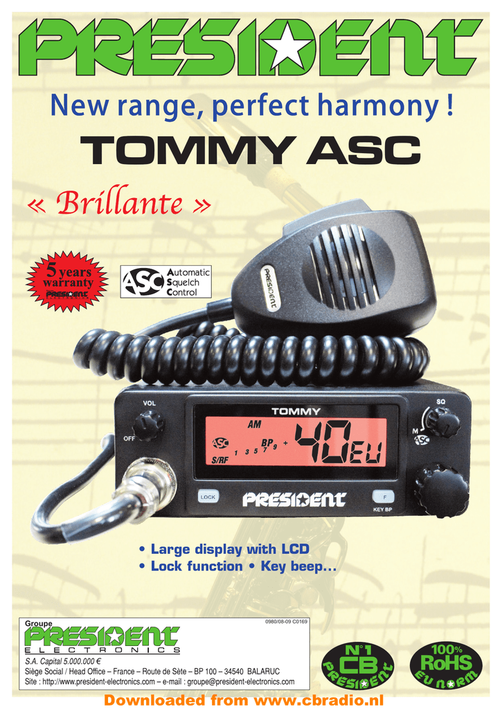 New range, perfect harmony ! TOMMY ASC « Brillante » 5 years warranty Groupe • Large display with LCD • Lock function • Key beep... Groupe 0980/08-09 C0169 100% S.A. Capital 5.000.000 € Siège Social / Head Office – France – Route de Sète – BP 100 – 34540 BALARUC Site : http://www.president-electronics.com – e-mail : [email protected] Downloaded from www.cbradio.nl RoHS Functions TOMMY ASC B C EXT. SP. 8 ANT. POWER A 2 1 3 4 SQ VOL TOMMY AM OFF M BP S RF LOCK F KEY BP MIC 7 1) ON/OFF – VOLUME 2) DISPLAY 3) ASC (Automatic Squelch Control) / SQUELCH 4) CHANNEL SELECTOR: Rotary Knob 5) F ~ KEY BP 5 6 6) 7) 8) A) B) C) LOCK 6 PIN MICROPHONE PLUG PTT DC-POWER TERMINAL (13,2 V) ANTENNA CONNECTOR (SO-239) EXTERNAL SPEAKER JACK (8 Ù, Ø 3,5 mm) 0981/08-09 C0169b 1) GENERAL - Channels - Modulation modes - Frequency ranges - Antenna impedance - Power supply - Dimensions (in mm) - Weight - Accessories supplied - Filter 2) TRANSMISSION - Frequency allowance - Carrier power - Transmission interference - Audio response - Emitted power in the adj. channel - Microphone sensitivity - Drain - Modulated signal distortion : 40 : AM : from 26.965 MHz to 27.405 MHz : 50 ohms : 13.2 V : 125 (L) x 150 (H) x 45 (D) : ~ 0.7 kg : Electret microphone with support, mounting cradle, screws. : ANL (Automatic Noise Limiter) built-in : +/- 200 Hz : 1 W AM : inferior to 4 nW (- 54 dBm) : 300 Hz to 3 KHz Specifications 3) RECEPTION - Maxi. sensitivity at 20 dB sinad - Frequency response - Adjacent channel selectivity - Maximum audio power - Squelch sensitivity : 0.5 µV - 113 dBm : 300 Hz to 3 kHz : 60 dB :2W : minimum 0.2 µV - 120 dBm maximum 1 mV - 47 dBm - Frequency image rejection rate : 60 dB - Intermediate frequency rejection rate : 70 dB - Drain : 300 mA nominal 750 mA maximum : inferior to 20 µW : 7 mV : 1,7 A (with modulation) : 1,8 % all european standards 100% RoHS