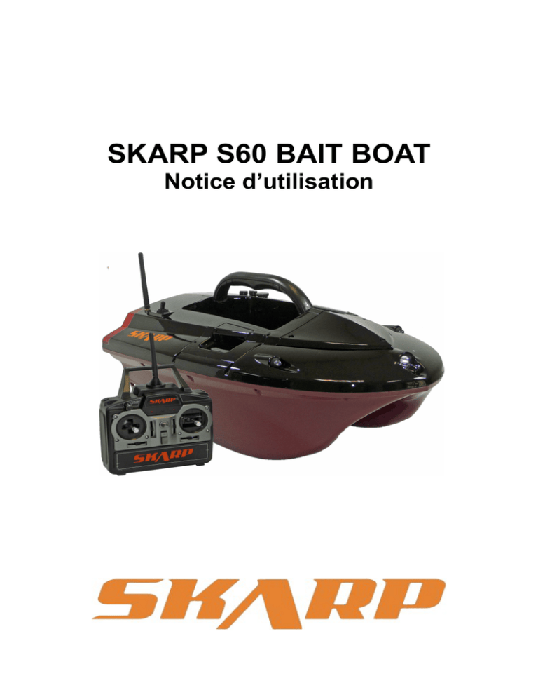 SKARP S60 BAIT BOAT Notice d’utilisation Le pack contient : Le Skarp S60 Bait Boat est livré avec les éléments suivants : • 1 x bateau amorceur • 1 x télécommande digitale 2.4gHz 4 canaux • 2 x batterie rechargeable 6V 7.2Amp • 8 x piles rechargeables Ni-MH AA 1500mAh 1.2V pour la télécommande • 1 x chargeur secteur pour le bateau • 1 x chargeur secteur pour la télécommande • 1 x sac transport pour le bateau Spécifications techniques : • • • • • • • • • • • • Dimensions (L x l x H) : 58cm x 38cm x 26cm Poids : 7.5 kg avec batterie et télécommande Trappes : 2 indépendantes Capacité: environ 3kg (2 x 1.5kg par trappe). Vitesse maximum : 100m/minute (sans les protections hélices anti-algues) 60m/minute (avec les protections hélices anti-algues) Intensité électrique: 12V Distance : 400 – 600 mètres variable selon les conditions Éclairage : 3 avants (incluant le projecteur central), 2 arrières et 3 indicateurs de batteries Télécommande : 2.4gHz 4 canaux Propulsion : 2 moteurs indépendants Batteries : 6V 7.2Amp + 8 piles rechargeables Ni-MH AA 1500mAh 1.2V pour la télécommande Autonomie : environ 2 heures à pleine puissance Spécifications et caractéristiques Le Skarp S60 possède les caractéristiques suivantes : • • • • • • • • • • • • Coque ABS de type « catamaran » conçue pour lui garantir une stabilité sur l'eau exceptionnelle. Les éléments de la coque sont fixés par des vis inox qui offrent une durabilité accrue. Le joint silicone qui relie la partie basse de la partie haute du bateau assure une étanchéité parfaite de la coque. Pour vous permettre de facilement manipuler le bateau, ce dernier possède une poignée de transport. La télécommande digitale bénéficie d'un système d'émission 2.4gHz 4 canaux pour vous offrir une portée optimale et réduire fortement les possibilités d’interférences. La portée du bateau est variable entre 400m et 600m en fonction des conditions météorologiques et environnementales. Il est préconisé d'utiliser les piles rechargeables et le chargeur de télécommande fournis avec le bateau. La vitesse en marche avant et arrière est contrôlée par un microprocesseur afin de vous assurer une grande maniabilité pour vous permettre des déposes de ligne d'une grande précision. Un système de sécurité vous permettra de récupérer votre bateau en cas de perte de signal ou de batteries faibles de celui-ci. Pour plus de polyvalence, chaque trappe est indépendante afin de vous permettre d'amorcer de façon plus large autour de votre montage. Le système de largage des lignes situé sur l'arrière du bateau, vous permettra de déposer deux lignes indépendamment en limitant les risques d'emmêlement lors du largage. Les deux moteurs à faible consommation d’énergie vous garantiront une propulsion puissante grâce aux hélices 3 pales qui équipent chaque moteur. Le bouton marche/arrêt ainsi sur toutes les prises de connexion sont étanches. Pour une visibilité optimale de jour comme de nuit, le bateau est équipé de 5 lumières (1 phare de navigation à l'avant, 2 diodes haute visibilité à l'avant et 2 phares arrières rouge à l'arrière). L'indicateur du niveau de charge de la batterie est représenté par 3 diodes sur l'arrière du bateau. Le phare de navigation à l'avant peut être contrôlé à partir de la télécommande. Les capots latéraux magnétiques étanches vous faciliteront le remplacement rapide des batteries. Maintenance chargeurs et batteries • • • • • Nous vous recommandons d’utiliser les chargeurs livrés avec le bateau. Vérifiez que le bateau et la télécommande soient bien éteints avant la charge. La première charge de la batterie du bateau prendra environ 8 h (pour une charge complète). La première charge des piles de la télécommande prendra environ 8 h (pour une charge complète). Pour ceux qui le souhaitent, il est possible utiliser des piles standard de type AA pour la télécommande. Chargez les batteries de la télécommande : Placez les 8 accus dans le compartiment arrière de la télécommande et refermez la trappe. Connectez le chargeur à une prise et connectez le à votre télécommande. Une lumière rouge s’allumera. Lorsque la lumière du chargeur passera au vert, cela vous indiquera que vos accus sont totalement chargées. Chargez la batterie du bateau : Connectez la batterie au chargeur avec le connecteur fourni, puis branchez le chargeur sur une prise. Une lumière rouge s’allumera. Lorsque la lumière du chargeur passera au vert, cela vous indiquera que le chargement de la batterie est terminé. Vous pouvez aussi charger votre batterie directement dans le bateau en connectant votre chargeur sur la prise ci-dessus. Toutefois, il est primordial de vérifier que votre bateau est bien arrêté. Utilisation : Télécommande 1. 2. 3. 4. 5. 6. 7. 8. 9. Marche avant : poussez le Joystick droit vers l’avant. Marche arrière : poussez le Joystick droit vers l’arrière. Tourner à gauche : poussez le Joystick droit à gauche Tourner à droite : poussez le Joystick droit à droite. Ouvrir la trappe gauche : poussez le Joystick gauche à gauche. Ouvrir la trappe droite : poussez le Joystick gauche à droite. Lâcher la ligne : poussez le Joystick gauche en bas. Phare de navigation ON/OFF : allumage/extinction du phare avant. Réglage moteur : “balance” de réglage de la puissance des moteurs pour avancer le plus droit possible. Bateau Chargement et largage de l’amorce 1. 2. 3. 4. Fermez les trappes à la main en les refermant vers le haut. Remplissez avec l'amorce de votre choix. Bougez le Joystick gauche vers la gauche pour ouvrir la trappe gauche. Bougez le Joystick gauche vers la droite pour ouvrir la trappe droite. Accrocher et libérer les lignes 1. Accrochez votre hameçon sur le système d'accroche-ligne prévu à l’arrière du bateau. 2. Bougez le Joystick gauche en bas