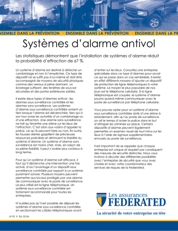 NSEMBLE DANS LA PRÉVENTION · ENSEMBLE DANS LA PRÉVENTION · ENSEMBLE DANS LA PR Systèmes d’alarme antivol Les statistiques démontrent que l’installation de systèmes d’alarme réduit la probabilité d’effraction de 67 %. Un système d’alarme est destiné à détecter un cambriolage et non à l’empêcher. Ce type de dispositif ne se suffit pas à lui-même et doit être accompagné de moyens de sécurité physiques comme des verrous à pêne dormant, un éclairage suffisant, des fenêtres de sous-sol sécurisées et des portes extérieures solides. Il existe deux types d’alarmes antivol : les alarmes sous surveillance contrôlée et les alarmes sans surveillance. Les systèmes d’alarme sous surveillance contrôlée avisent un tiers lorsque l’alarme est déclenchée, tiers qui à son tour avise les autorités d’un cambriolage ou d’une effraction. Une alarme sans surveillance ne fait qu’émettre une sirène sur les lieux de l’effraction. C’est alors aux voisins d’appeler la police, ce qu’ils peuvent faire ou non. En outre, les fausses alertes gaspillent de précieuses ressources policières et diminuent la fiabilité du système d’alarme. Un système d’alarme sans surveillance est moins cher, mais, en raison de sa piètre fiabilité, il peut s’avérer plus coûteux à long terme. Pour qu’un système d’alarme soit efficace, il faut qu’il déclenche une intervention une fois activé, d’où l’avantage d’un dispositif sous surveillance contrôlée par rapport à un système purement sonore. Plusieurs moyens peuvent permettre aux locaux protégés par une alarme de communiquer avec le poste de surveillance. Le plus utilisé est la ligne téléphonique. Un système sous surveillance contrôlée est fortement recommandé pour toutes les entreprises. N’oubliez pas qu’il est possible de déjouer les systèmes d’alarme sous surveillance contrôlée en sectionnant les câbles téléphoniques avant LP-92 fr Éd. 02-06 d’entrer sur les lieux. Consultez une entreprise spécialisée dans ce type d’alarmes pour savoir ce qui se passe dans un cas semblable. Il existe en effet différents moyens d’ajouter un dispositif de protection de ligne téléphoniques à votre système. Le moyen le plus populaire de nos jours est le téléphone cellulaire. Si la ligne téléphonique est coupée, le système d’alarme pourra quand même communiquer avec le poste de surveillance par téléphone cellulaire. Vous pouvez opter pour un système d’alarme sous surveillance contrôlée doté d’une sirène à retardement, afin qu’au poste de surveillance on ait le temps d’aviser la police dans le but d’attraper les criminels sur place. Certains dispositifs d’alarme peuvent également permettre un examen visuel de tout intrus sur les lieux à l’aide de signaux supplémentaires envoyés au poste de surveillance. Il est important de se rappeler que chaque entreprise est unique et requiert par conséquent des mesures de sécurité distinctes. Nous vous invitons à discuter des différentes possibilités avec l’entreprise de sécurité que vous avez choisie et avec votre coordonnateur des services de risques de la Federated. Terminologie propre aux systèmes d’alarme Détecteur de mouvement Les systèmes munis de détecteurs de mouvement peuvent repérer les mouvements dans les zones couvertes par le détecteur. Certains de ces systèmes émettent des ondes radio haute fréquence dans la zone sécurisée d’une pièce ou d’un couloir. D’autres systèmes fonctionnent avec des infrarouges pour détecter les changements de température; ainsi, une personne qui passe près du détecteur est trahie par sa température corporelle. Détecteurs de contact La plupart des alarmes destinées à sécuriser portes et fenêtres font appel à un interrupteur de contact magnétique, formé de deux parties métalliques qui doivent demeurer en contact lorsque le capteur est armé. Le capteur se trouve dans la partie du dispositif contenant l’interrupteur, l’autre face étant munie d’un aimant. L’ouverture de la fenêtre ou de la porte provoque ainsi la séparation des deux parties du mécanisme, ce qui déclenche l’envoi du signal d’alarme. Détecteur de bris de vitres Les détecteurs acoustiques de bris de vitres détectent le son du verre brisé. Ils peuvent également détecter les ondes de choc soudaines émises lorsqu’un objet casse ou lorsqu’une porte est enfoncée. Dans ce cas, c’est l’onde de choc émise par le verre brisé, et non le bruit lui-même, qui est détectée. Systèmes de sécurité sans fil Les systèmes de sécurité sans fil modernes ne nécessitent aucun câblage encombrant; ainsi, les câbles ne peuvent être arrachés accidentellement et on ne peut y enfoncer des clous par mégarde, ce qui risque de déclencher l’alarme ou de désactiver le système. Les systèmes sans fil sont plus mobiles et offrent plus de souplesse, que ce soit pour protéger une pièce ou tout autre lieu d’une propriété. Systèmes de sécurité à faisceau Ils sont constitués de faisceaux photoélectriques, de transmetteurs et de récepteurs. Toute interruption du faisceau déclenche l’alarme. On peut les utiliser à l’intérieur des bâtiments ou à l’extérieur pour protéger des aires clôturées. Détecteurs de chaleur et de fumée Ces éléments peuvent être ajoutés facilement à tout système d’alarme antivol. Les alarmes antivol ont un effet dissuasif et améliorent la sécurité des bâtiments et terrains. Le coût des systèmes d’alarmes antivol est minime comparé à celui des biens volés; ce type de système est indispensable pour protéger votre entreprise. Ensemble dans la prévention Chez les assurances Federated, nous croyons que la prévention des sinistres est un élément essentiel de votre programme de gestion des risques. Vous pouvez compter sur votre coordonnateur des services de risques et sur votre équ