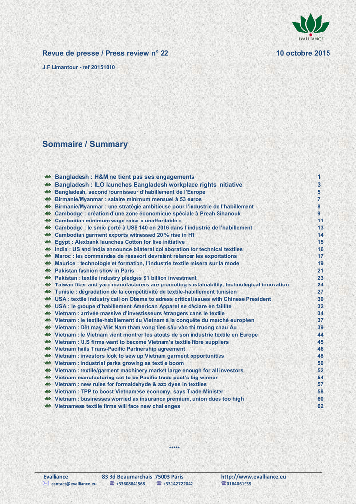 Revue de presse / Press review n° 22 10 octobre 2015 J.F Limantour - ref 20151010 Sommaire / Summary Bangladesh : H&M ne tient pas ses engagements Bangladesh : ILO launches Bangladesh workplace rights initiative 1 3 Bangladesh, second fournisseur d’habillement de l’Europe Birmanie/Myanmar : salaire minimum mensuel à 53 euros Birmanie/Myanmar : une stratégie ambitieuse pour l’industrie de l’habillement Cambodge : création d’une zone économique spéciale à Preah Sihanouk Cambodian minimum wage raise « unaffordable » Cambodge : le smic porté à US$ 140 en 2016 dans l’industrie de l’habillement Cambodian garment exports witnessed 20 % rise in H1 Egypt : Alexbank launches Cotton for live initiative India : US and India announce bilateral collaboration for technical textiles Maroc : les commandes de réassort devraient relancer les exportations Maurice : technologie et formation, l’industrie textile misera sur la mode Pakistan fashion show in Paris Pakistan : textile industry pledges $1 billion investment Taiwan fiber and yarn manufacturers are promoting sustainability, technological innovation Tunisie : dégradation de la compétitivité du textile-habillement tunisien USA : textile industry call on Obama to adress critical issues with Chinese President USA : le groupe d’habillement American Apparel se déclare en faillite Vietnam : arrivée massive d’investisseurs étrangers dans le textile Vietnam : le textile-habillement du Vietnam à la conquête du marché européen Vietnam : Dêt may Viêt Nam tham vong tien sâu vào thi truong chau Au Vietnam : le Vietnam vient montrer les atouts de son industrie textile en Europe Vietnam : U.S firms want to become Vietnam’s textile fibre suppliers Vietnam hails Trans-Pacific Partnership agreement Vietnam : investors look to sew up Vietnam garment opportunities Vietnam : industrial parks growing as textile boom Vietnam : textile/garment machinery market large enough for all investors Vietnam manufacturing set to be Pacific trade pact’s big winner Vietnam : new rules for formaldehyde & azo dyes in textiles Vietnam : TPP to boost Vietnamese economy, says Trade Minister Vietnam : businesses worried as insurance premium, union dues too high Vietnamese textile firms will face new challenges 5 7 8 9 11 13 14 15 16 17 19 21 23 24 27 30 32 34 37 39 44 45 46 48 50 52 54 57 58 60 62 ***** Evalliance 83 Bd Beaumarchais 75003 Paris [email protected] +33608841568 +33142722042 http://www.evalliance.eu 0184061955 ACCORD BANGLADESH : H&M NE TIENT PAS SES ENGAGEMENTS LES OUVRIERS DES USINES CONTINUENT À RISQUER LEUR VIE. 1er octobre 2015 Au Bangladesh, H&M ne respecte pas son engagement d’assurer la sécurité des ouvriers dans les usines de ses fournisseurs Un rapport réalisé par la Clean clothes campaign, dont le Collectif Ethique sur l’étiquette est la branche française, et plusieurs organisations internationales, fait état des manquements d’H&M quant à son obligation, établie dans le cadre de l’Accord signé au Bangladesh en 2013, de garantir la sécurité des travailleurs chez ses fournisseurs textiles. L’enseigne multinationale a pris un retard inacceptable dans son obligation de garantir la mise en œuvre des actions correctives chez ses fournisseurs au Bangladesh. Le rapport « Evaluation de la conformité d’H&M avec les plans d’action établis chez ses fournisseurs stratégiques au Bangladesh » se fonde sur les données issues des documents publiés par l’Accord : rapports d’inspection des usines et Plans d’actions correctives. Ces dernières montrent qu’H&M n’a pas honoré ses engagements. H&M avait, sur la pression publique, signé cet Accord après l’effondrement du Rana Plaza le 24 avril 2013, qui s’est soldé par la mort de 1138 ouvrier-e-s du textile et 2000 blessé-e-s, devenant le plus grave accident industriel de l’histoire du secteur. Focalisant sur les fournisseurs que l’enseigne décrit elle-même comme “montrant les meilleures performances dans le domaine social comme environnemental », le rapport montre que ces derniers n’ont pas respecté les délais imposés pour procéder aux réparations nécessaires. Parmi elles, l’installation de portes coupe-feu, l’accès aux issues de secours ou la sécurisation des escaliers. En conséquence, dans de nombreuses usines, les travailleurs ne peuvent pas évacuer en toute sécurité en cas d’incendie ou d’accident. En 2010, 21 ouvriers sont décédés dans l’incendie de l’usine sous-traitante d’H&M Garib & Garib, privés d’issues de secours conformes. Le Collectif Ethique sur l’étiquette engage H&M, multinationale de la fast fashion et premier acheteur au Bangladesh, à mettre autant d’efforts à appliquer ses engagements en matière de responsabilité sociale qu’à les promouvoir, s’il souhaite être crédible. Les engagements ne suffisent pas. ONG, syndicats, consommateurs et citoyens ne se satisfont de mesures volontaires, dont l’inefficacité à prévenir des drames humains n’est plus à démontrer. Le Collectif Ethique sur l’étiquette rappelle que sans l’instauration d’une responsabilité juridique d’un donneur d’ordre vis-à-vis de sa chaîne de sous-traitance, l’accès des victimes à la réparation demeure quasi impossible. Il appelle en ce sens à l’adoption dans les meilleurs délais de la proposition de loi sur le devoir de vigilance des sociétés-mères et des entreprises donneuses d’ordre, qui sera examinée au Sénat le 21 octobre prochain, et dont le vote par l’Assemblée nationale en 1ère lecture le 30 mars dernier a constitué un premier pas historique pour la protection des droits humains et de l’environnement. 1 Accord pour la sécurité des usines et la prévention des incendies au Bangladesh Le 24 avril 2013, l’immeuble du Rana Plaza s’effondrait dans la banlieue de Dacca au Bangladesh, tuant 1138 travailleurs et en blessant 2500. Il s’agit du plus gra