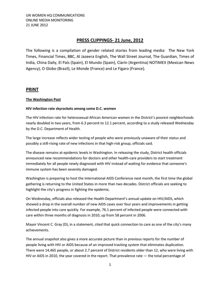 UN WOMEN HQ COMMUNICATIONS ONLINE MEDIA MONITORING 21 JUNE 2012 PRESS CLIPPINGS- 21 June, 2012 The following is a compilation of gender related stories from leading media: The New York Times, Financial Times, BBC, Al Jazeera English, The Wall Street Journal, The Guardian, Times of India, China Daily, El País (Spain), El Mundo (Spain), Clarín (Argentina) NOTIMEX (Mexican News Agency), O Globo (Brazil), Le Monde (France) and Le Figaro (France). PRINT The Washington Post HIV infection rate skyrockets among some D.C. women The HIV infection rate for heterosexual African American women in the District’s poorest neighborhoods nearly doubled in two years, from 6.3 percent to 12.1 percent, according to a study released Wednesday by the D.C. Department of Health. The large increase reflects wider testing of people who were previously unaware of their status and possibly a still-rising rate of new infections in that high-risk group, officials said. The disease remains at epidemic levels in Washington. In releasing the study, District health officials announced new recommendations for doctors and other health-care providers to start treatment immediately for all people newly diagnosed with HIV instead of waiting for evidence that someone’s immune system has been severely damaged. Washington is preparing to host the International AIDS Conference next month, the first time the global gathering is returning to the United States in more than two decades. District officials are seeking to highlight the city’s progress in fighting the epidemic. On Wednesday, officials also released the Health Department’s annual update on HIV/AIDS, which showed a drop in the overall number of new AIDS cases over four years and improvements in getting infected people into care quickly. For example, 76.1 percent of infected people were connected with care within three months of diagnosis in 2010, up from 58 percent in 2006. Mayor Vincent C. Gray (D), in a statement, cited that quick connection to care as one of the city’s many achievements. The annual snapshot also gives a more accurate picture than in previous reports for the number of people living with HIV or AIDS because of an improved tracking system that eliminates duplication. There were 14,465 people, or about 2.7 percent of District residents older than 12, who were living with HIV or AIDS in 2010, the year covered in the report. That prevalence rate — the total percentage of 1 UN WOMEN HQ COMMUNICATIONS ONLINE MEDIA MONITORING 21 JUNE 2012 people in a population with the condition or disease at a given time — is among the highest for any U.S. city. More troubling were the data about infection rates of heterosexuals living in HIV-prevalent, low-income parts of the District, predominantly wards 7 and 8. The District is one of 21 cities in an ongoing survey funded by the U.S. Centers for Disease Control and Prevention of behavior in three target populations: heterosexuals at high risk of HIV infection, men who have sex with men and injection drug users. In 2008, the survey sampled 750 heterosexuals in areas with high infection rates and poverty and found an overall infection rate of 5.2 percent among that group and a 6.3 percent infection rate among those at-risk women. By 2010, those rates had climbed to 8 percent and 12.1 percent, respectively. The demographics of the 482-participant study were similar to 2008: nearly all black, 62 percent making less than $10,000 and 37 percent unemployed. The survey interviewed individuals with connections to high-risk social networks. In those social networks, HIV infection is high and chances of getting infected are greater, officials said. Greg Pappas, senior director at the D.C. Health Department, said it was difficult to know whether the increase represents new infections. The sample size is also limited, he said. Nevertheless, he said, “We continue to have a very serious heterosexual epidemic.” Unlike other cities where the at-risk population might be concentrated among intravenous drug users or men who have sex with men, Washington has a very “mixed epidemic,” with a huge burden falling on heterosexual African Americans. Officials said 90 percent of all women with HIV are black. Pappas estimated that 20 percent to 30 percent of the District’s HIV-positive population “is probably walking around infected and don’t know it,” he said. Other experts said the findings of the study were worrying. “While recognizing the limitations of a sample-based study, it seems the HIV epidemic among heterosexuals may be more significant than the previous study estimated,” said Michael Rhein, senior vice president at the Institute for Public Health Innovation, a nonprofit group that coordinates several regional programs supporting people with HIV/AIDS. He called the new rates alarming. In the worst scenario, he said, they reflect “a true increase in the HIV rate among heterosexuals and women living in areas of concentrated poverty.” http://www.washingtonpost.com/national/health-science/in-dc-hiv-infection-rate-nearly-doubles-forsome-poor-black-women/2012/06/20/gJQAXIqKrV_story.html 2 UN WOMEN HQ COMMUNICATIONS ONLINE MEDIA MONITORING 21 JUNE 2012 SPANISH Hambre de anticonceptivos en los países en desarrollo Aquí, en los países ricos, cuesta imaginarse las relaciones sexuales como una lotería. Pero en el mundo emergente, sin disponibilidad de métodos anticonceptivos modernos y eficaces, para muchas mujeres, lo son. Un informe elaborado por el Instituto Guttmacher y el UNFPA (el Fondo de Naciones Unidas para la Población) indica que 222 millones de mujeres en edad fértil no tienen acceso a una planificación familiar adecuada. "El deseo de formar familias más pequeñas está creciendo en muchas partes del mundo. Sin embargo, muchas mujeres aún no pueden tener el número de hijos que quieren cuando ellas quieren", ha explicado Sharon Camp, presidenta del Instituto Guttmacher, una organización est