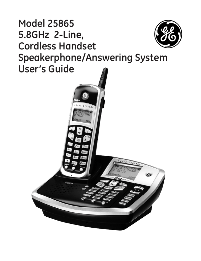 Model 25865 5.8GHz 2-Line, Cordless Handset Speakerphone/Answering System User’s Guide Important Information NOTICE: This product meets the applicable Industry Canada technical specifications. The equipment must be installed using an acceptable method of connection. The customer should be aware that compliance with the above conditions may not prevent degradation of service in some situations. Repairs to certified equipment should be made by an authorized Canadian maintenance facility designated by the supplier. Any repairs or alterations made by the user to this equipment, or equipment malfunctions, may give the telecommunications company cause to request the user to disconnect the equipment. Users should ensure for their own protection that the electrical ground connections of the power utility, telephone lines and internal metallic water pipe systems, if present, are connected together. This precaution may be particularly important in rural areas. CAUTION: Users should not attempt to make such connections themselves, but should contact the appropriate electric inspection authority, or electrician, as appropriate. NOTES: This equipment may not be used on coin service provided by the telephone company. Interference Information This equipment generates and uses radio frequency energy which may interfere with residential radio and television reception if not properly installed and used in accordance with instructions contained in this manual. Reasonable protection against such interference is ensured, although there is no guarantee this will not occur in a given installation. If interference is suspected and verified by switching this equipment on and off, the user is encouraged to try to correct the interference by one or more of the following measures: Reorient the radio/television receiver’s antenna, relocate the equipment with respect to the receiver, plug the equipment and receiver into separate circuit outlets. The user may also wish to consult a qualified radio/television technician for additional suggestions. This equipment has been fully tested and complies with all limits for Class B computing devices pursuant to part 15 FCC Rules and Regulations. This device complies with RSS-210 of Industry Canada. The term “IC:” before the radio certification number only signifies that Industry Canada Technical specifications were met. Operation is subject to the following two conditions: (1) This device may not cause interference, and (2) This device must accept any interference, including interference that may cause undesired operation of the device. Telephone Network Information Should your equipment cause trouble on your line which may harm the telephone network, the telephone company, where practicable, may notify you that temporary discontinuance of service may be required. Where prior notice is not practicable and the circumstances warrant such action, the telephone company may temporarily discontinue service immediately. The telephone company may make changes in its communications facilities, equipment, operations or procedures where such action is required in the operation of its business. If these changes are expected to affect the use or performance of your telephone equipment, the telephone company will likely give you adequate notice to allow you to maintain uninterrupted service. Notice must be given to the telephone company upon termination of your telephone from your line. REN Number On the bottom of this equipment is a label indicating, among other information, the Ringer Equivalence Number (REN) for the equipment. The REN is useful in determining the number of devices you may connect to your telephone line and still have all of these devices ring when your telephone number is called. In most (but not all) areas, the sum of the RENs of all devices connected to one line should not exceed 5. To be certain of the number of devices you may connect to your line as determined by the REN, you should contact your local telephone company. REN Number is located on the cabinet bottom. Licensing Licensed under US Patent 6,427,009. Hearing Aid Compatibility (HAC) This telephone system meets FCC/Industry Canada standards for Hearing Aid Compatibility. FCC RF Radiation Exposure Statement This equipment complies with FCC RF radiation exposure limits set forth for an uncontrolled environment. This equipment should be installed and operated with a minimum distance of 20 centimeters between the radiator and your body. This transmitter must not be co-located or operated in conjunction with any other antenna or transmitter. For body worn operation, this phone has been tested and meets the FCC RF exposure guidelines when used with the belt clip supplied with this product. Use of other accessories may not ensure compliance with FCC RF exposure guidelines. Table of Contents Important Information...........................................2 Interference Information......................................2 Telephone Network Information.........................3 RENNumber...........................................................3 Licensing..................................................................3 Hearing Aid Compatibility (HAC).........................3 FCC RF Radiation Exposure Statement. ............3 Introduction............................................................6 Before You Begin...................................................6 Parts Checklist..................................................6 Telephone Jack Requirements.........................6 Installation..............................................................7 Digital Security System....................................7 Important Installation Guidelines..................7 Handset Layout......................................................8 Base Layout.............................................................9 Installing the Phone........................................... 10 Installing the Handset Battery..