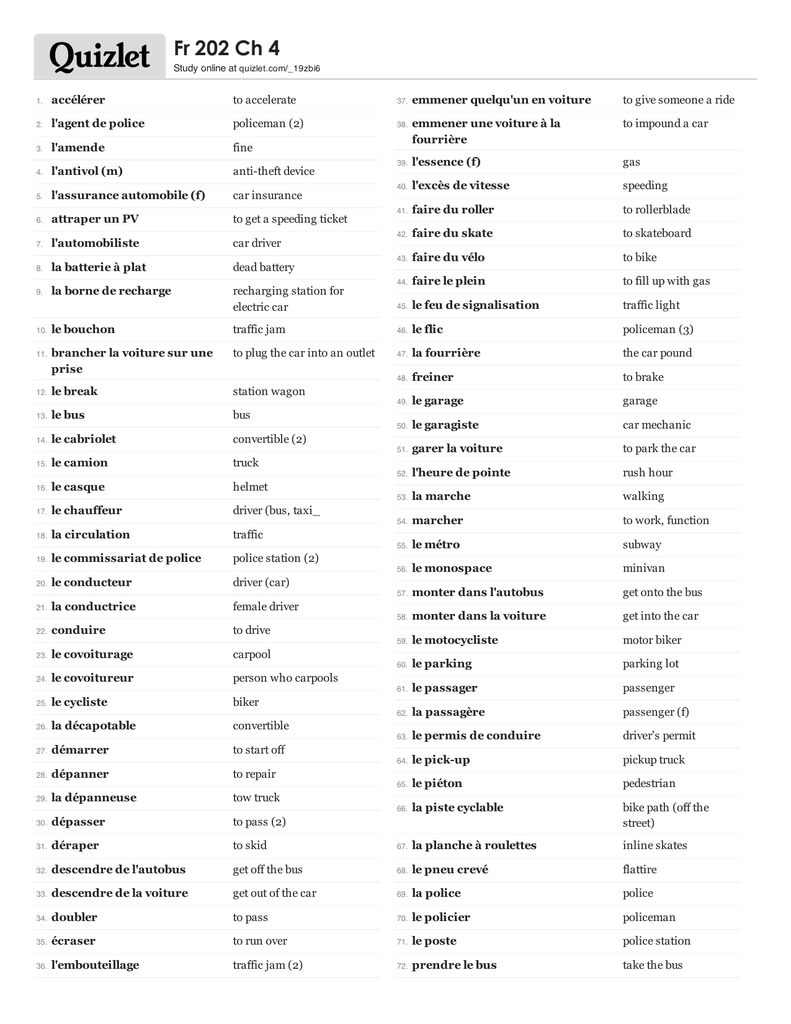 Fr 202 Ch 4 Study online at quizlet.com/_19zbi6 1. accélérer to accelerate 37. emmener quelqu'un en voiture to give someone a ride 2. l'agent de police policeman (2) 38. emmener une voiture à la fourrière to impound a car 3. l'amende fine 4. l'antivol (m) anti-theft device 39. l'essence (f) gas 5. l'assurance automobile (f) car insurance 40. l'excès de vitesse speeding 6. attraper un PV to get a speeding ticket 41. faire du roller to rollerblade 7. l'automobiliste car driver 42. faire du skate to skateboard 8. la batterie à plat dead battery 43. faire du vélo to bike 9. la borne de recharge recharging station for electric car 44. faire le plein to fill up with gas 45. le feu de signalisation traffic light le bouchon traffic jam 46. le flic policeman (3) brancher la voiture sur une prise to plug the car into an outlet 47. la fourrière the car pound 48. freiner to brake 12. le break station wagon 49. le garage garage 13. le bus bus 50. le garagiste car mechanic 14. le cabriolet convertible (2) 51. garer la voiture to park the car 15. le camion truck 52. l'heure de pointe rush hour 16. le casque helmet 53. la marche walking 17. le chauffeur driver (bus, taxi_ 54. marcher to work, function 18. la circulation traffic 55. le métro subway 19. le commissariat de police police station (2) 56. le monospace minivan 20. le conducteur driver (car) 57. monter dans l'autobus get onto the bus 21. la conductrice female driver 58. monter dans la voiture get into the car 22. conduire to drive 59. le motocycliste motor biker 23. le covoiturage carpool 60. le parking parking lot 24. le covoitureur person who carpools 61. le passager passenger 25. le cycliste biker 62. la passagère passenger (f) 26. la décapotable convertible 63. le permis de conduire driver's permit 27. démarrer to start off 64. le pick-up pickup truck 28. dépanner to repair 65. le piéton pedestrian 29. la dépanneuse tow truck 66. la piste cyclable 30. dépasser to pass (2) bike path (off the street) 31. déraper to skid 67. la planche à roulettes inline skates 32. descendre de l'autobus get off the bus 68. le pneu crevé flattire 33. descendre de la voiture get out of the car 69. la police police 34. doubler to pass 70. le policier policeman 35. écraser to run over 71. le poste police station 36. l'embouteillage traffic jam (2) 72. prendre le bus take the bus 10. 11. 73. prendre le métro to take the metro 108. la voiture neuve new car 74. prendre le train to take the train 109. la vole cyclable bike lane (part of the street) 75. le procès-verbal traffic ticket 110. le voyageur passenger (train, commercial bus) 76. propre green 77. le quatre-quatre 4x4 78. ralentir to slow down 79. remorquer to tow 80. rentrer dans to run into 81. réparer to repair (2) 82. les rollers roller blades 83. le rolleur in-line skater 84. la roue de secours spare tire 85. rouler to go (car, bike, etc.) 86. le scooter scooter le scooter à trois roues the three-wheeled scooter se garer to park se promener en voiture to go for a car ride 90. le skateboard skateboard 91. le skateur skater 92. le stationnement parking 93. stationner to park (2) 94. la station-service service-station 95. sur la chaussée street parking 96. tomber en panne to break down tomber en panne de courant to run out of battery power (for an electric car) tomber en panne d'essence to run out of gas les transports en commun public transportation 100. la trottinette push scooter 101. le vélo bike 102. le vélo tout-terrain mountain bike 103. la vitesse maximum speed limit 104. la voiture car 105. la voiture d'occasion used car 106. la voiture électrique electric car 107. la voiture hybride hybrid car 87. 88. 89. 97. 98. 99.